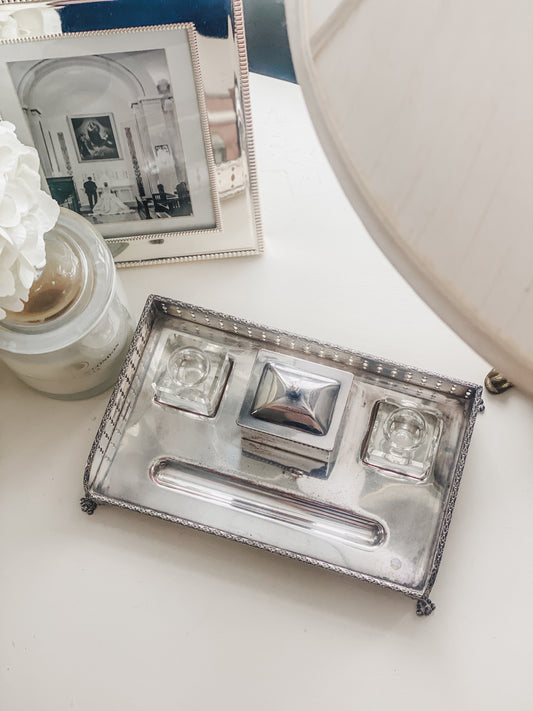 Antique Silver on Copper Desk Inkstand with Double Glass Inkwells & Paw Feet
