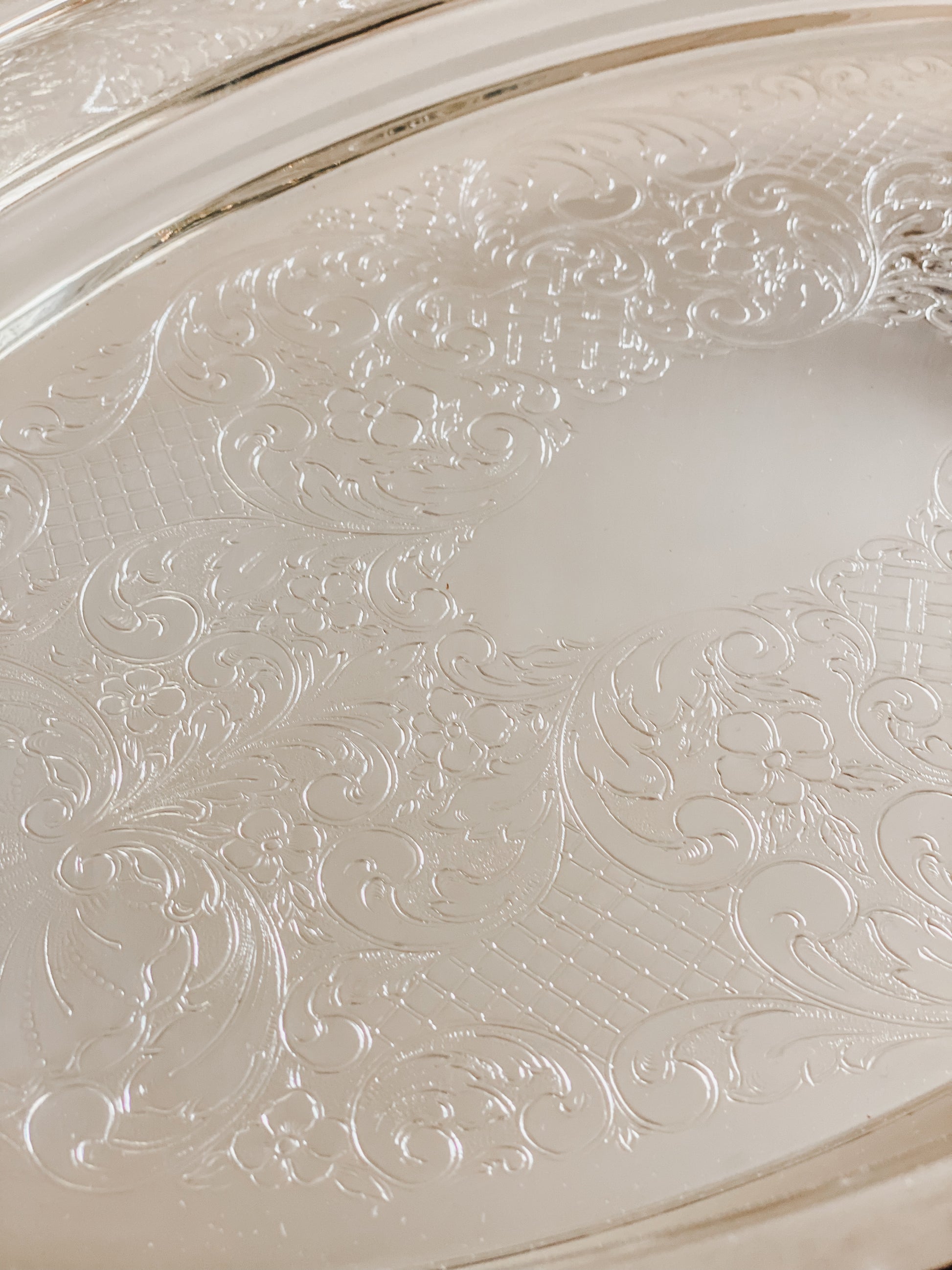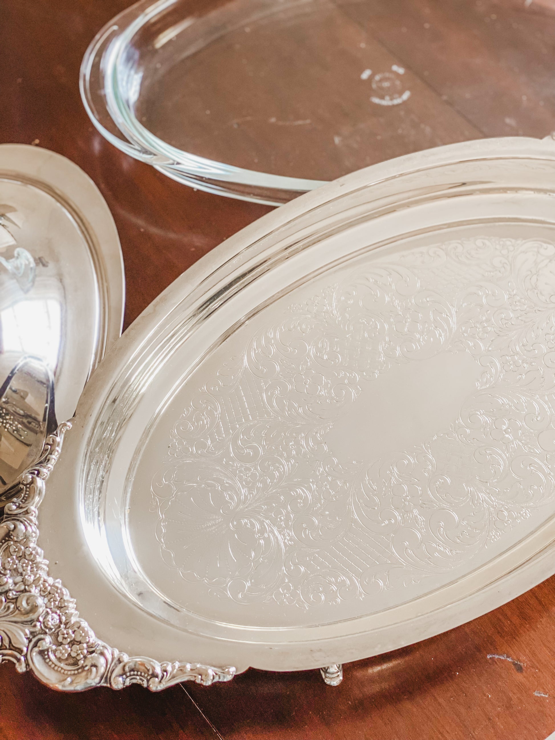 Wow! What a way to serve! This huge domed-lid covered serving dish is something special. The baroque designs on the lid, handles, and even feet make it just so stunning. It even comes with its original glass liner so you can cook your food in the oven and then place it in this dish. A rare-find and a must-have! 23" x 11.25" x 19.5" Silverplate in excellent condition.