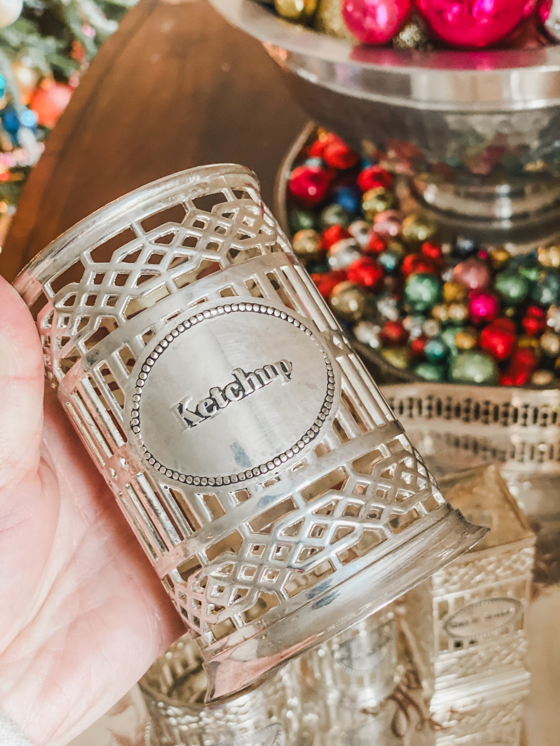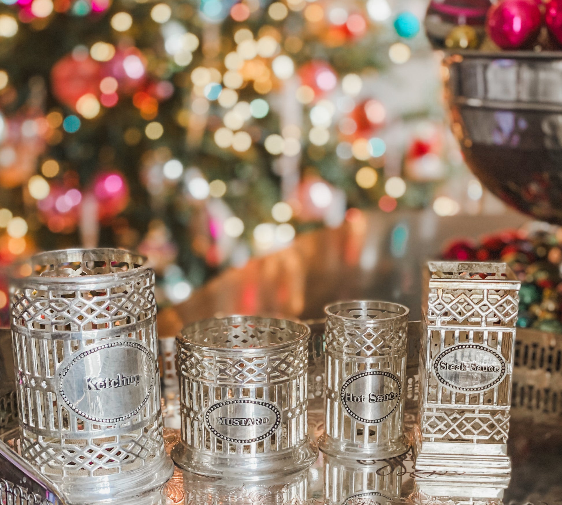 Elevate your table setting with this charming four-piece Godinger condiment set—the most stylish way to serve bottles at your table! Each reticulated silverplate bottle holder features intricate detailing, offering both elegance and functionality. Silverplated; the largest is 4.24" x 3"