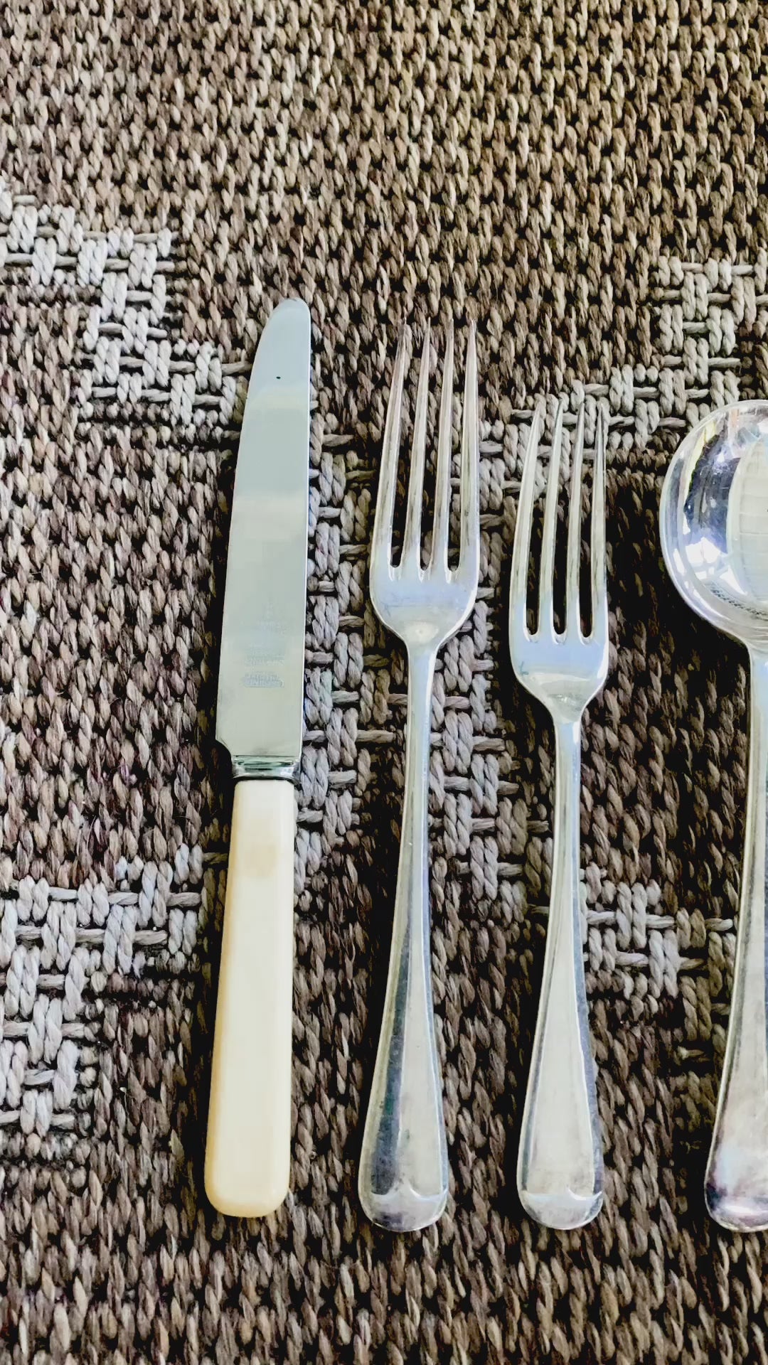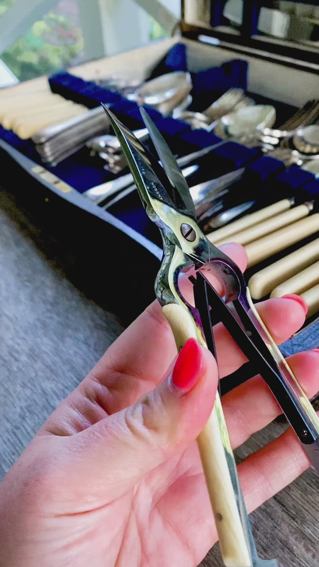 Wonderful! This rare set of James Ryals flatware, made in Sheffield, England, is truly impressive. It’s a comprehensive service for 6, with each setting including an entree fork, dessert fork, spoon, soup spoon, fruit knife, fruit fork, two dinner knives, a salt spoon, and a tea spoon—10 pieces per person! The set also includes two large basting spoons and a cake knife, and a set of kitchen clippers, bringing the total to 64 pieces. The set comes in its original box, which shows a bit of wear on the top. The flatware is made from both silverplate and stainless steel, with handles crafted from an early plastic material. An heirloom set for sure.