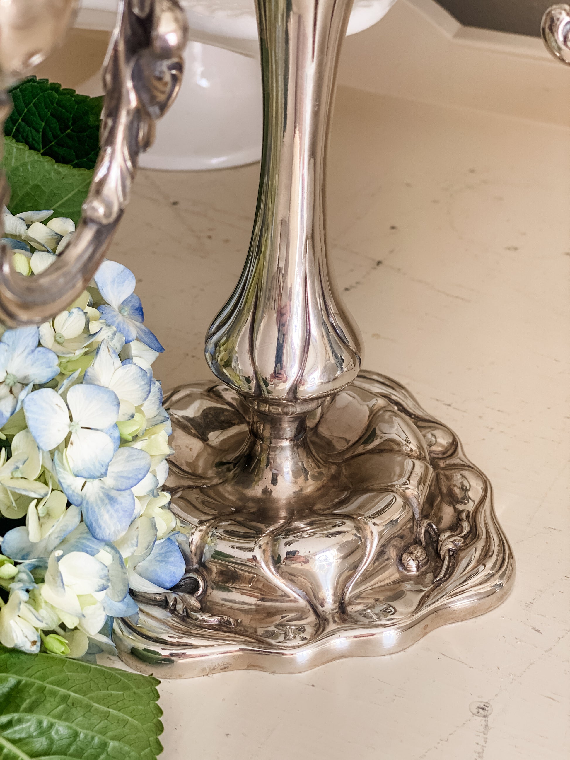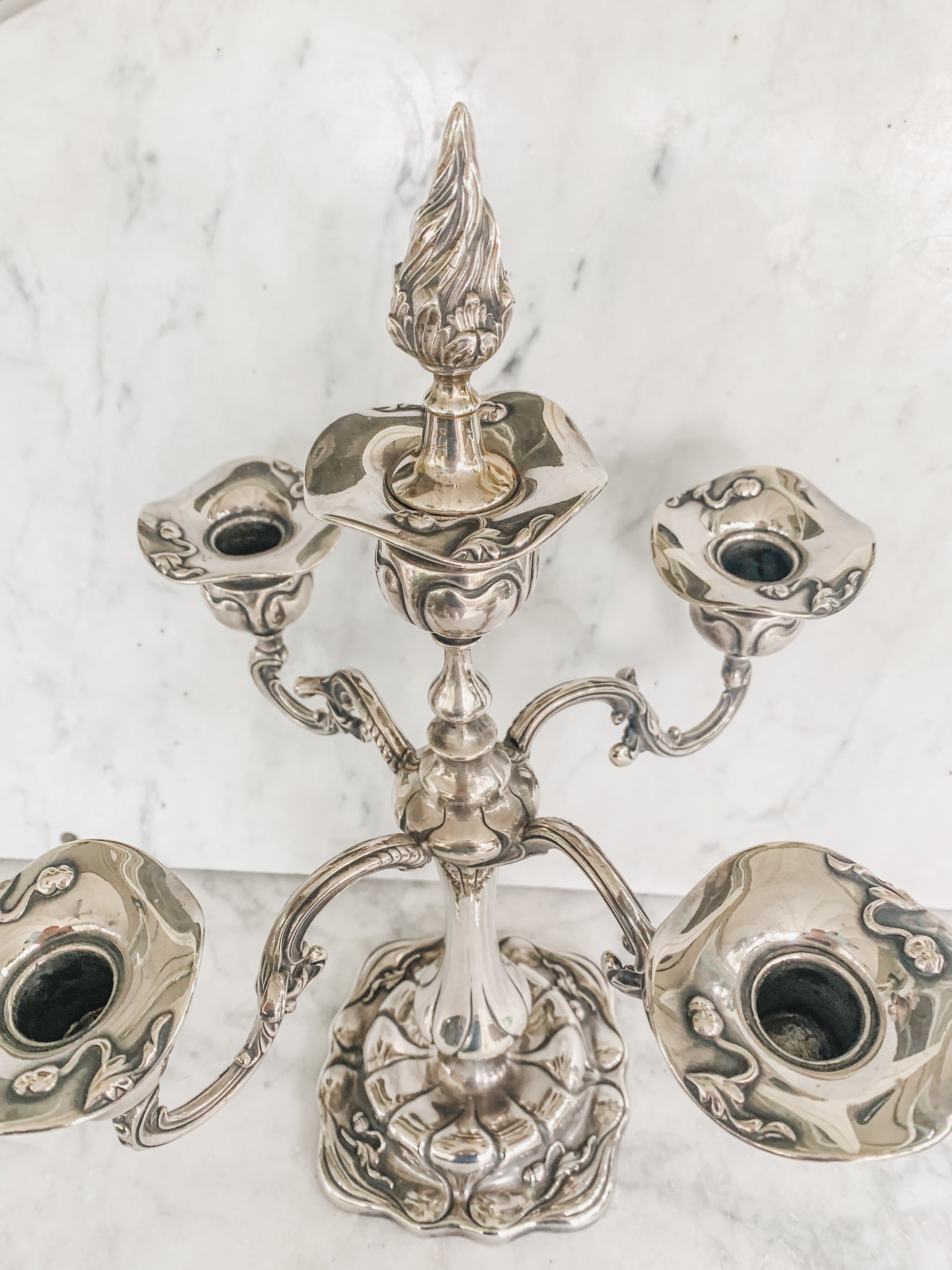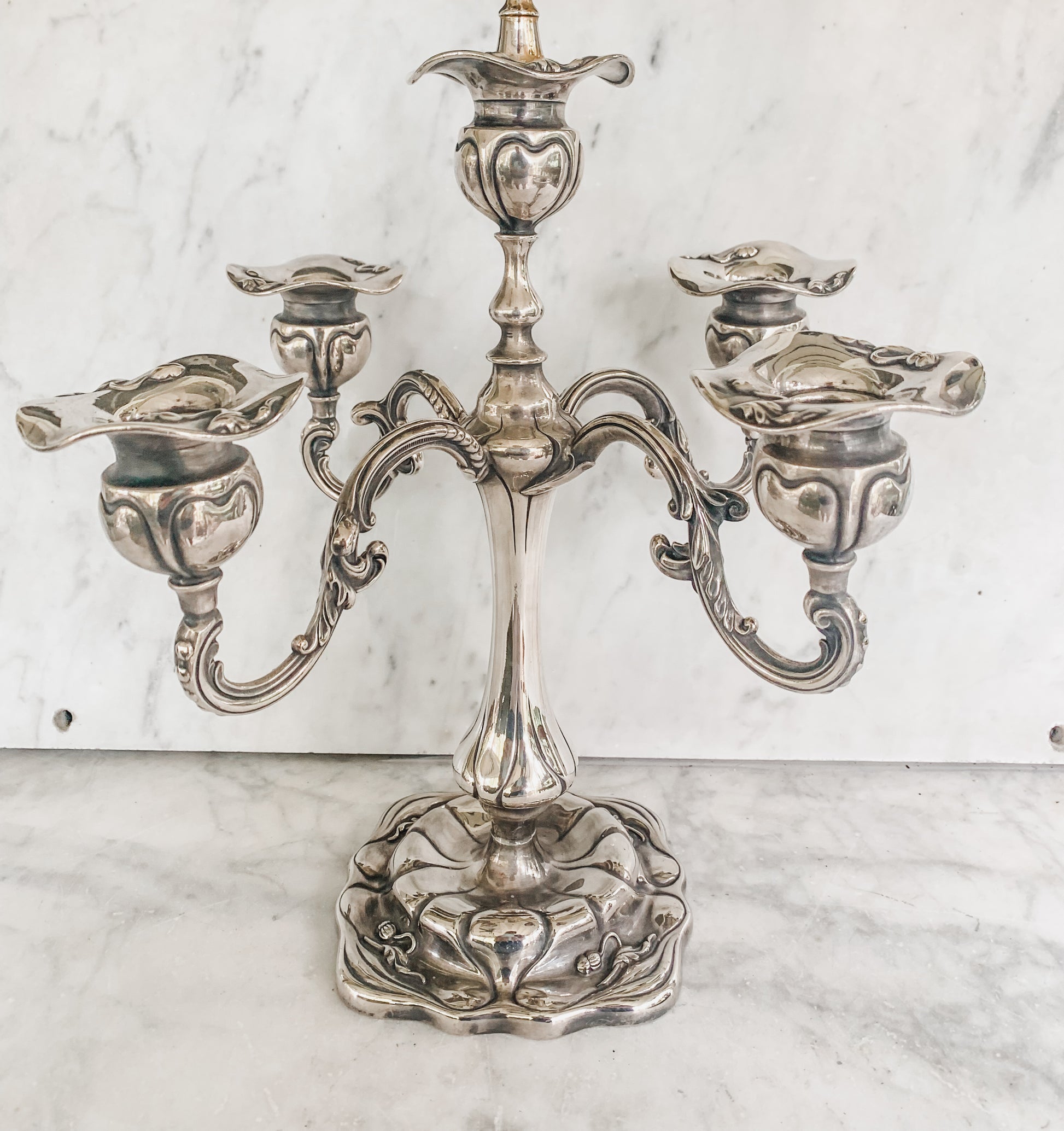 A true victorian candelabra! This four-armed candelabra made for 5 candles is so elegant. It is quadroupleplated which means it was covered in four coats of sterling silver. Words like "quadroupleplate" are great to look for when antique shopping as it is an indication of a victorian-era silverplated piece! It still has its candle-snuffer finial that sits on top. This is very detailed and beautiful one! It is 12" wide x 15" tall. Excellent antique condition. You can see in the photos I used little vases meant just for candlesticks to display flowers. They are not included, but if you message me I can give you the link to buy your own!