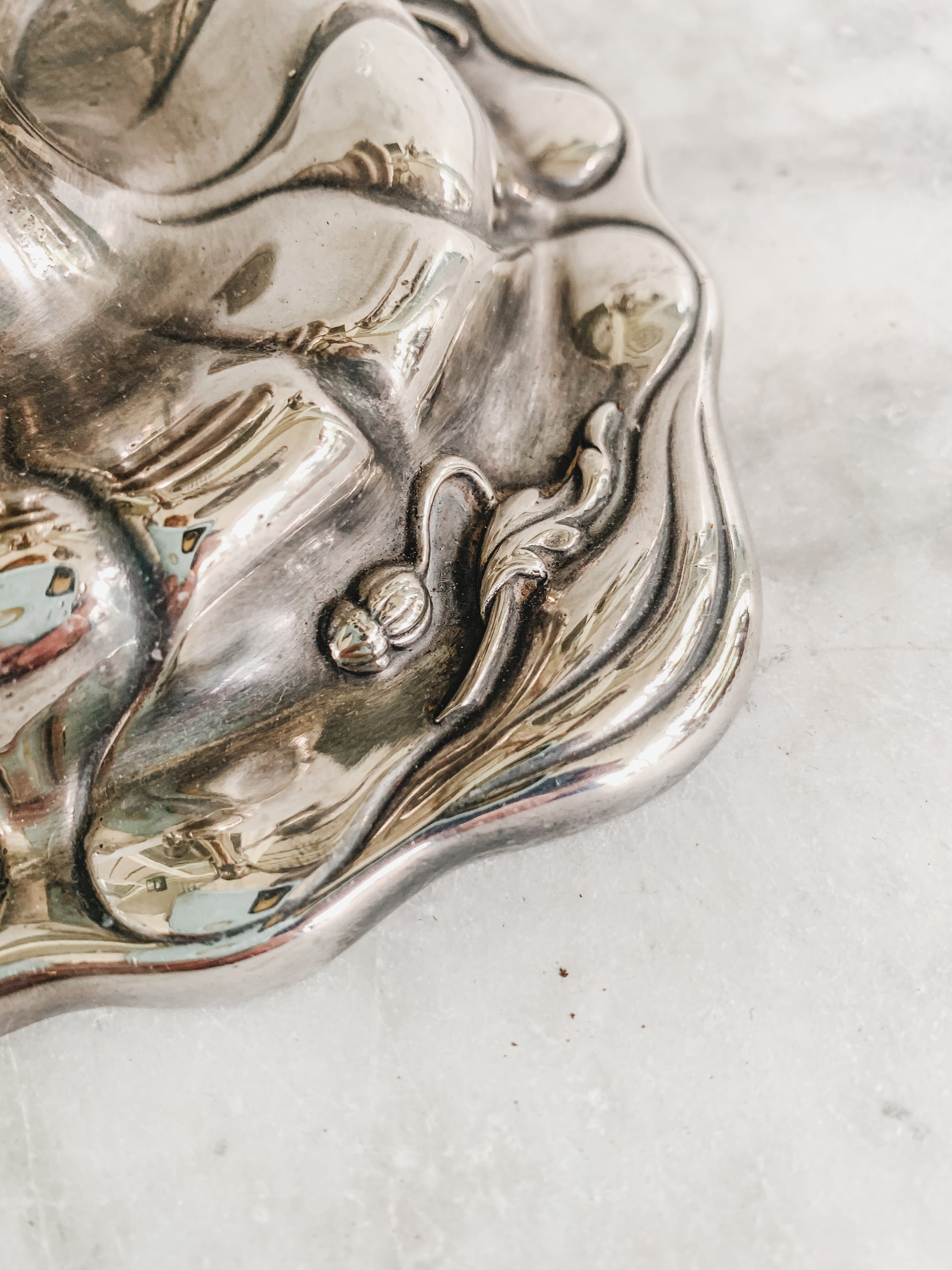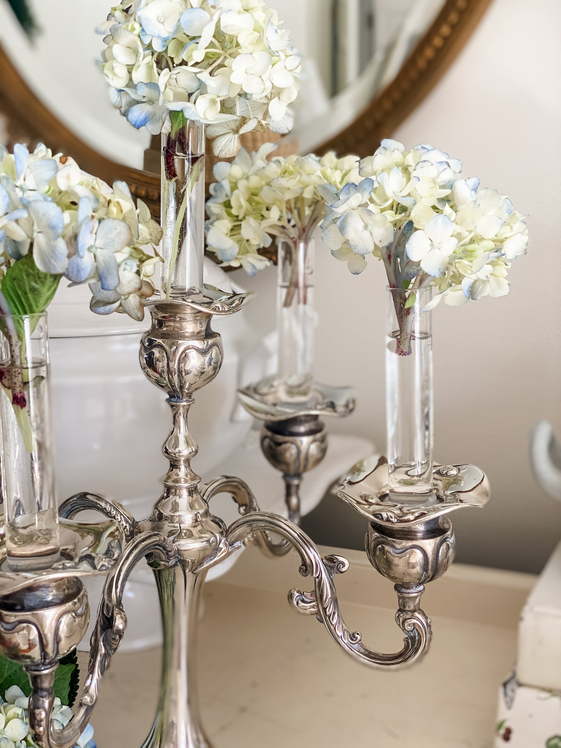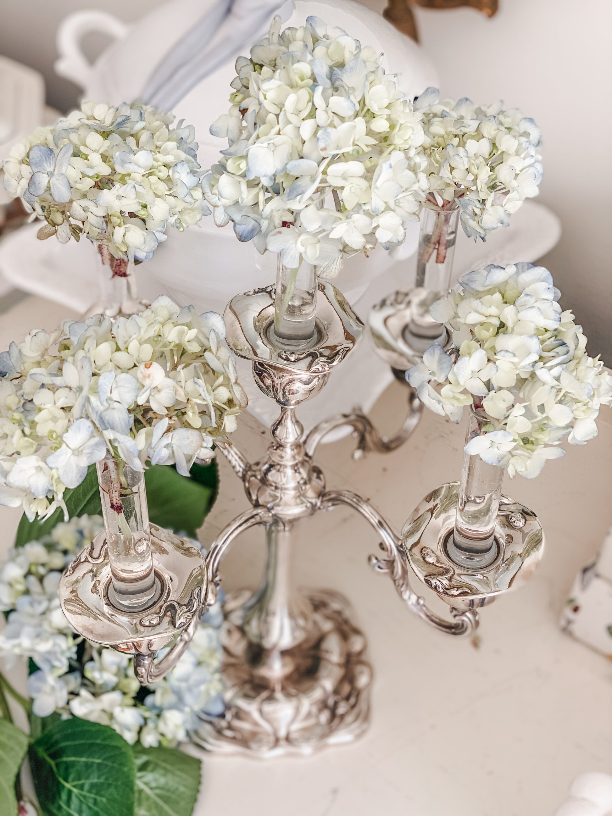A true victorian candelabra! This four-armed candelabra made for 5 candles is so elegant. It is quadroupleplated which means it was covered in four coats of sterling silver. Words like "quadroupleplate" are great to look for when antique shopping as it is an indication of a victorian-era silverplated piece! It still has its candle-snuffer finial that sits on top. This is very detailed and beautiful one! It is 12" wide x 15" tall. Excellent antique condition. You can see in the photos I used little vases meant just for candlesticks to display flowers. They are not included, but if you message me I can give you the link to buy your own!
