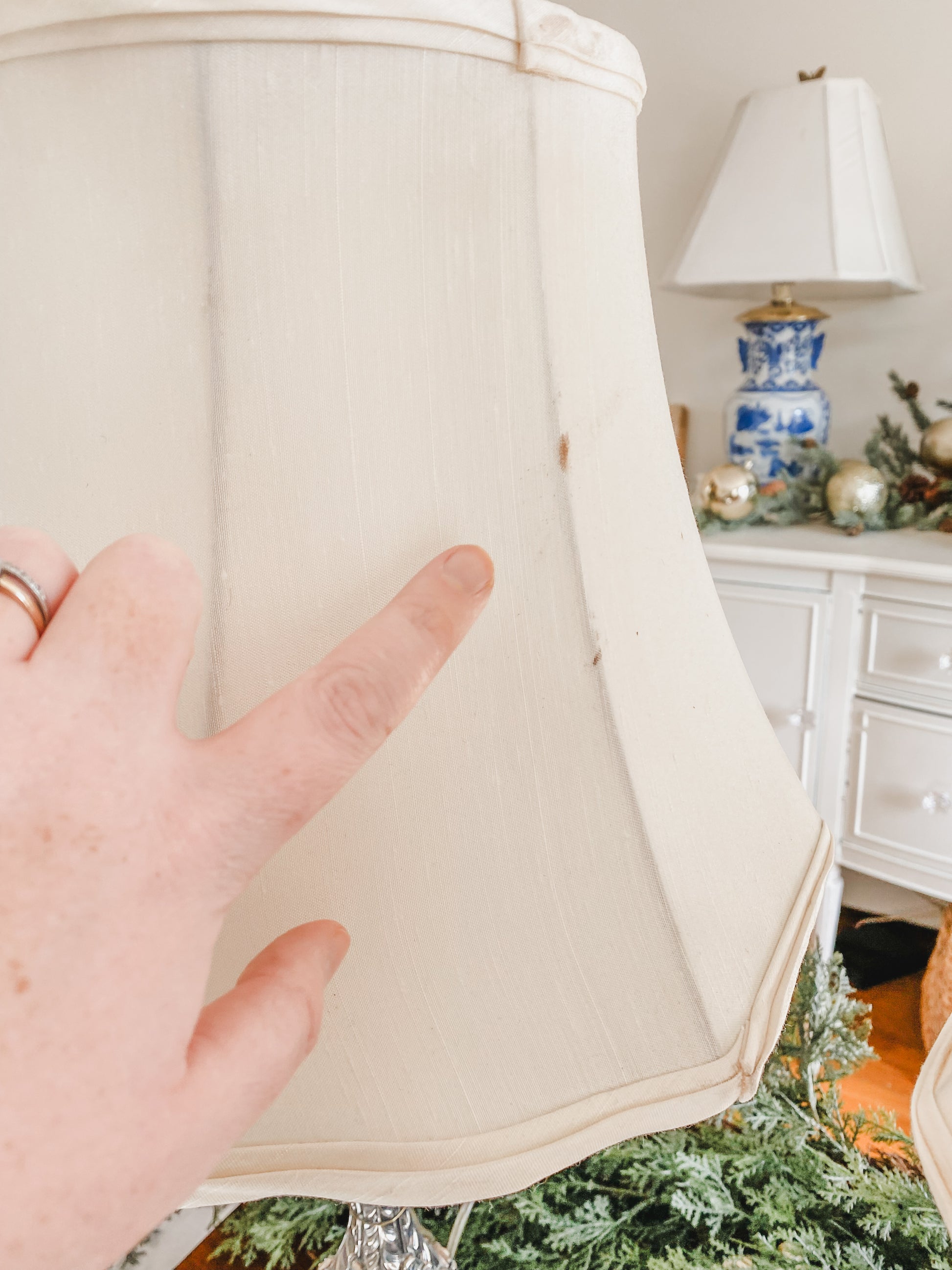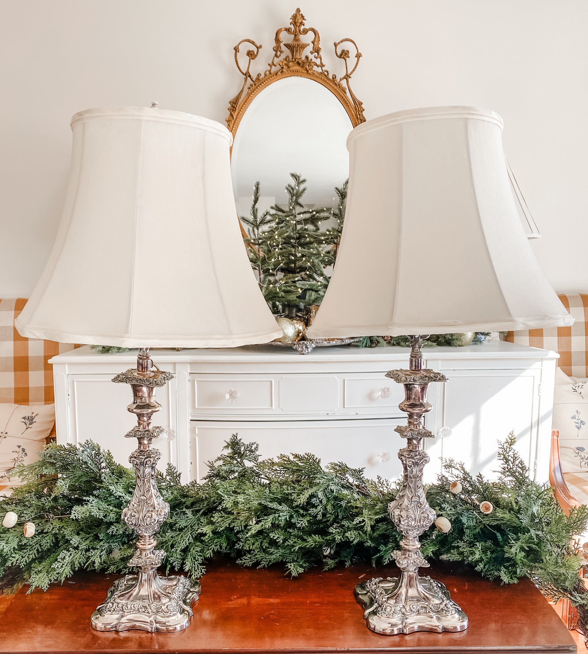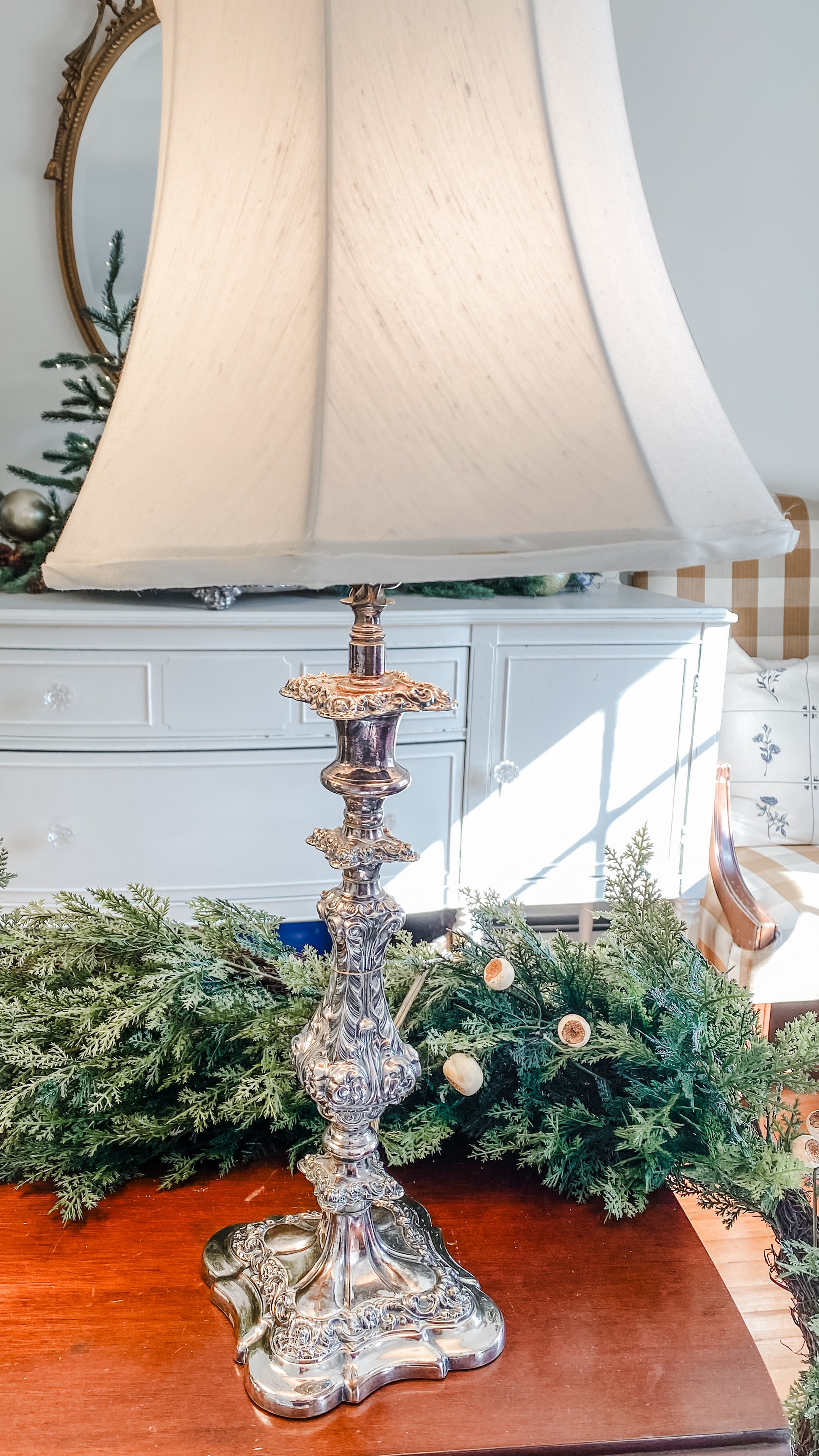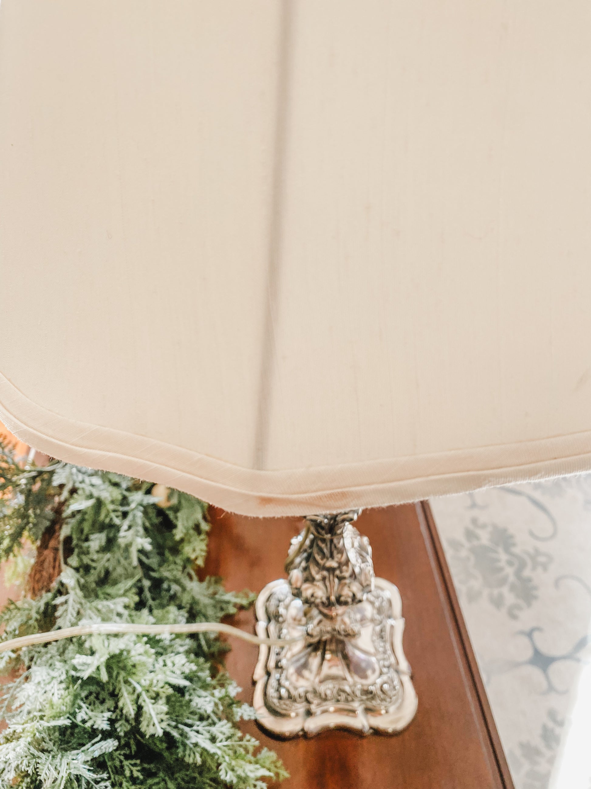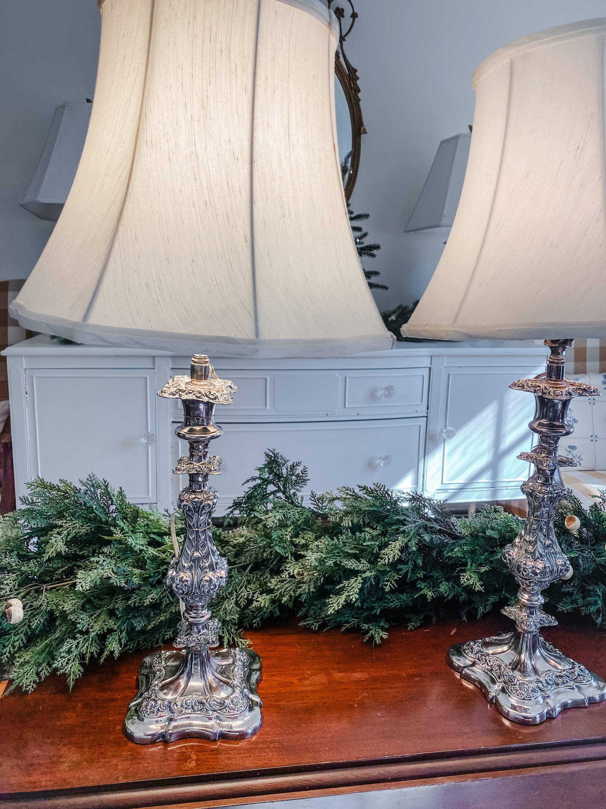 These lamps are incredible. You won't be able to decide where to put them because they look so pretty everywhere! They are antique candlesticks. You will notice all of the beautiful details on these candlesticks immediately from the unique square base to all of the flourishes. I love the detail of the high quality silver on copper. Someone had the amazing idea to turn them into lamps and fitted them for electricty. If you look closely, you'll see the very thin cord snaked down the back. They both come with custom silk shades that are perfectly sized for the lamps. As you can see in the photos, both lamps have been tested and both work. I photographed two very small stains or imperfections on the back of one lamp shade. I am planning on shipping the shades in a separate box from the lamp bases so they can ship as safely as possible, so you will receive these in two separate boxes. 25" tall
