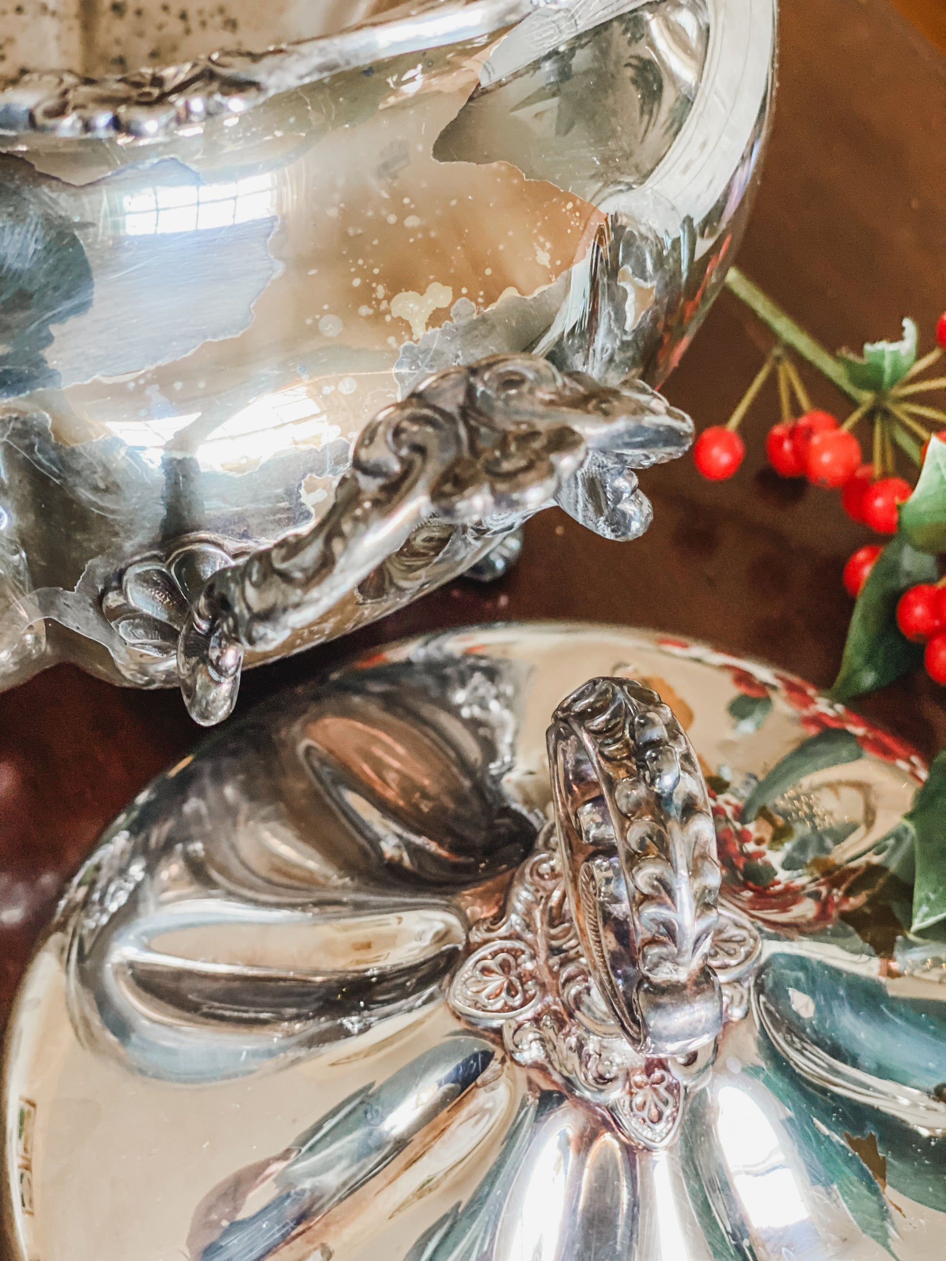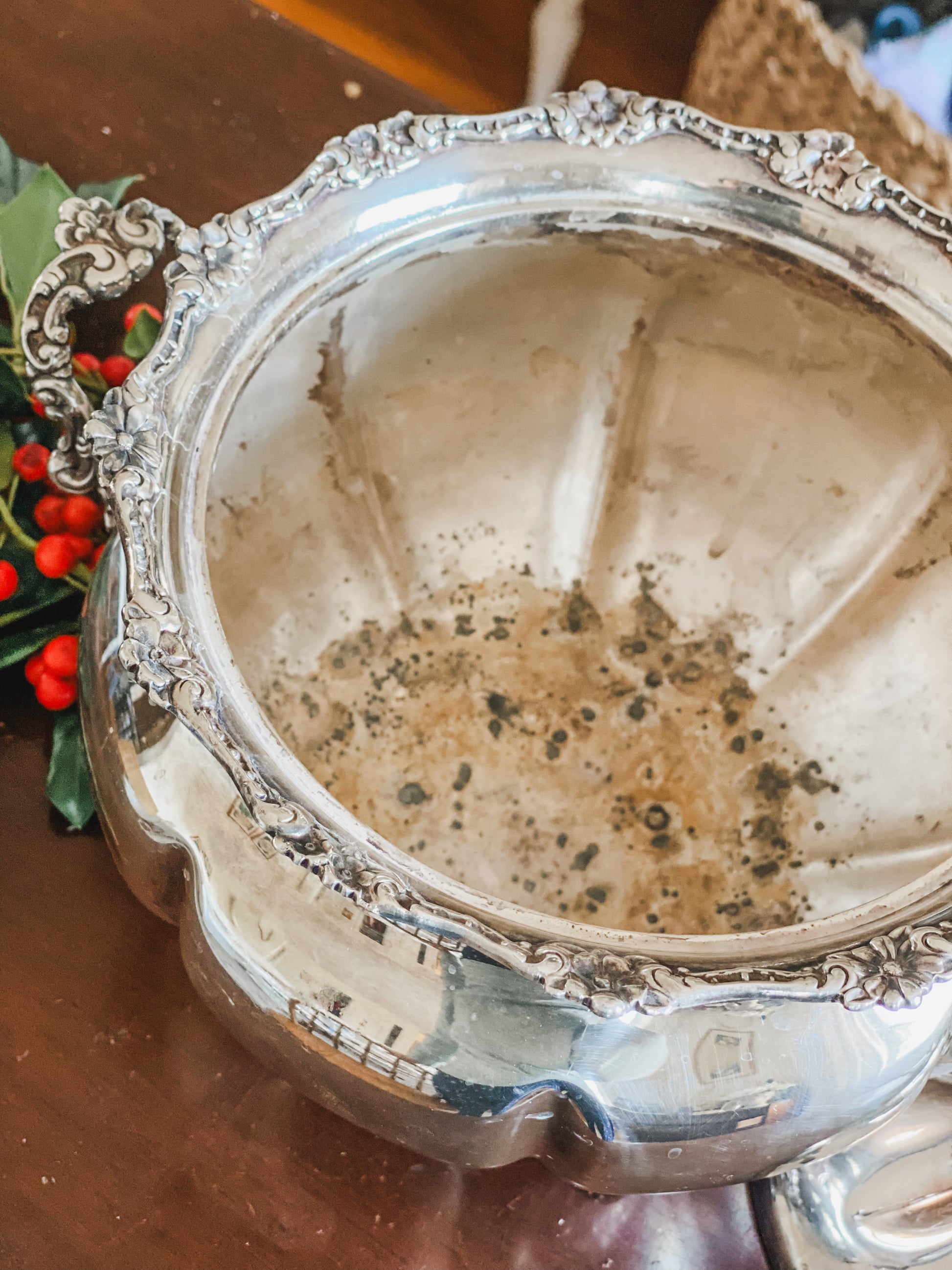 When I saw this Antique covered dish, marked quadroupleplate, I knew this would be the perfect miniature Christmas holder! This sits on four acanthus leave feet and has the the most beautiful little delicate handles. I love how the collar of this dish has all of these alternating flowers circled around. It is 6" t x 10" wide. The opening you could put a miniature Christmas tree in is about 6" wide x 4.5" tall. It is quadroupleplate, an indication it is a victorian piece, and has four coats of sterling on it. Please see the photos as there is wear on the inside as well as some types of discoloration that I was unable to polish out around the outside of the piece. Despite its imperfections, I wanted to include it in the sale because it is so darling for a plant or a little tree.