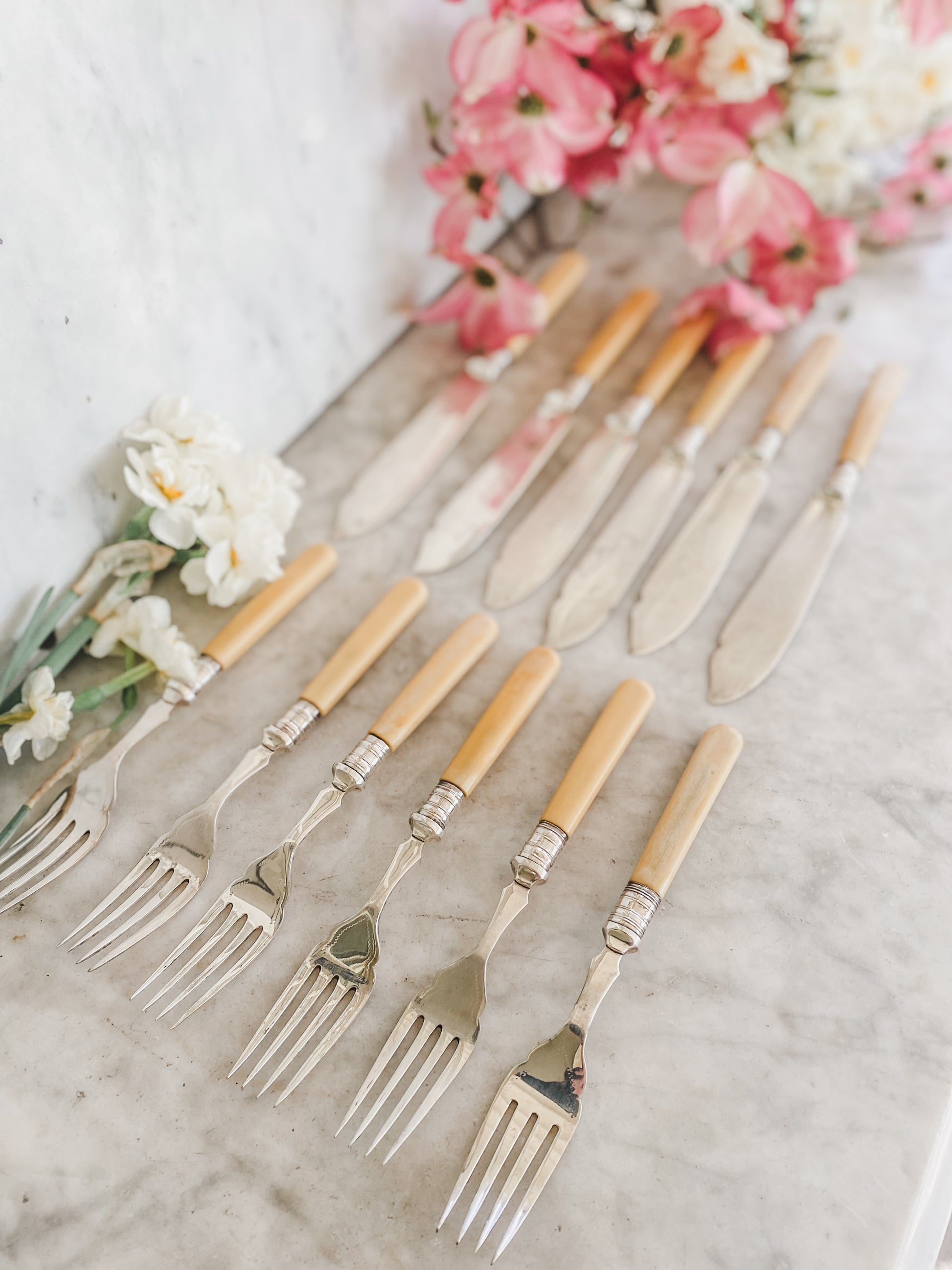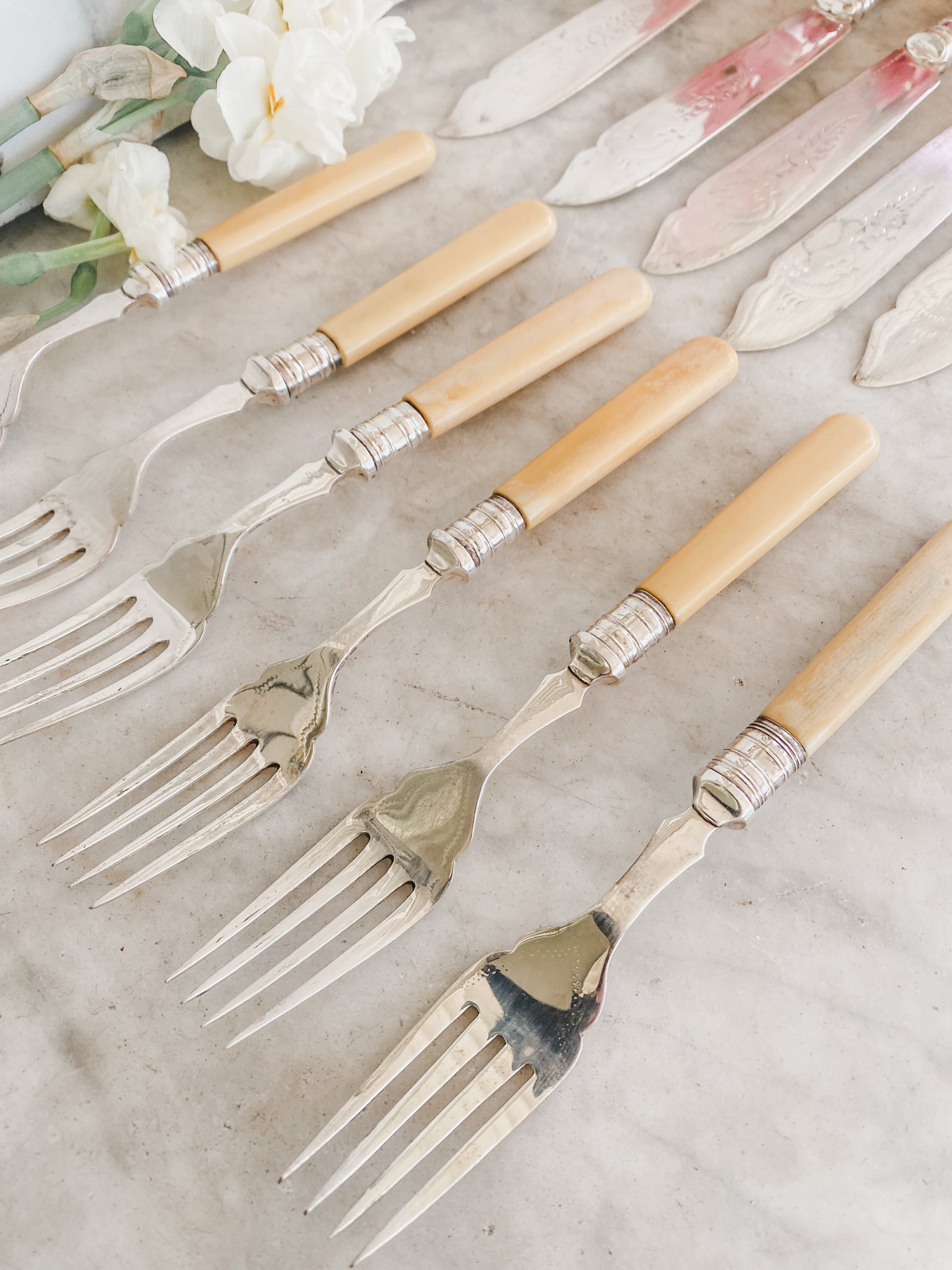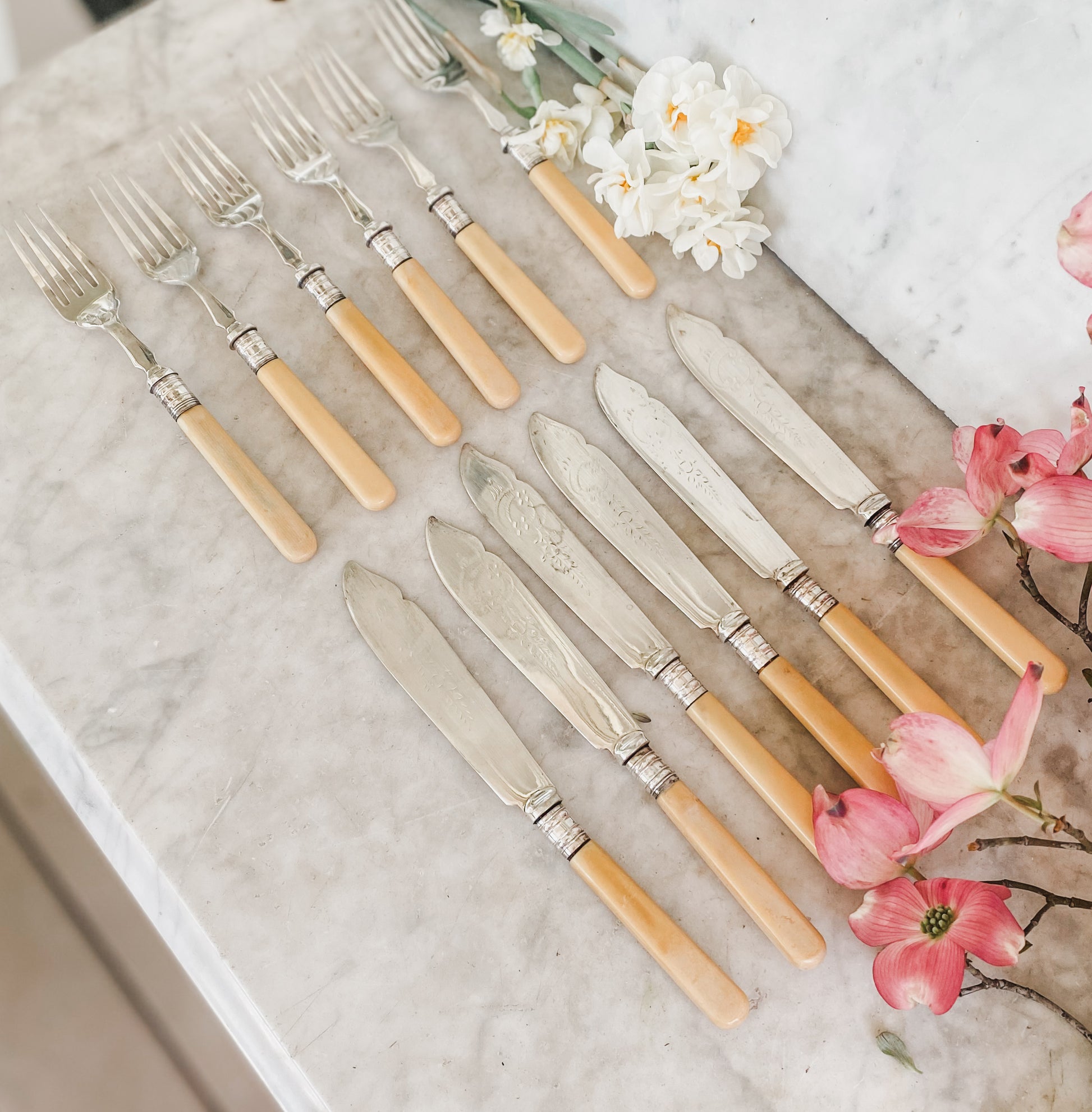 Both the knives and forks are engraved with delicate detailing—just enough to feel special without being too ornate. They’re marked EPNS, which stands for Electroplated Nickel Silver—a common and high-quality silverplating technique used in antique flatware. It means you’re getting that beautiful silver finish over a strong, nickel-based core.