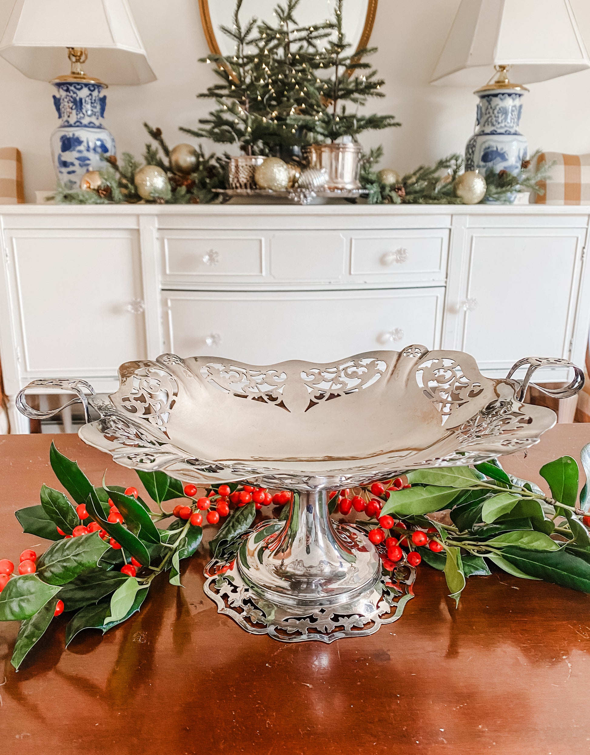 A centerpiece like this is always a must for me, and this one is stunning because of all of its pierced details! This caught my eye immediately, and then I was absolutely delighted because in all four corners are a little circle with a snowflake in the center! This couldn't be more perfect for the season! This stunning pedestal base has fine piercings that resemble a bough encircling the bottom, while the top has two very interesting handles that almost look like little sculptures. 13" wide x 5" tall. Excellent antique condition with a small amount of tarnish to the silverplate.