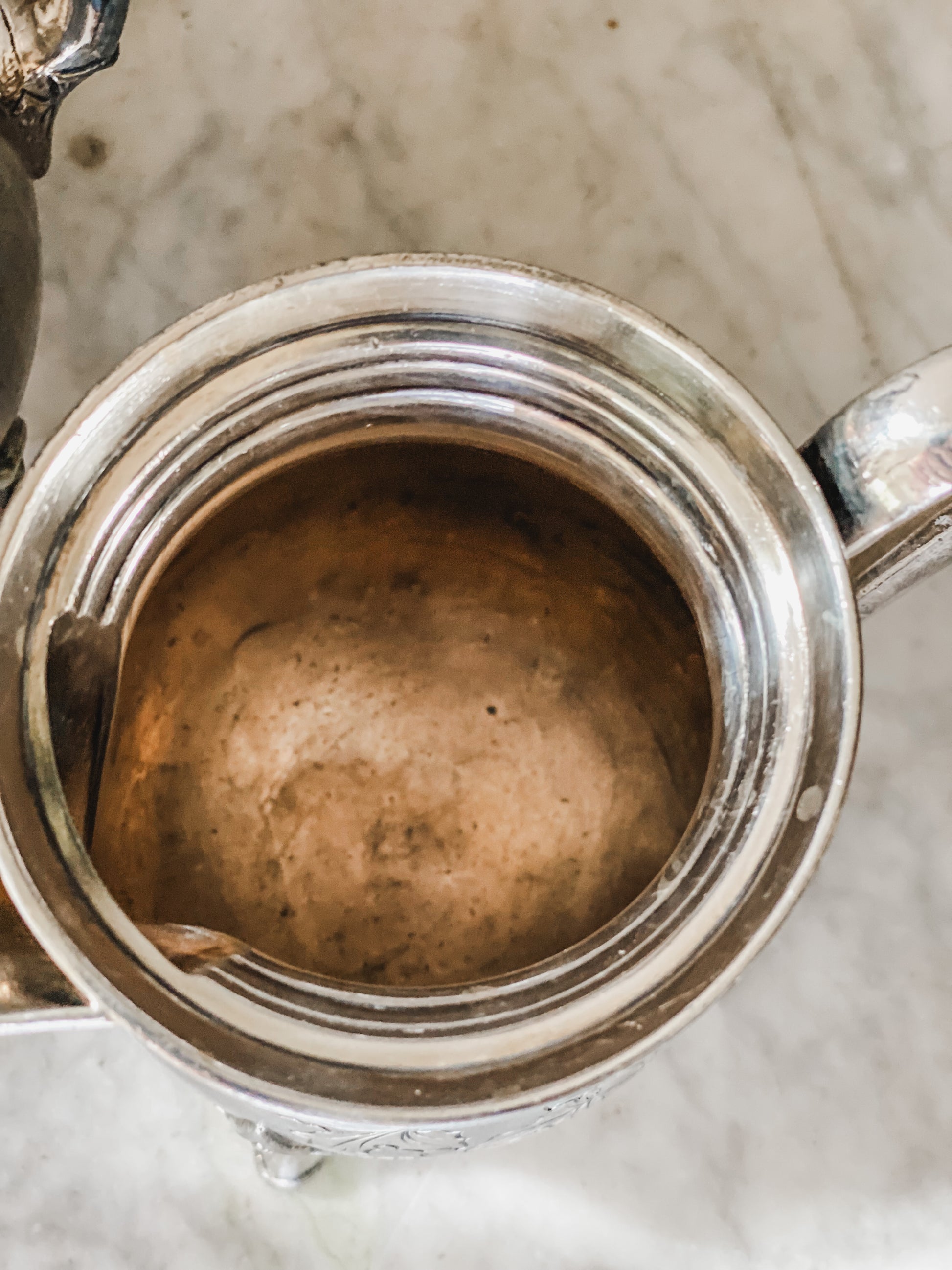 Here is a special antique tea set! It was made in the second half of the 19th century and it has all of the character and beauty you would expect from an antique set. Made by the Middletown Plate Co. it was triple plated which means it was coated in three coats of silver. This set really caught my eye because of the intricate feet and long legs on each piece made from wheat sheaves and the delicate engraving of a vine. Even the handles have the most intricate details! Did you notice the 5th piece this set comes with? It is a waste container for your used lemons or tea bags so they don't remain unsightly on your tea table! The coffee pot is 12" tall and is missing the pin in the lid that connects it to the pot, the tea pot is 10." Due to their age, these have some tarnish and wear spots that remain (see photos).