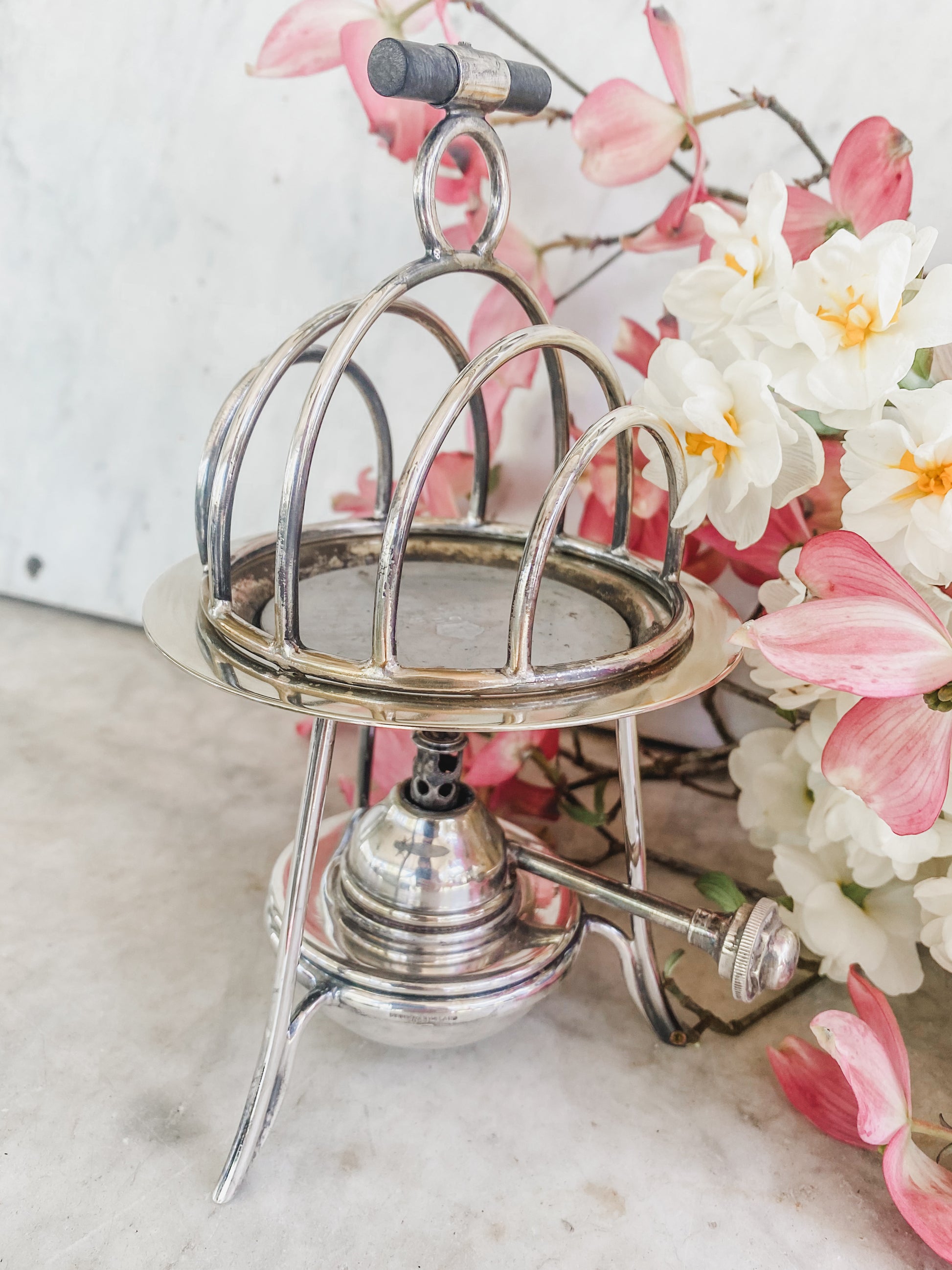 This particular piece is even more exciting because it comes complete with its original spirit burner nestled into the stand, plus the heat base—all still intact. That’s incredibly rare. It was designed to keep toast warm at the table (very proper, very fabulous) and has a unique orbital form with a wooden handle that makes it both functional and beautiful.