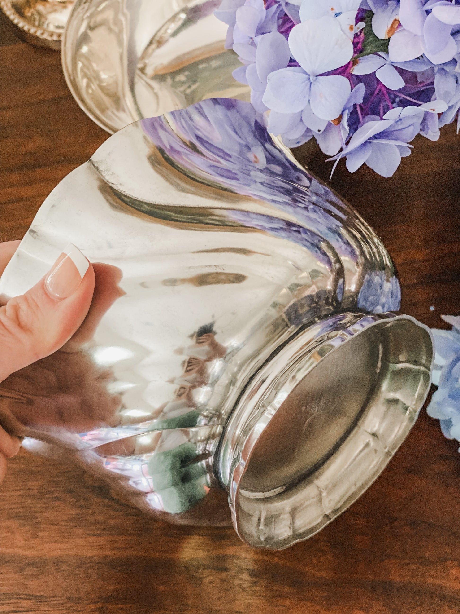 This pretty vintage pewter bowl was made by Kirk Steiff for the Smithsonian Institute. Perfect for dips, small side dishes or anything you want to hold with an added swirl! Very good condition. 6.25" x 3.5"