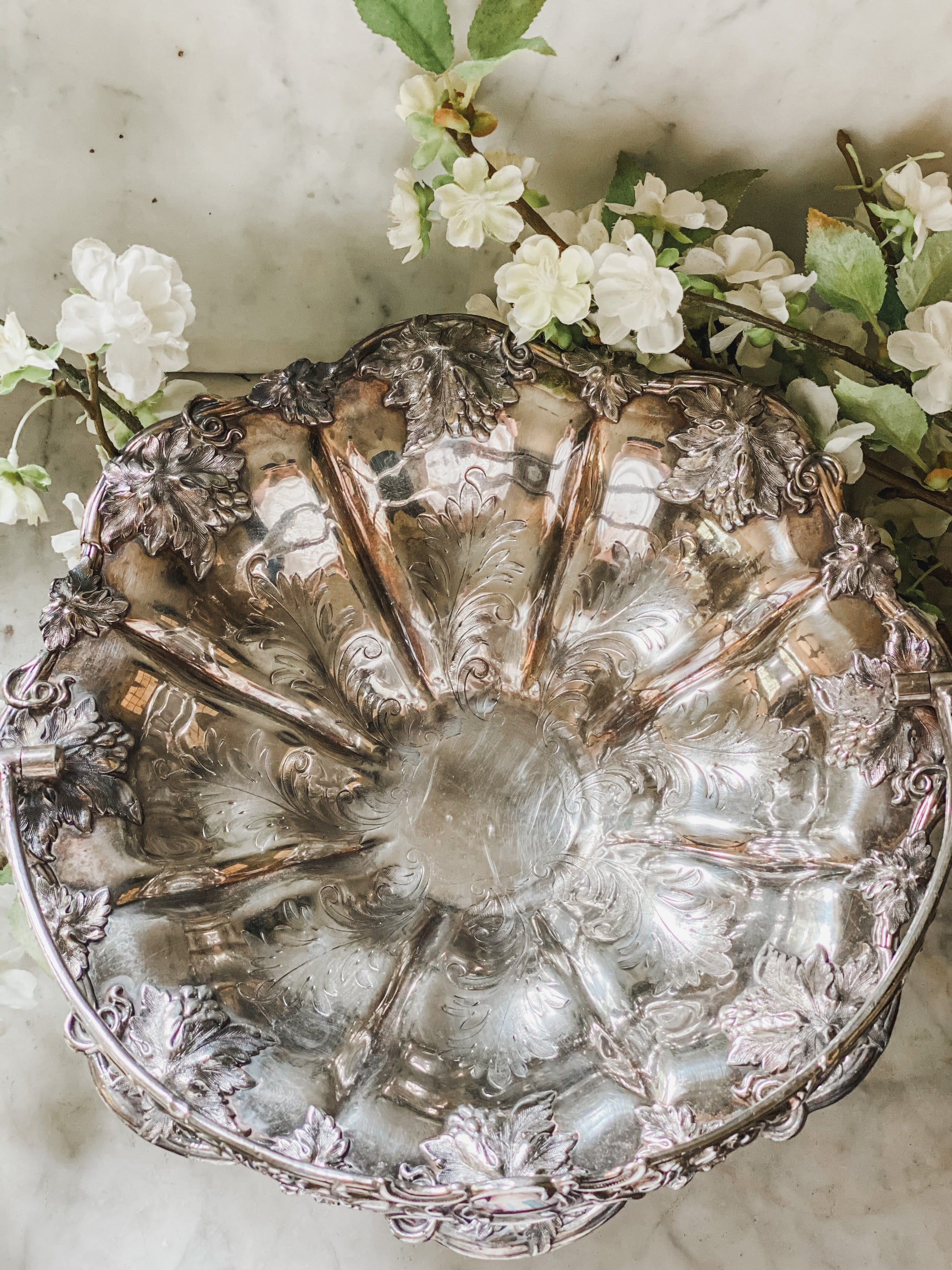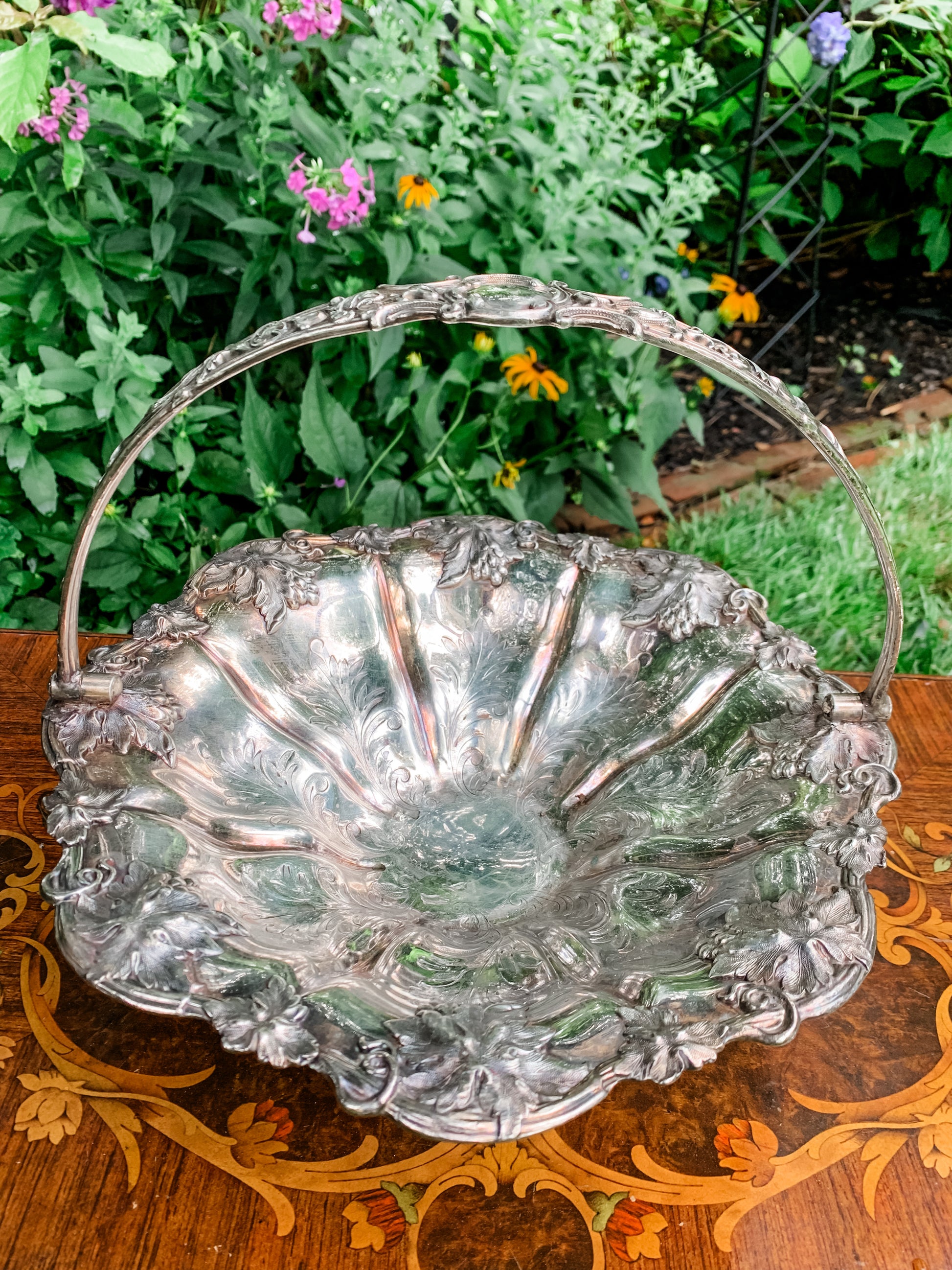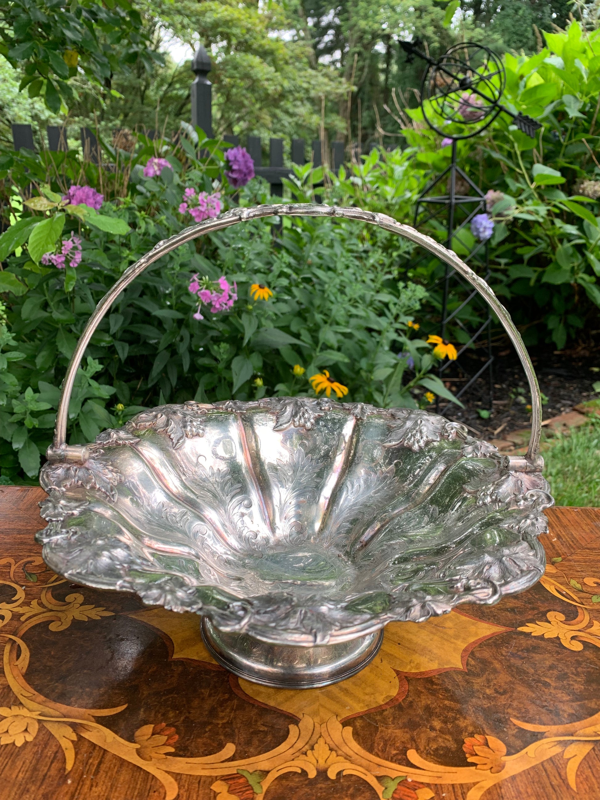 Victorians loved the embellishment of everything but were most known for their fabulous baskets, this one is an amazing example of one of the most beautiful specimens! This very large and heavy silver plated basket with a moveable handle features repousee leaves on the bowl section as well as the bottom. The embellishment continues on the scalloped edges where very large ivy leaves and vines wind their way around the perimeter. The handle is also highly decorated and the whole basket is elevated on a pedestal. Really fabulous and unique! 12.25” w x 12”t