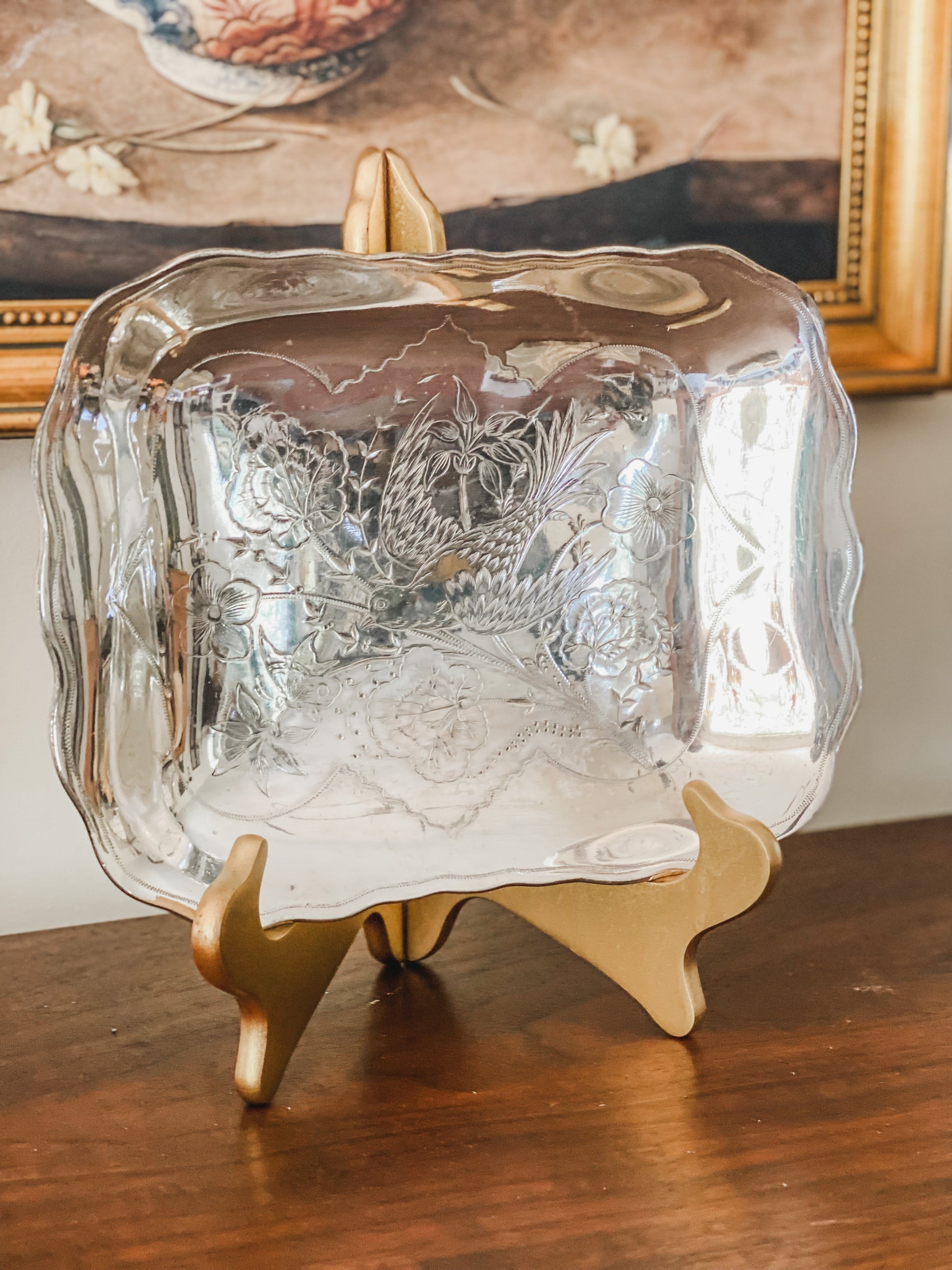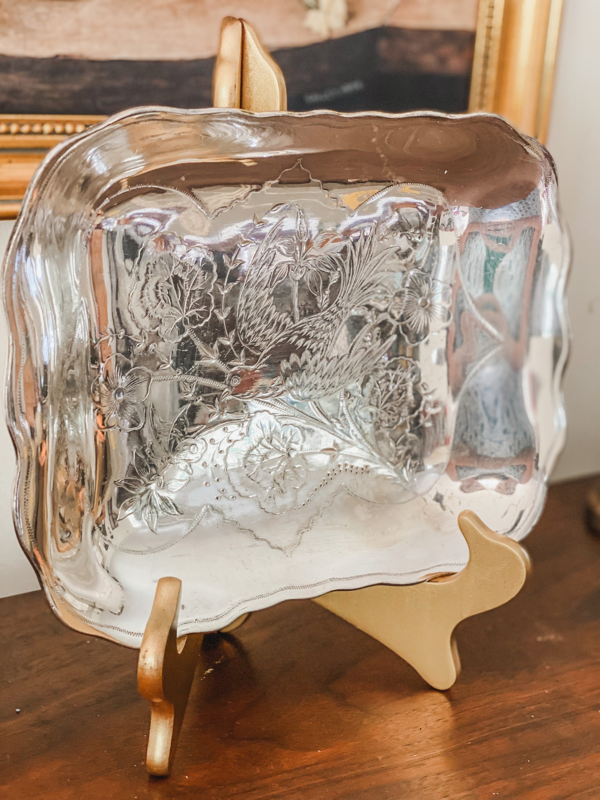 The very detailed craftsmanship and quality of wares made in the Victorian era are the reason we are still able to use these items over 100 - 150 years later. For this reason we are able to offer another estate find with splendid details. This heavy silver plated dish /tray was beautifully engraved with a detailed bird and floral combination. Scalloped edges with a deep bowl area sits on a base with intricate details. Made by the Wilcox Silverplate Co. which operated in Connecticut beginning in 1865, this piece would have been made between 1865 and 1898. It is marked quadroupleplate, which means it was covered in four layers of silver. Excellent antique condition. 10.5 x 7.75