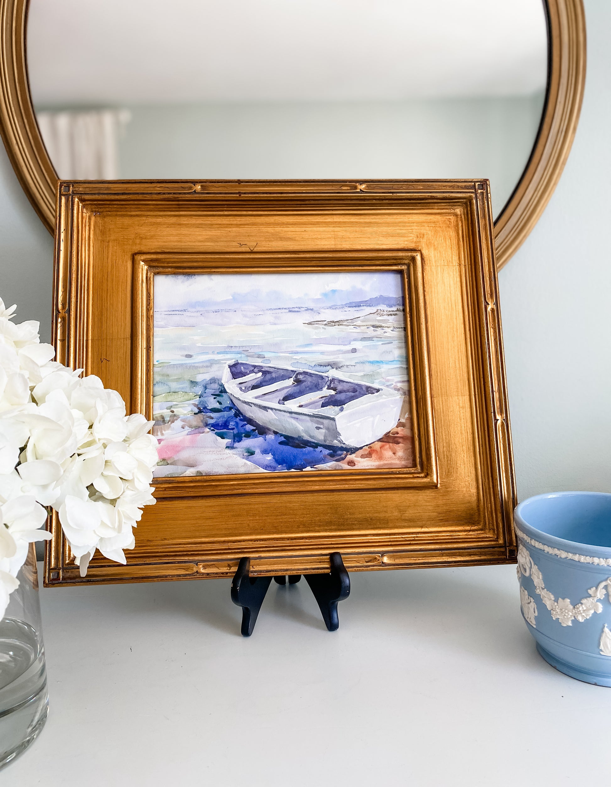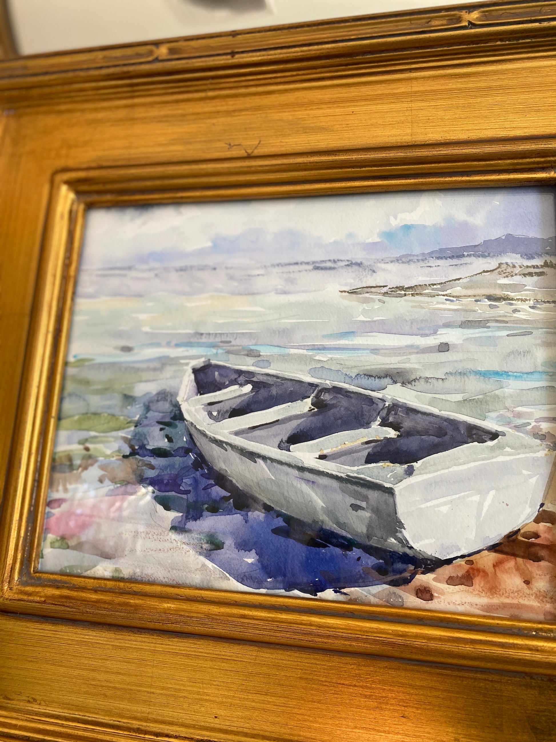 Another beautiful original painting. This one is a watercolor and I love how the artist made the water so multicolored. Beautiful pastel colors in this. Great frame as well. 16.5”x14.5”
