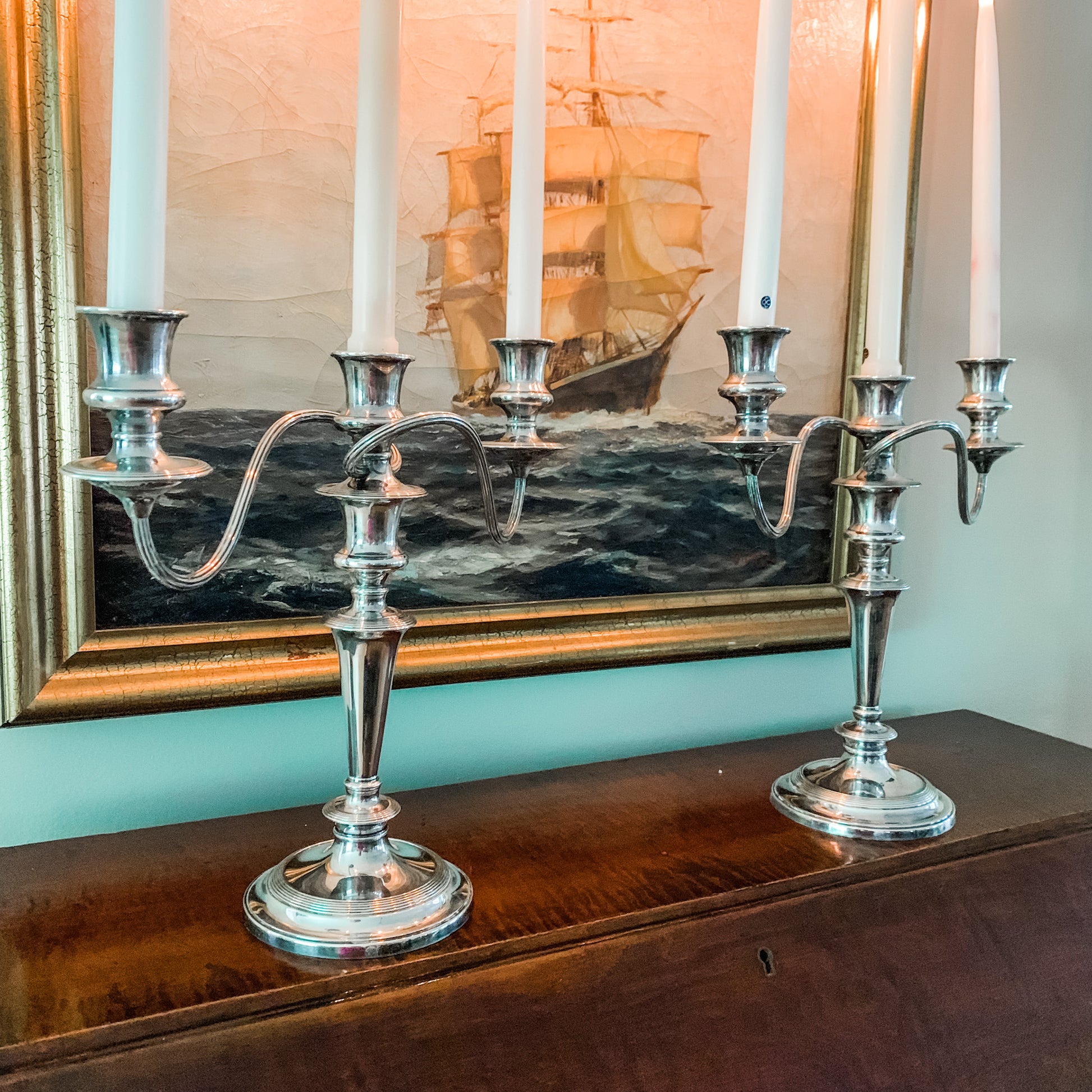 WOW! This is an outstanding find! These are antique silver plate candelabras from England. They were made by the famous Barker Ellis Silver Co in 1912 and feature the scallop shell hallmark. Barker Ellis began as the Barker Brothers and was originally founded in Birmingham, England in 1801. This gorgeous pair of three armed candlabras are very classic and elegant. Excellent antique condition and quality. 12.5" tall x 13.5" wide x 5" deep.