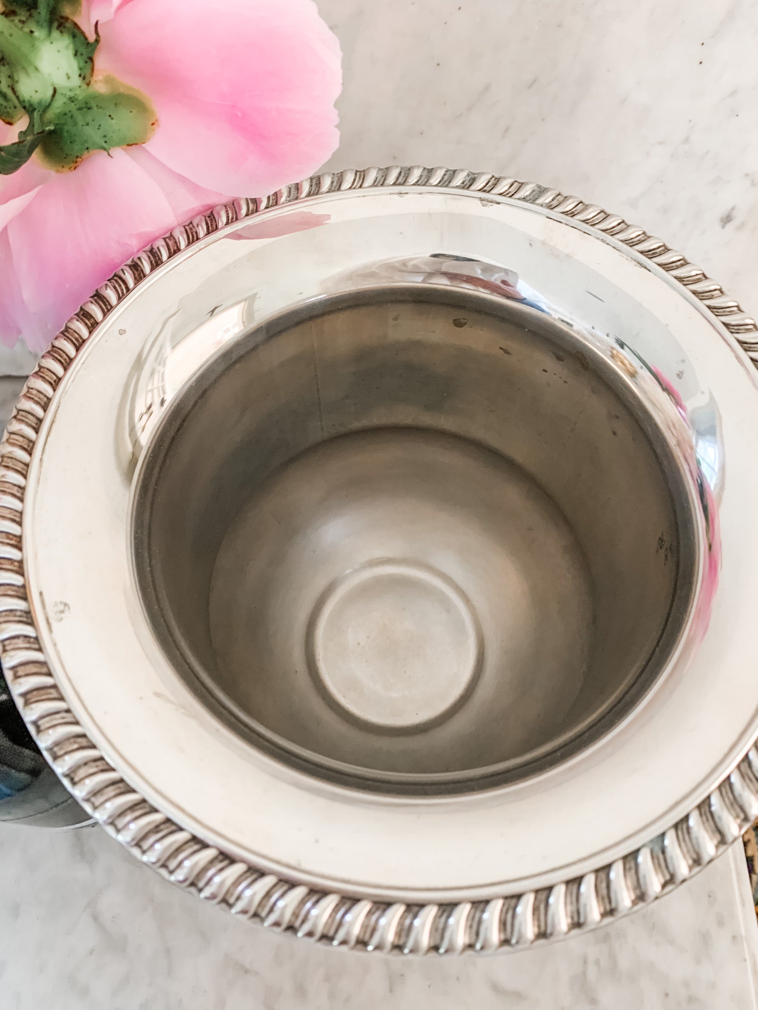 Everyone needs a champagne bucket!! This one is a high quality vintage silver plate champagne bucket by Kent Silversmiths in excellent condition. Rope edge trim and ornate handles with a graceful shape. 9.5" tall.