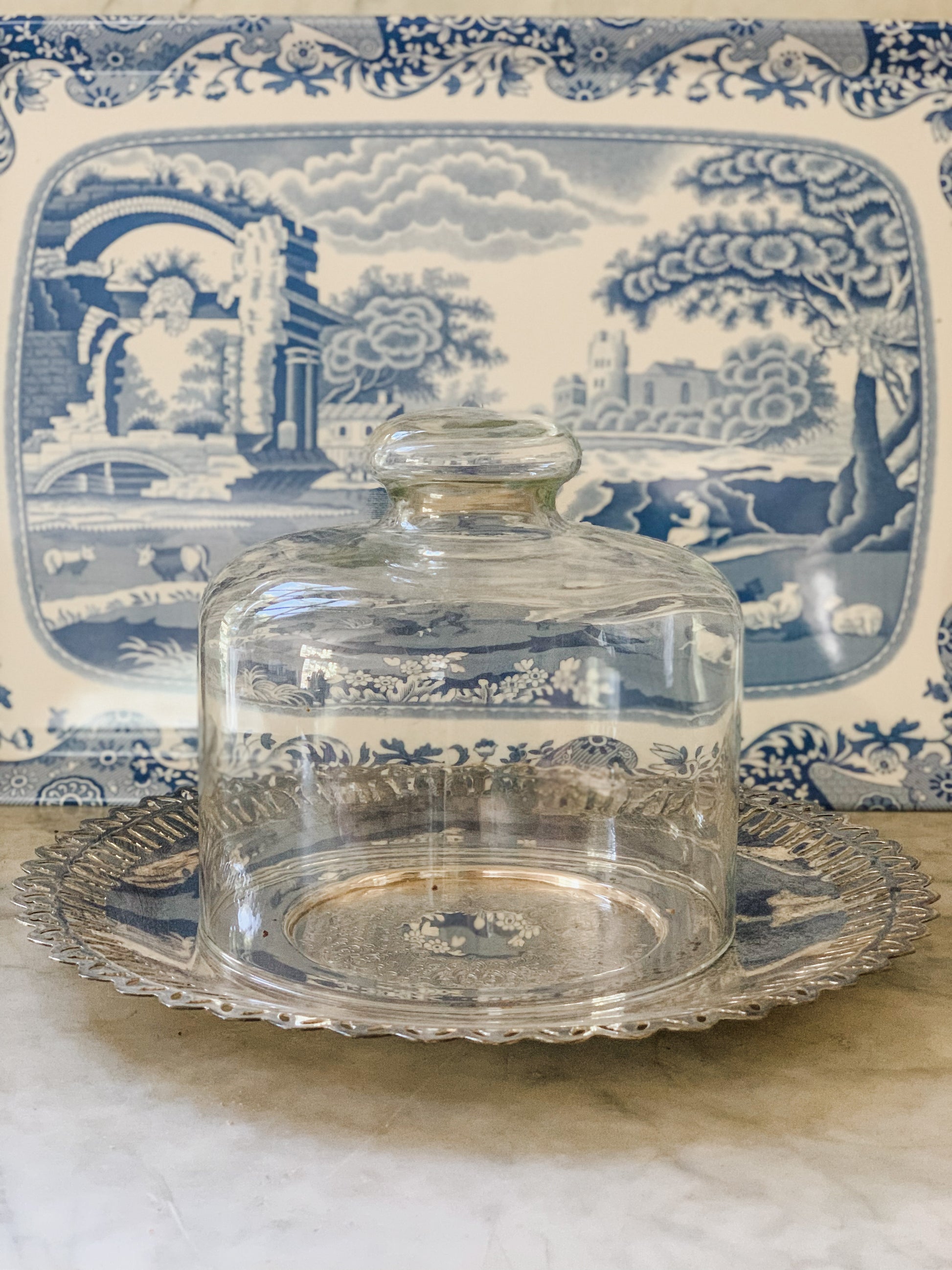 Graceful vintage silver plate tray with a double pierced edge and engraved center covered with a vintage glass cloche. Price is for both. Tray 11" D. 7" tall with cloche.
