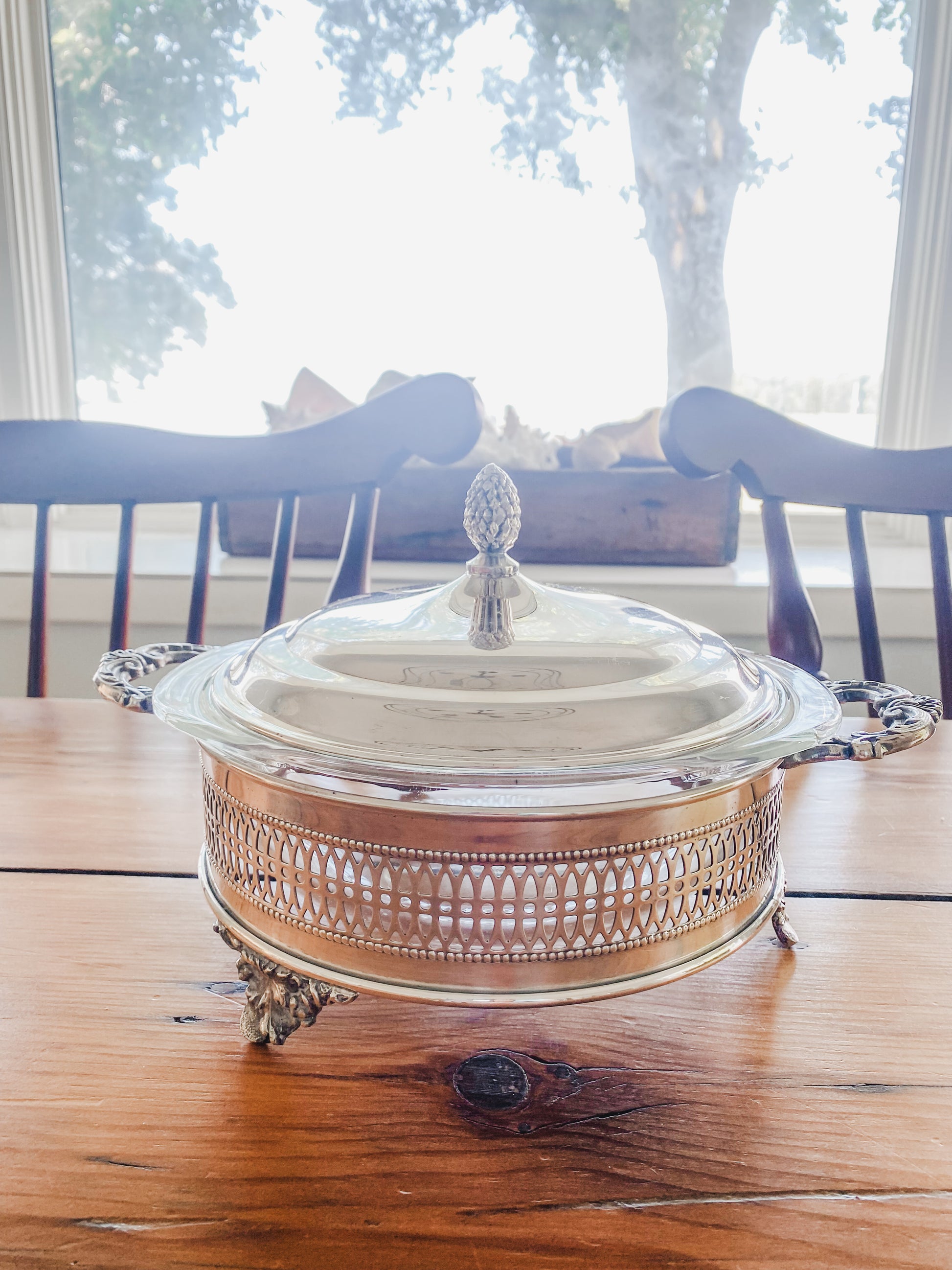 My favorite way to serve! Here is a covered dish with the most beautiful pierced isides. The silverplated dish features two handles on the side and a gleaming cover with an elegant little finial on top. The glass insert is pyrex which is convenient because it's so easy to cook with and clean. excellent vintage condition. 12" w x 6" t