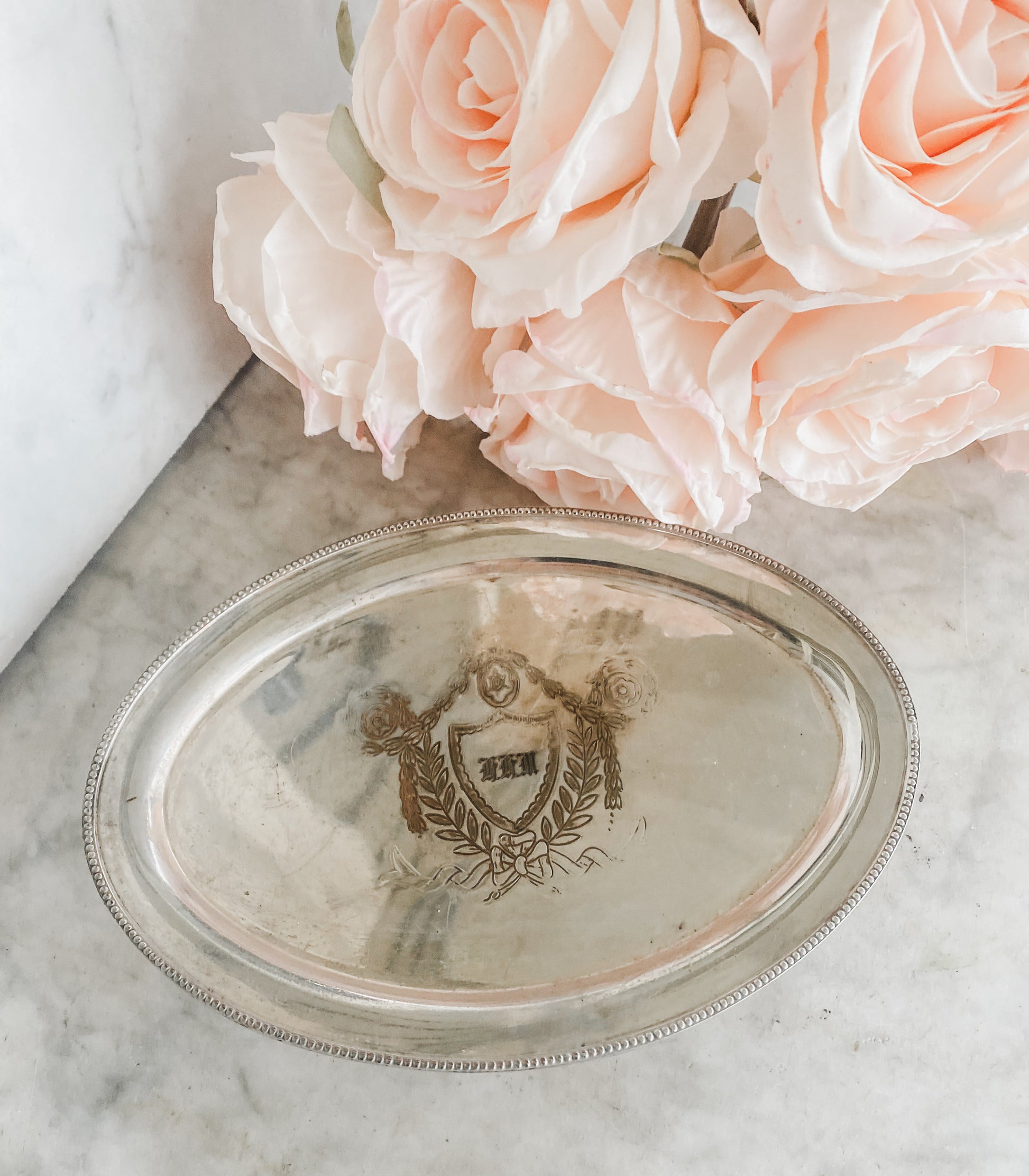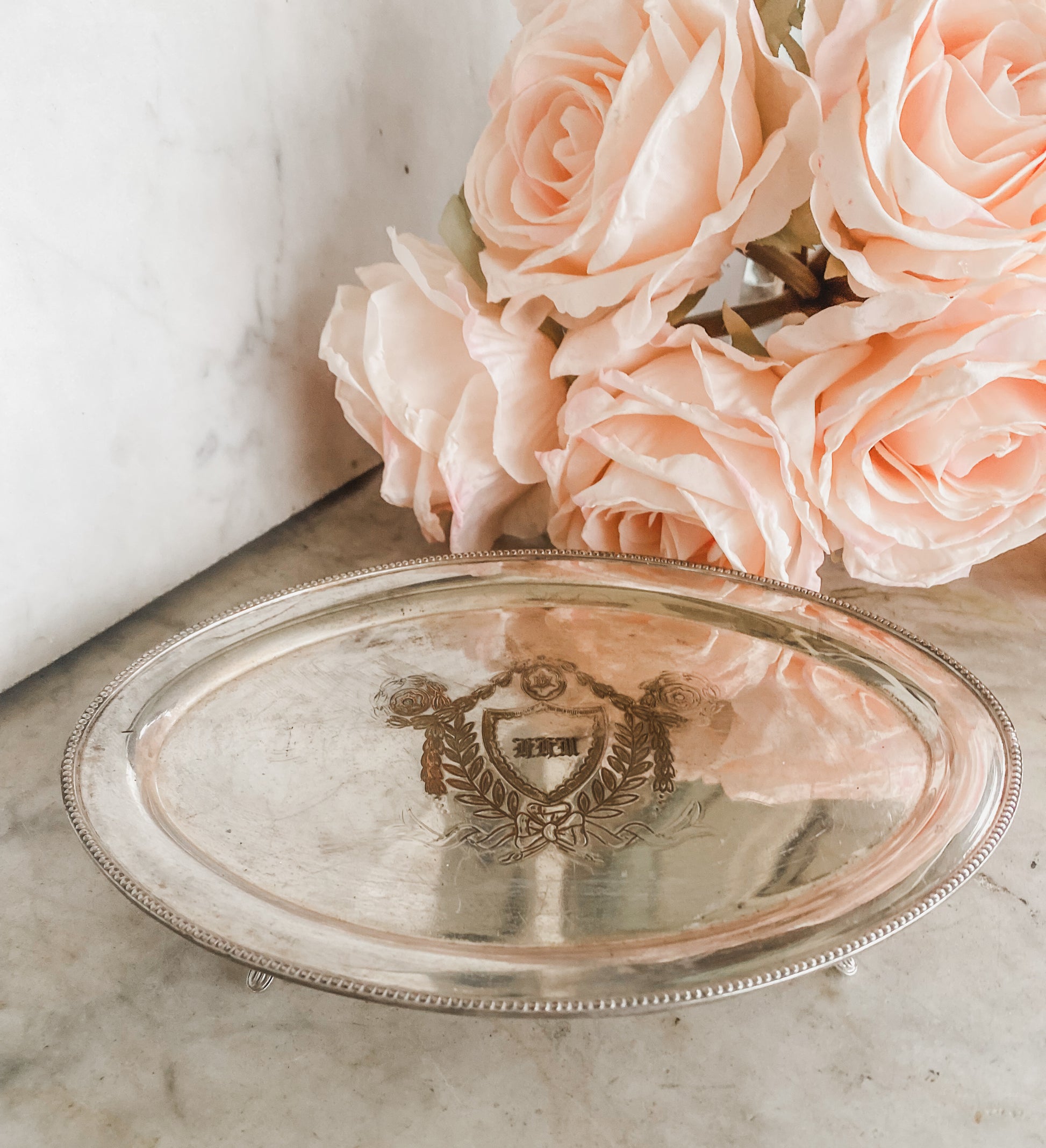 One of my favorite brands! This unique oval tray was made by Barker Ellis Silver Co. of Birmingham, England, a company renowned for its high-quality silver. A special find, it bears the rare Menorah hallmark, first used in 1912. Crafted in silver on copper, it features a lovely beaded edge and sits on four fluted feet. Adding to its charm, the center showcases a neat emblem with laurel and a bow. This antique piece has some wear to the silver, as shown, but its unusual 7" x 5" size makes it a standout addition to any collection.