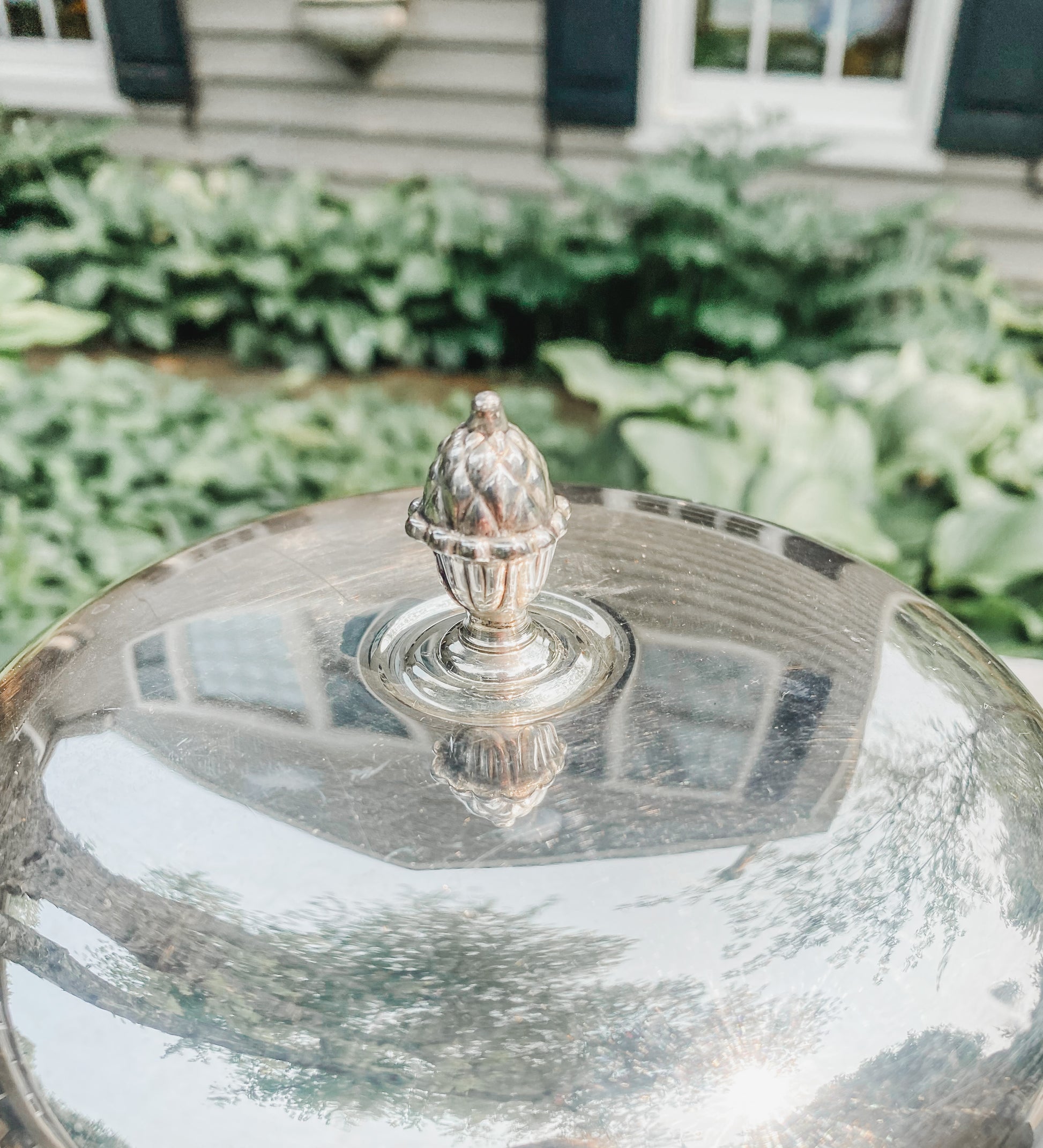 This charming antique covered dish is so shiny that it was almost impossible to photograph! The base of this unusual piece is deep and stands on somewhat dainty paw foot legs with equally delicate handles. Its high dome lid is topped with a finial handle. Very unique piece, also very high quality, excellent condition, with only a tiny dent on the lid. 9” w x 6” t.