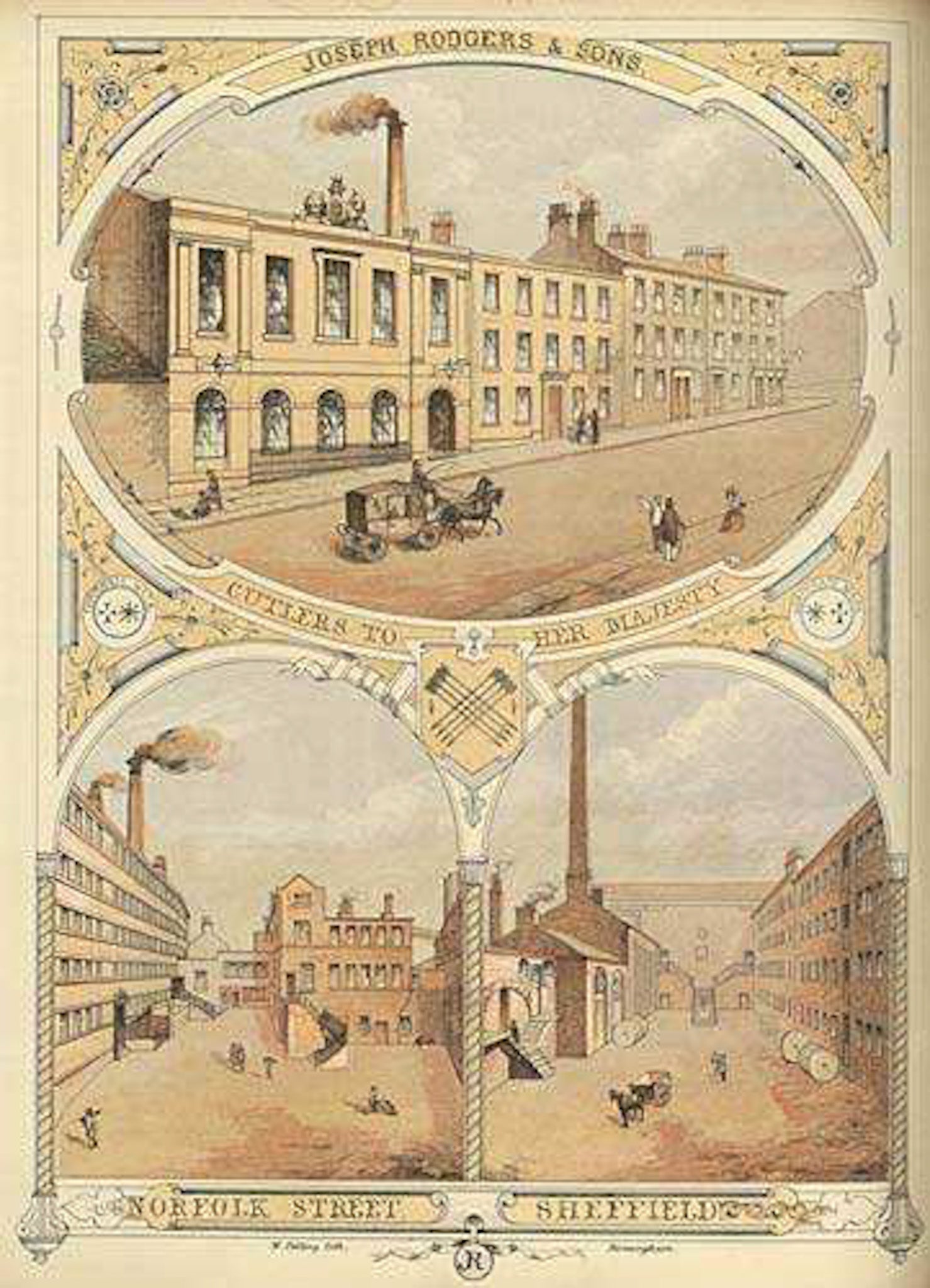 This outstanding silver plated specimen was a Victorian fancy and is now a striking architectural element for anyone who loves artistic beauty. This extremely tall trumpet vase must have at one time held a glass insert. It is extremely ornate and decorated with hooped strings crossed with braided twine and adorned with garlands with roses. This piece was executed by a famous silver company which began in 1682 and eventually became known as Joseph Rodgers & Sons Ltd in 1871. The silver markings for this company appear on the bottom. The site of the original Sheffield factory is sketched in the image below!