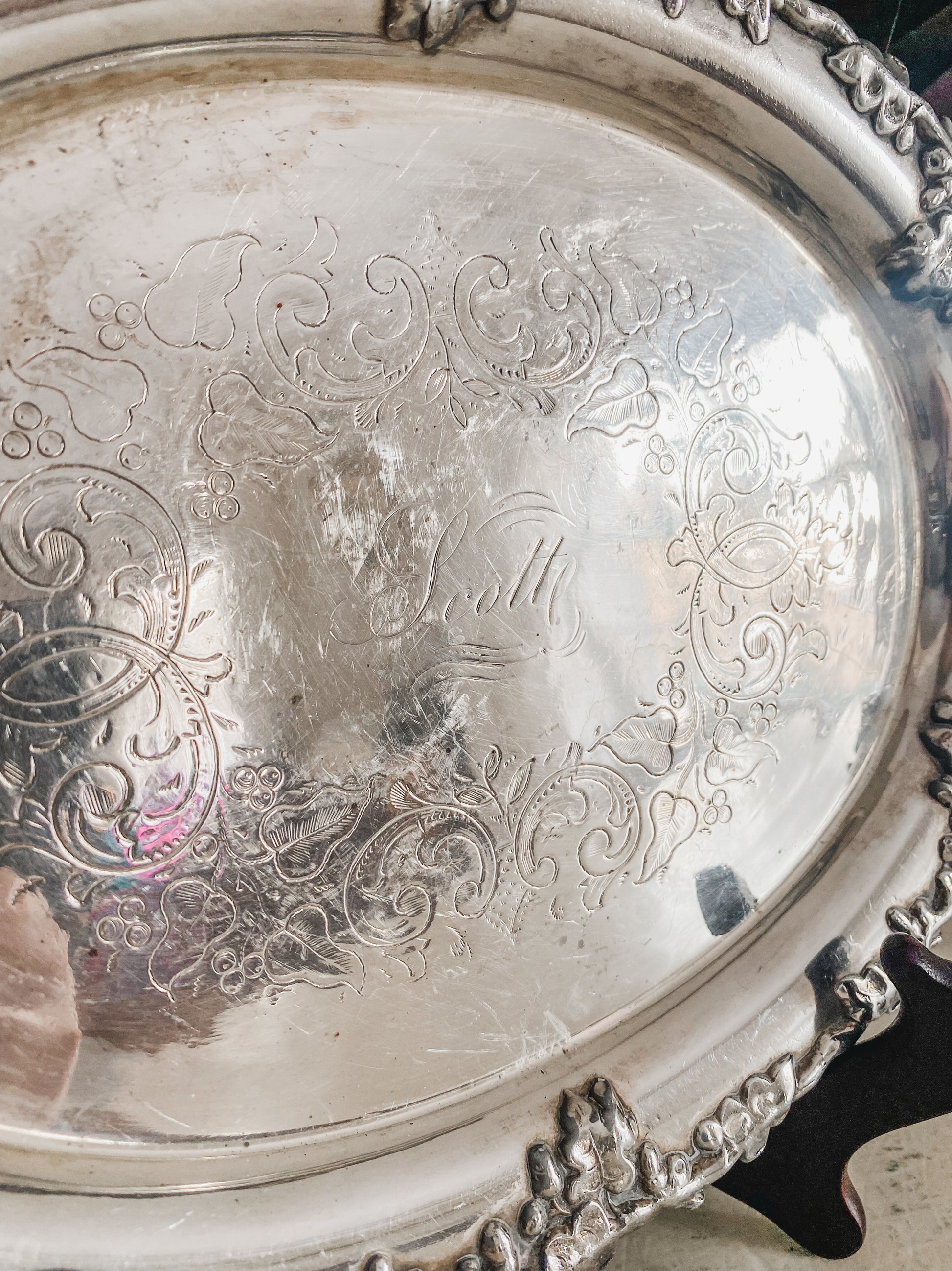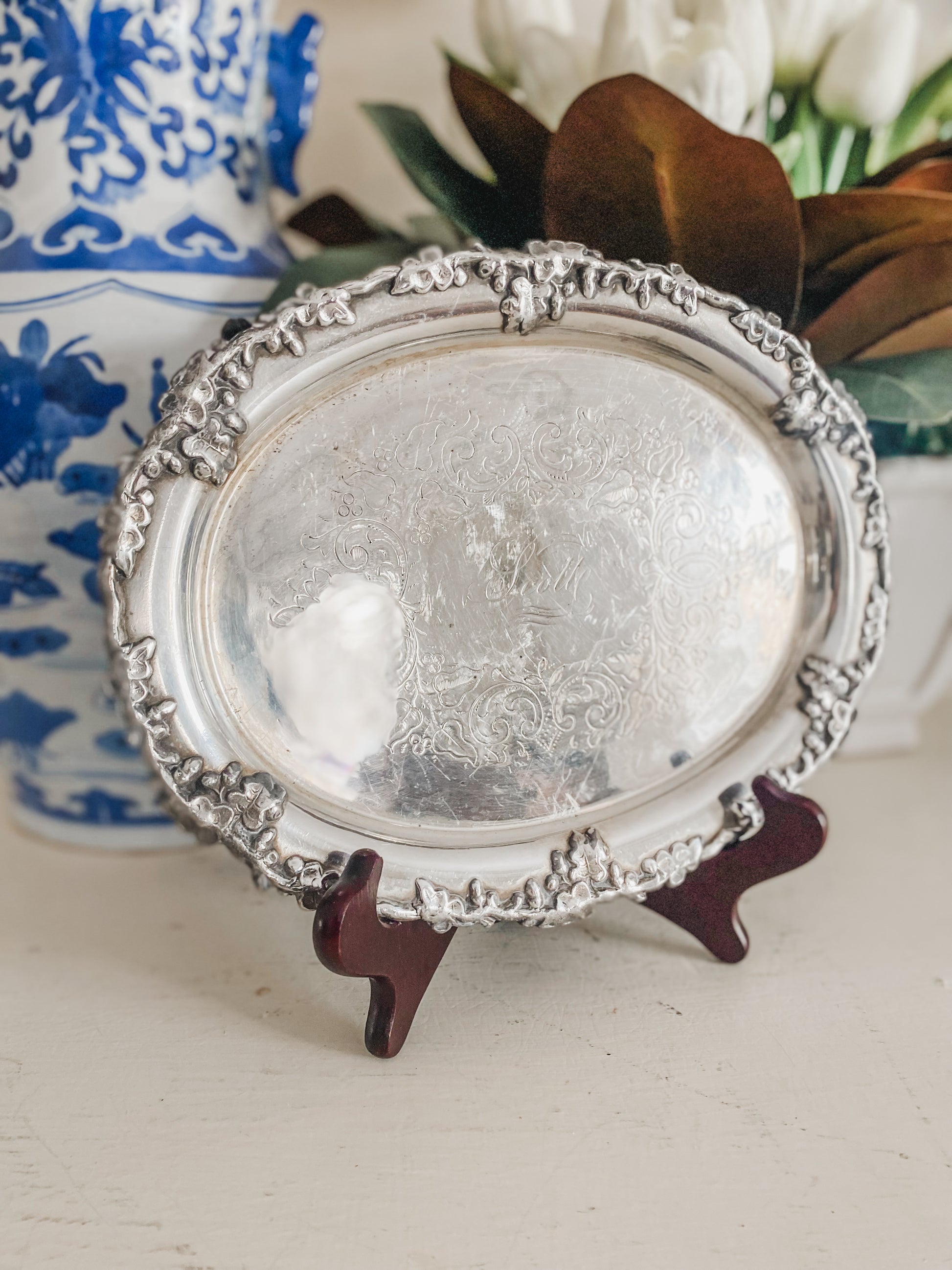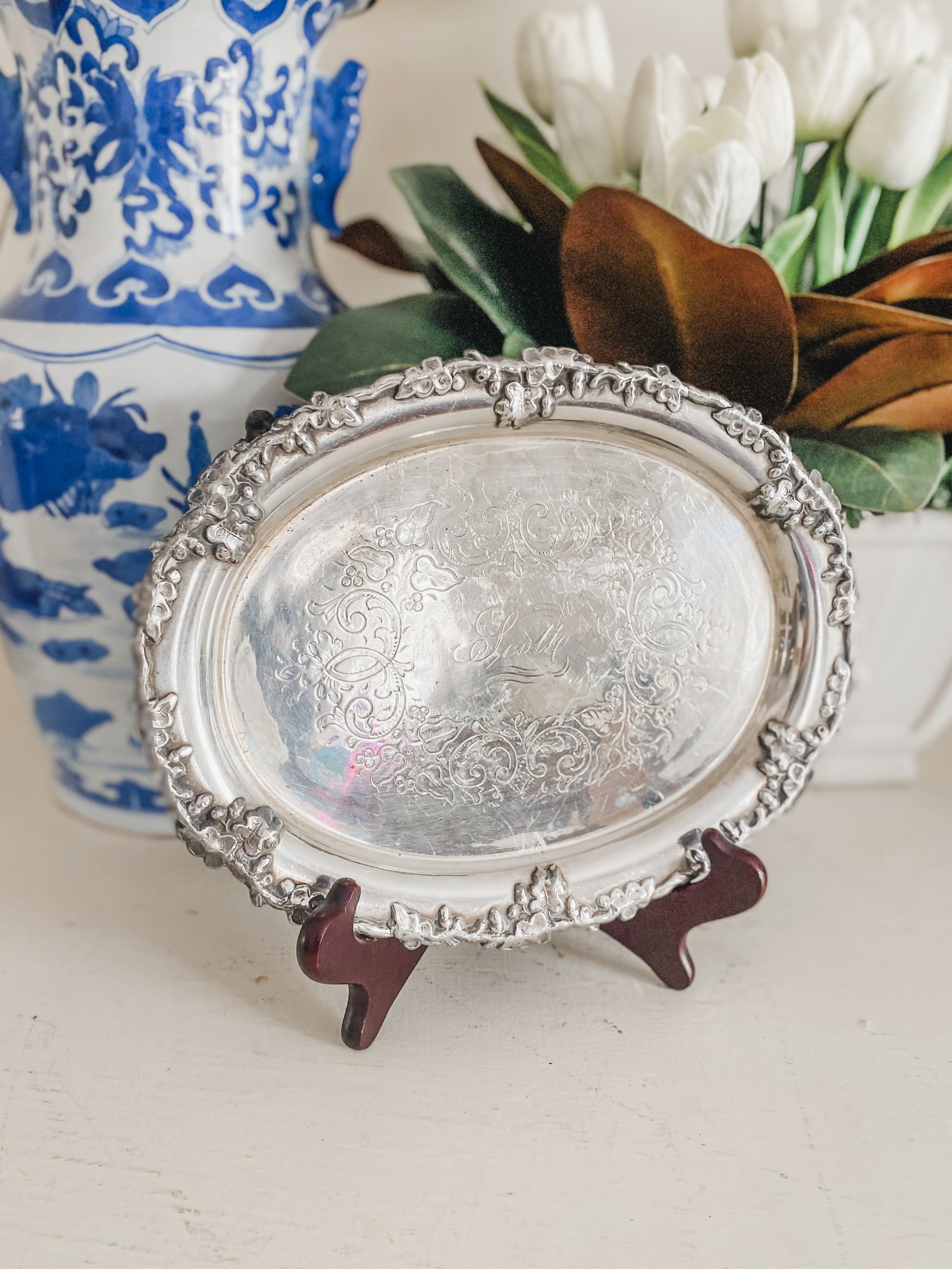 Here’s a truly charming antique miniature tray! With hand-chased, botanical detailing along the edges and four dainty feet, it’s full of character. The etching in the center beautifully highlights its oval shape, and the name “Scott” engraved on it adds such a sweet, personal touch.