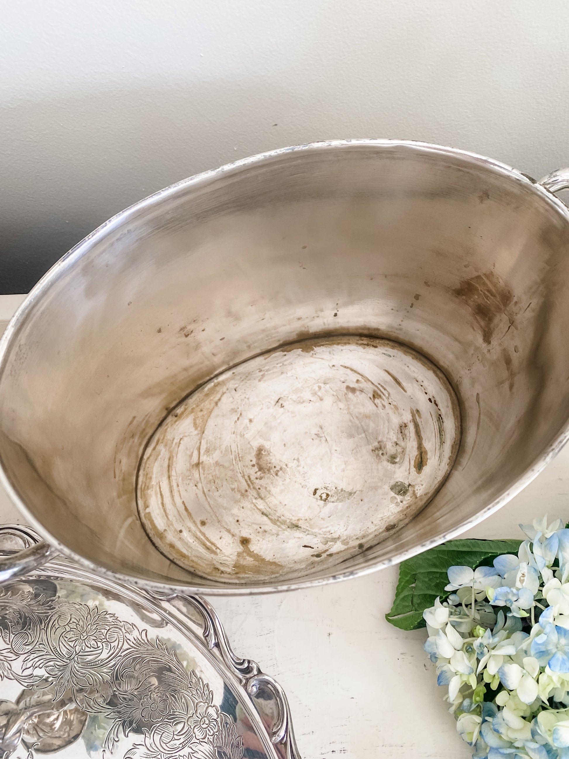 This is a great wine caddy! Love the simple lines and the double handles. I would love to put flowers in this as well. Silverplate, some tarnish, particularly on inside, otherwise very good condition. 13" wide x 7" tall.