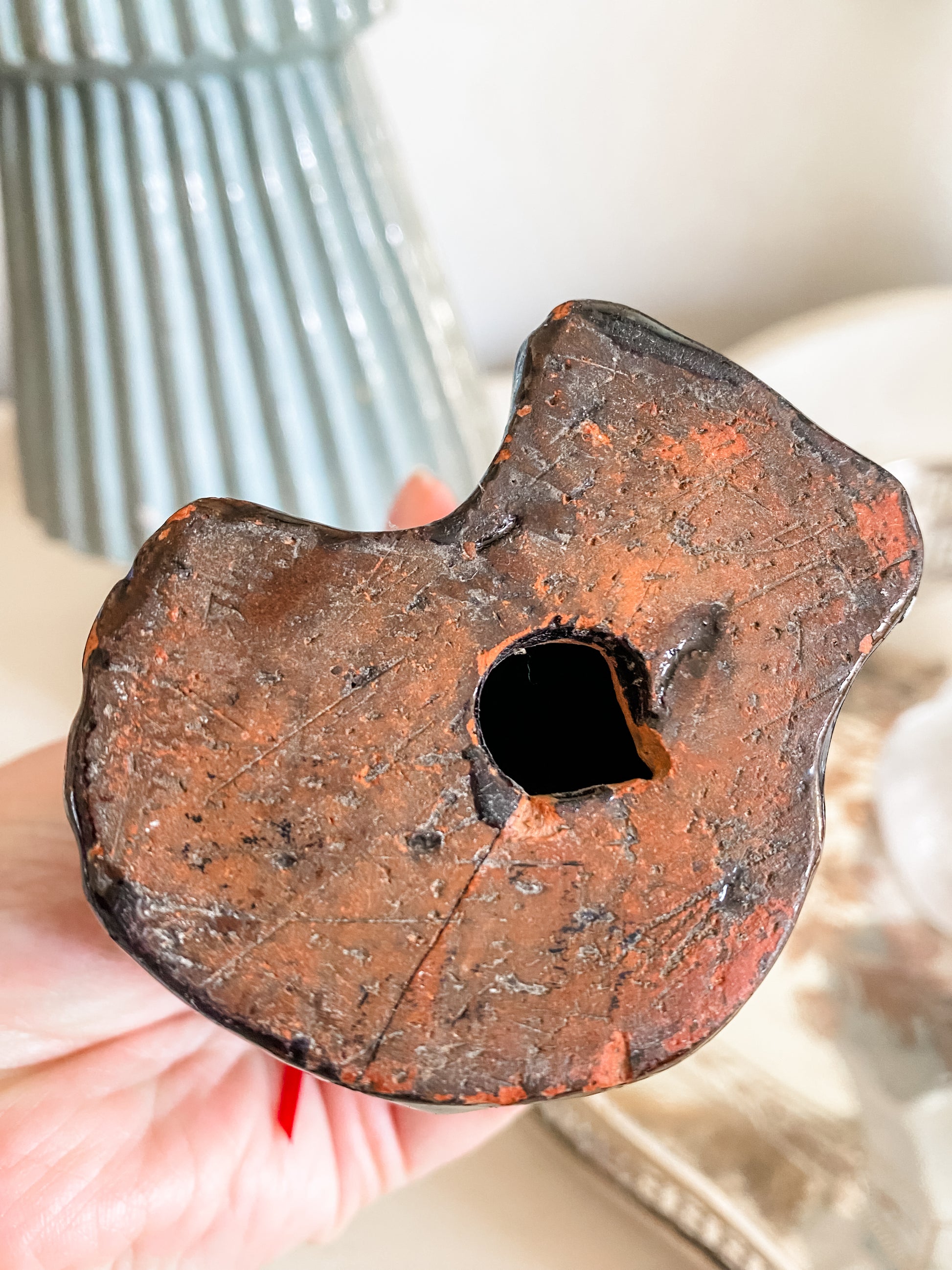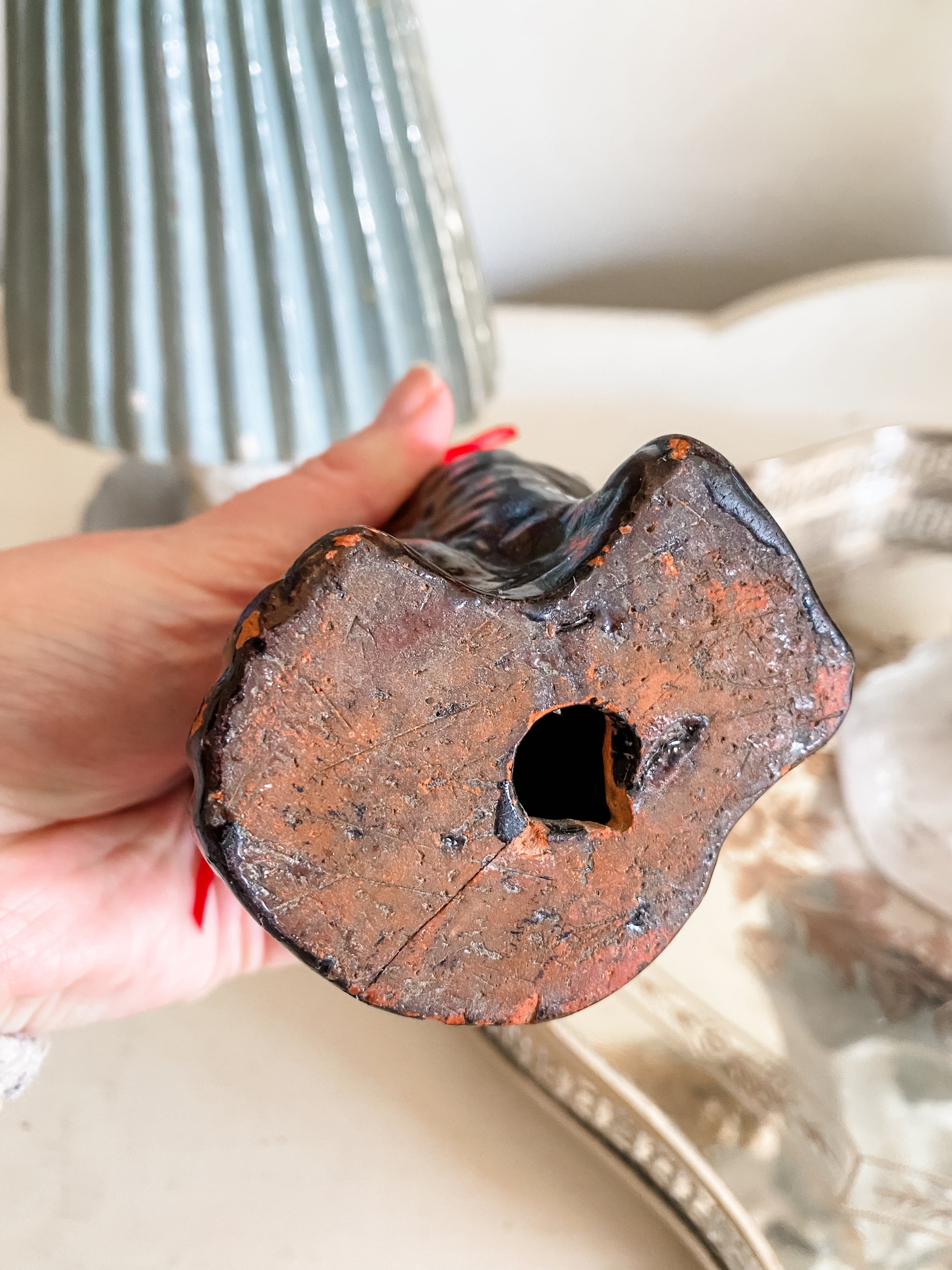 Here’s a special pup! Handmade of earthenware and glazed in a deep, rich chocolate brown, this charming dog stands 5" tall. It shows characteristics of the highly prized John Bell Staffordshire dogs, which are incredibly rare and can fetch thousands of dollars; however, this one is unsigned, leaving its origin a delightful mystery to me. Its unique craftsmanship and character make it a standout piece. I would adorn this pup with a ribbon to match the seasons—red for Christmas, pink for Valentine’s Day, or any color that suits your decor. A delightful addition to any collection or mantel!