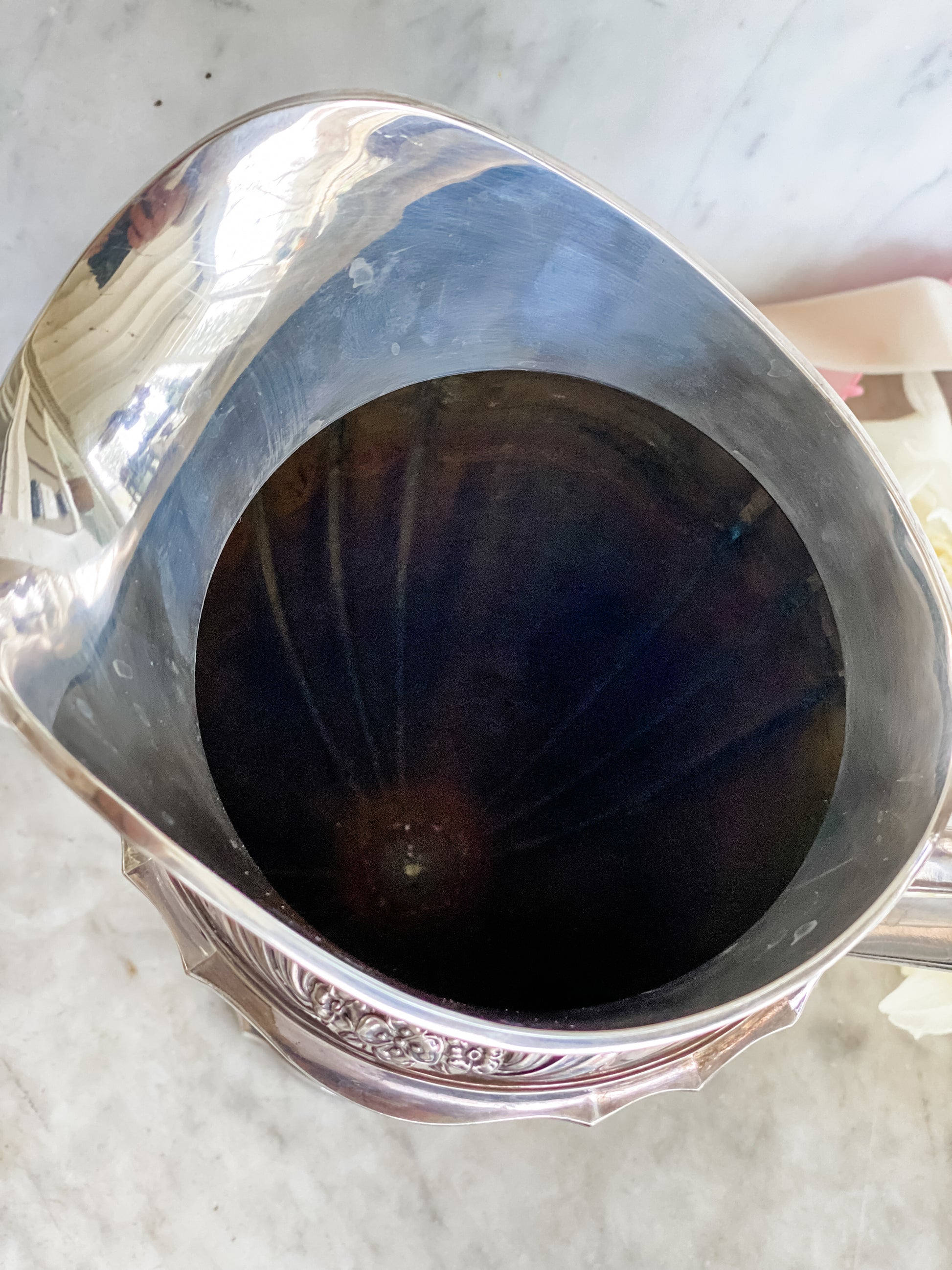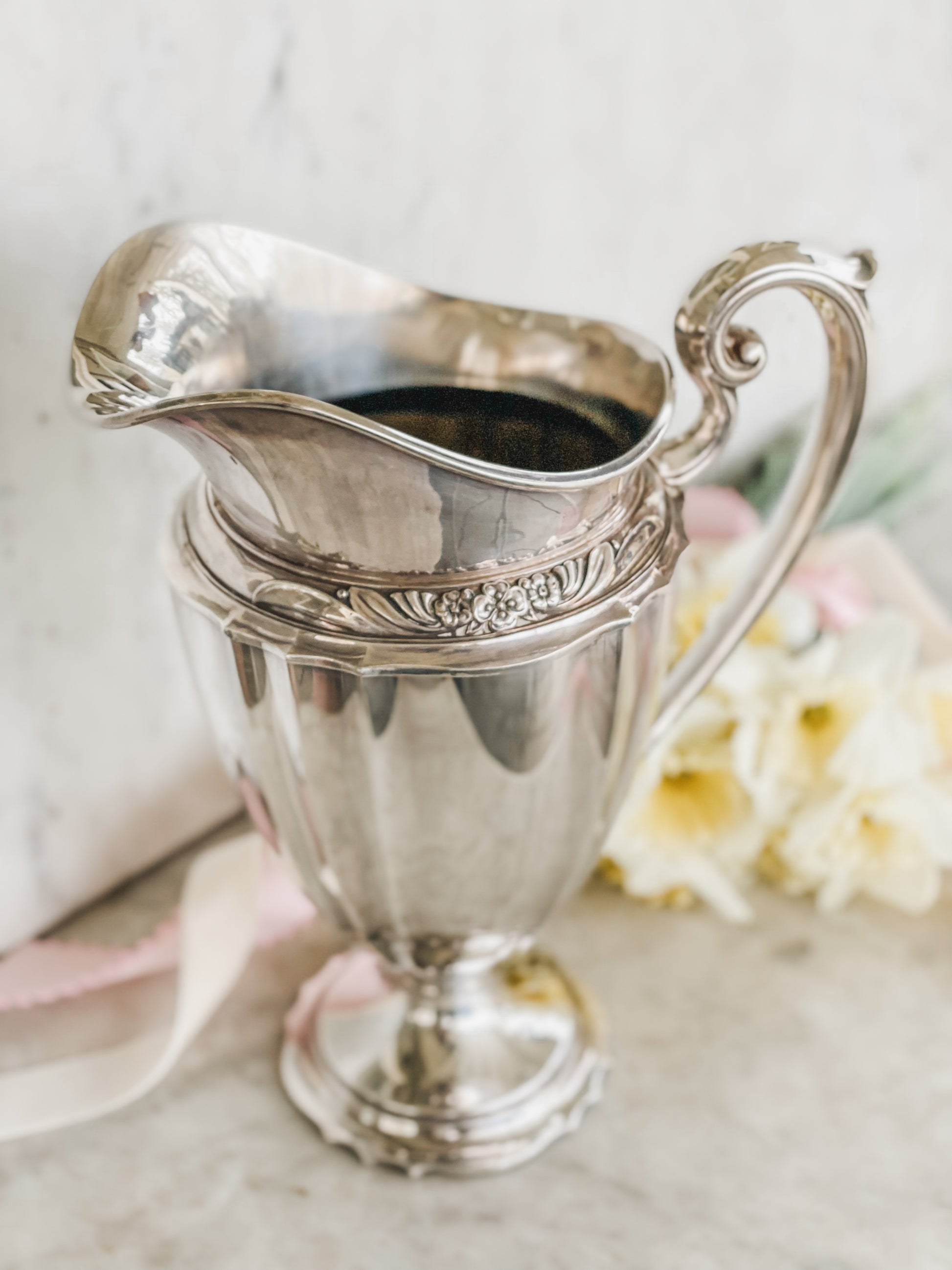 This is a heavy, quality piece. This pitcher is in very good vintage condition. The silverplate has been well preserved, with only a very small, hard-to-spot dent near the base. The interior shows signs of use and could benefit from a light cleaning if you plan to use it for serving, or simply use it for display or to hold flowers as I like to do.