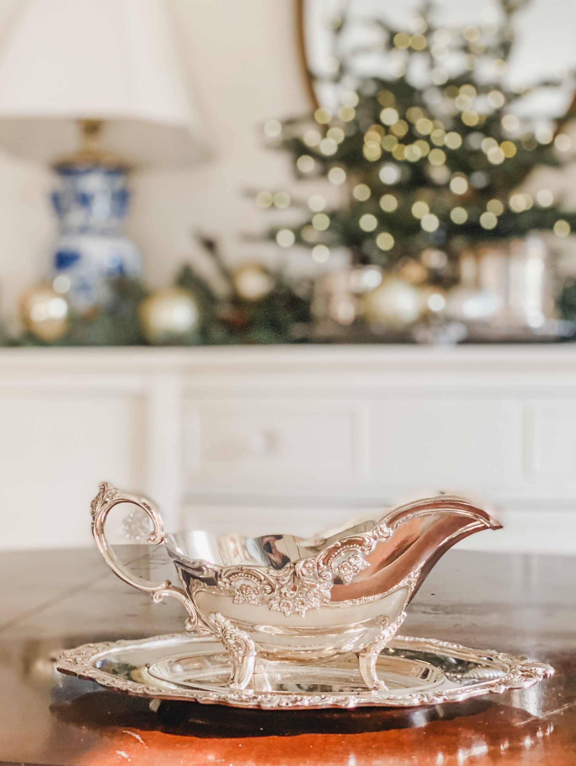 A gleaming gravy boat is a must-have for every holiday table!! This one will not disappoint. Made of the classic Baroque pattern, the swirls, florals, and beading remind me of a bridal gown - and don't we just love to have everything in our homes as beautiful as a gown! This substantial gravy boat sits on 3 feet and comes with the matching tray. It is in excellent condition. 11" x 4.25"