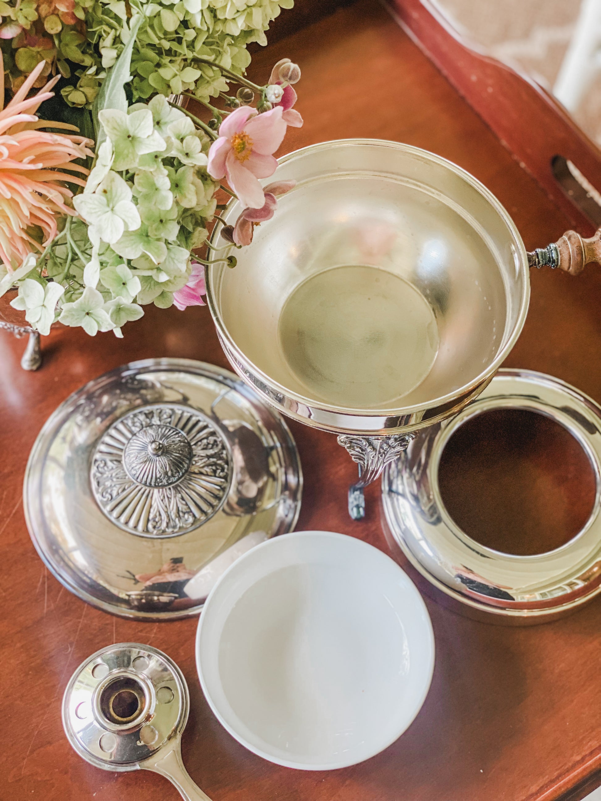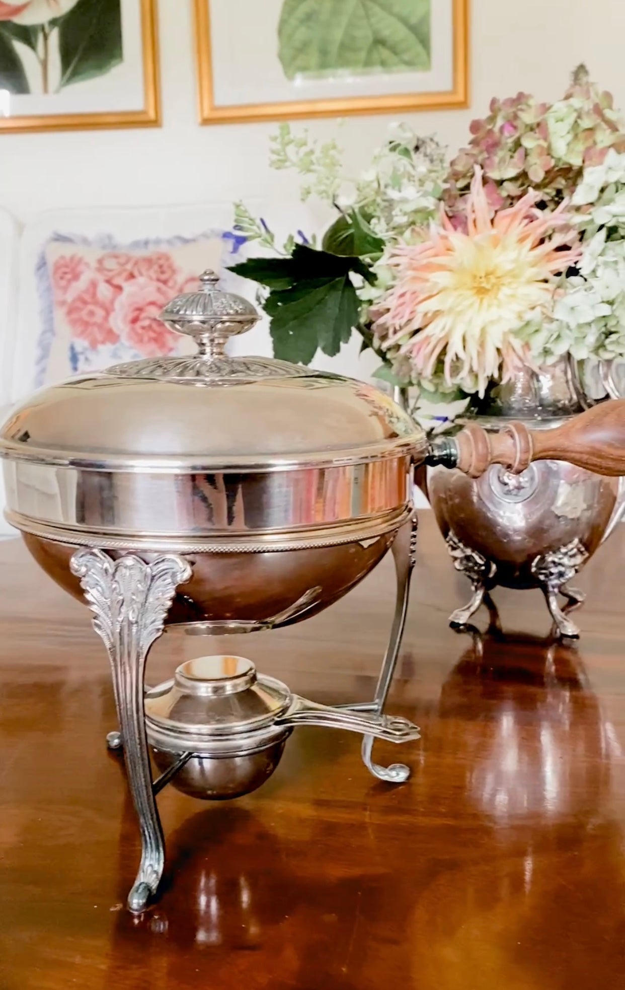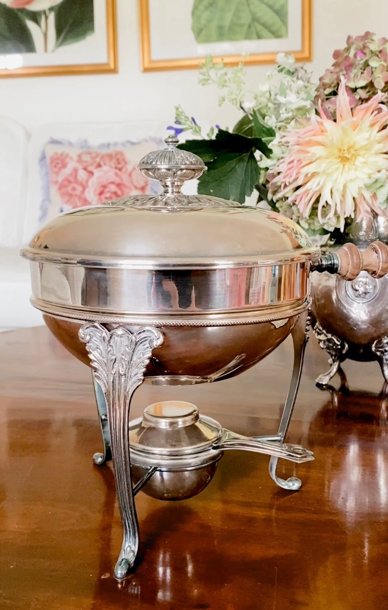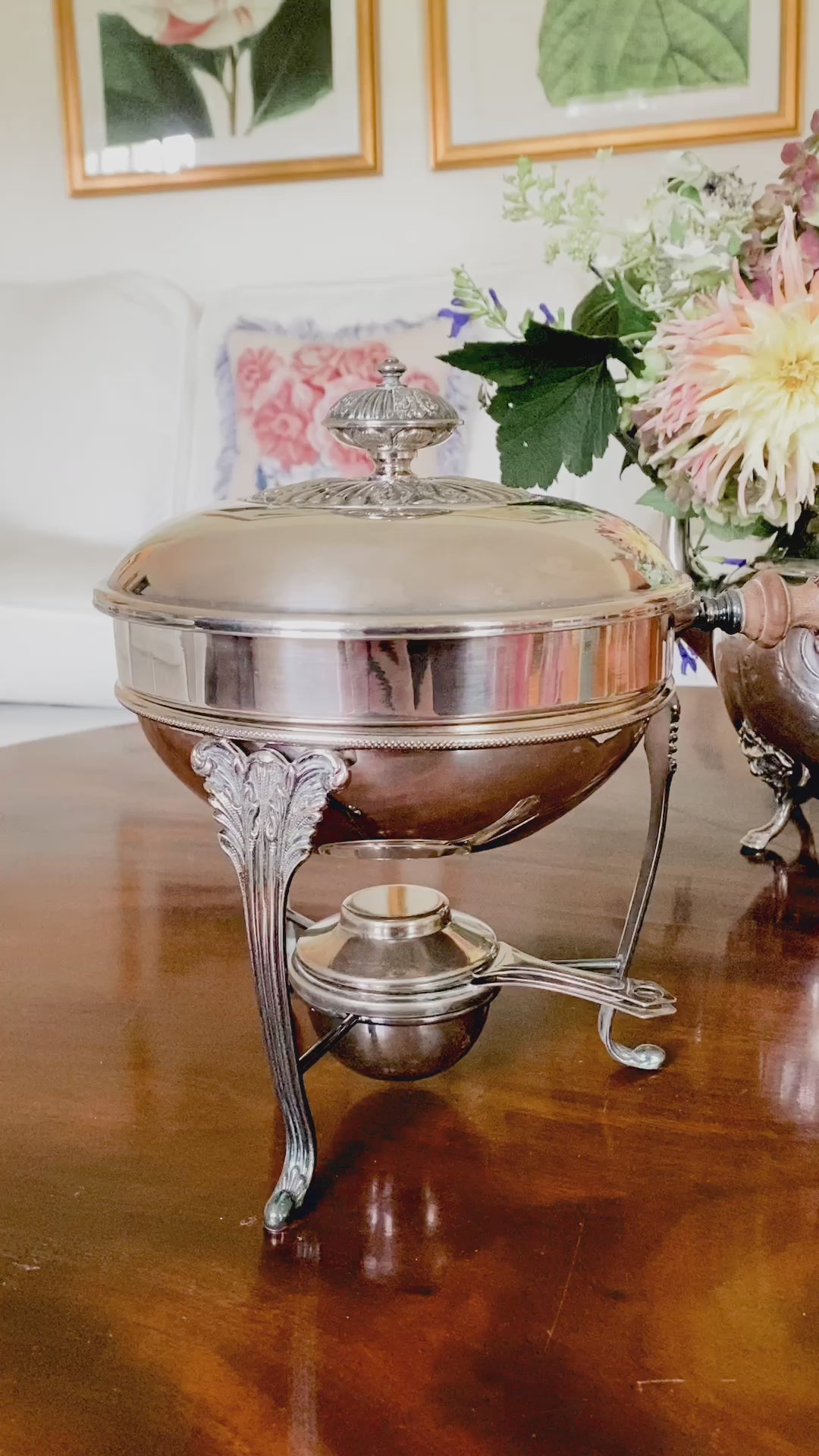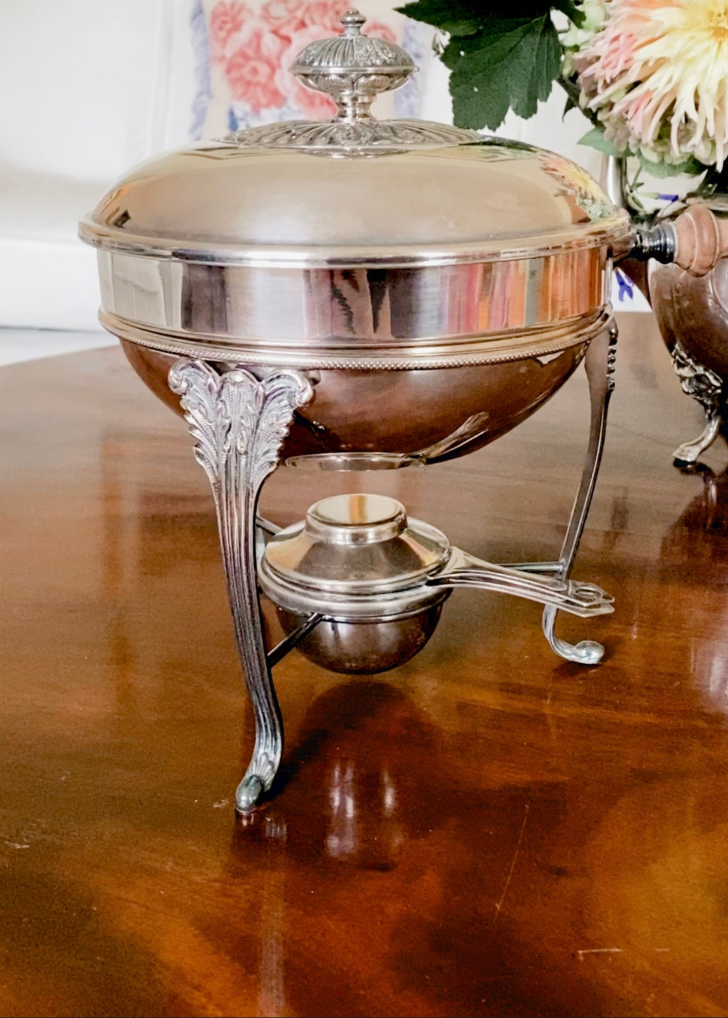 Anything looks more appealing when elevated on a stand. This vintage Williams Adams Towle silver plated chafing or warming dish is no exception. The large covered silver bowl sits a top a stand with striking detailed legs. Ornate finial handle, insert, wooden handle and spirits burner for the stand. Excellent quality and condition. 13" wide x 9.5" tall.