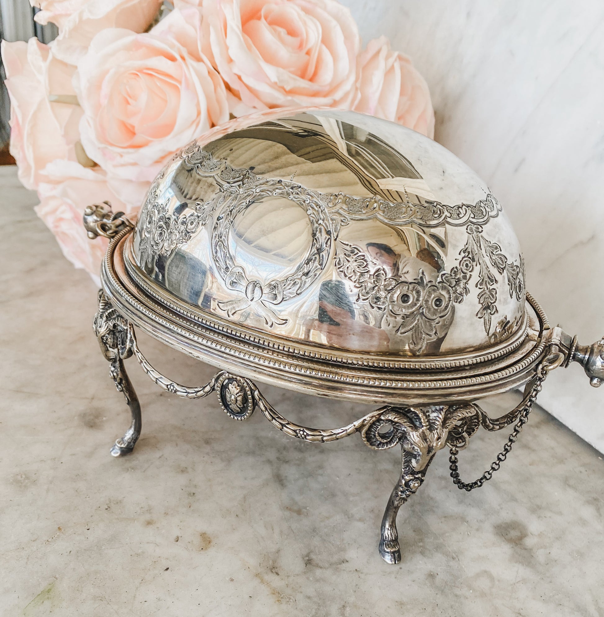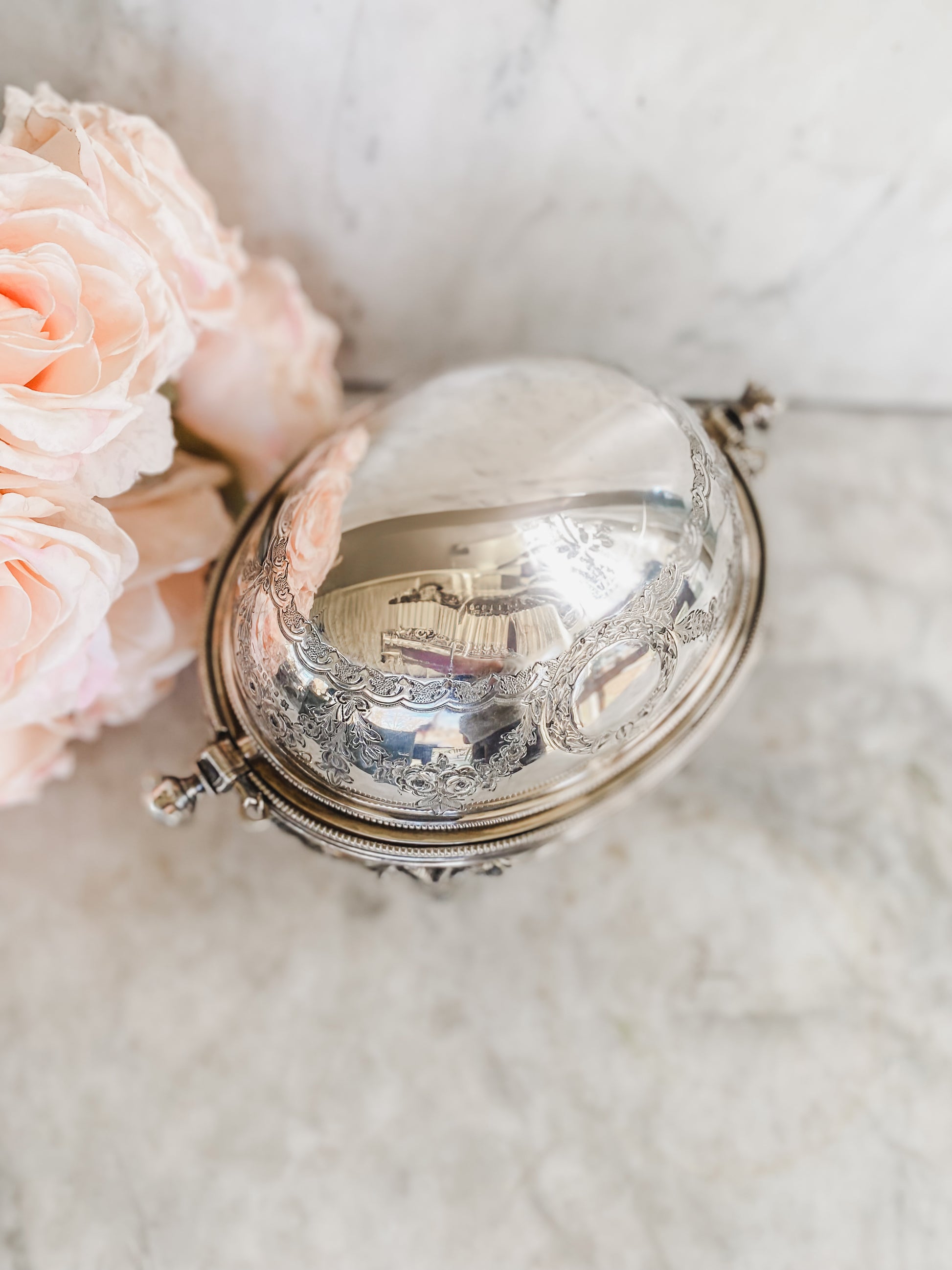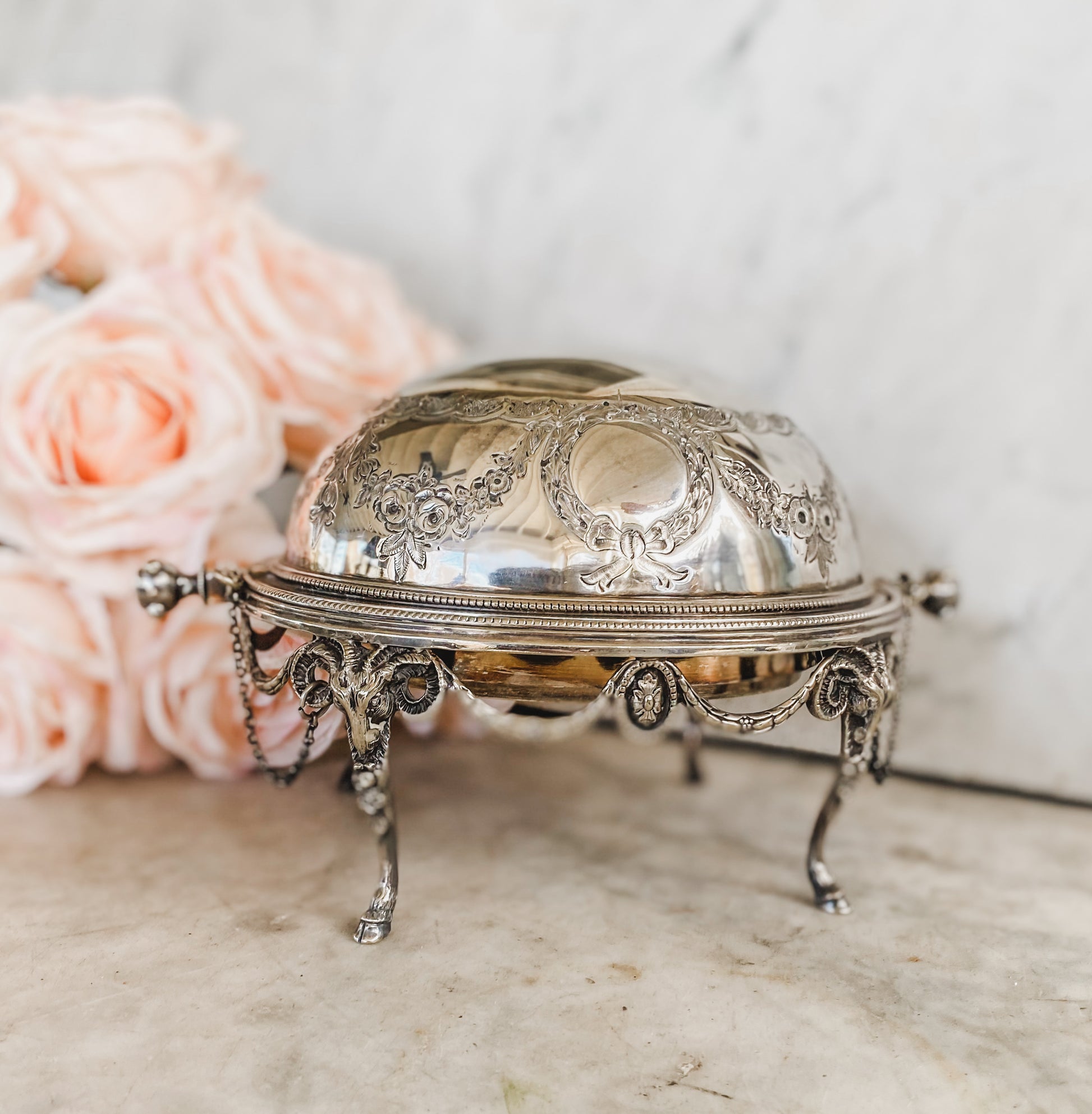 As functional as it is beautiful, the domed lid glides open to reveal a space for your butter, while the original chained pins on either side speak to how excellently preserved this has been. Measuring 5.5 inches by 9 inches, this silverplated butter dish is in exceptional antique condition.