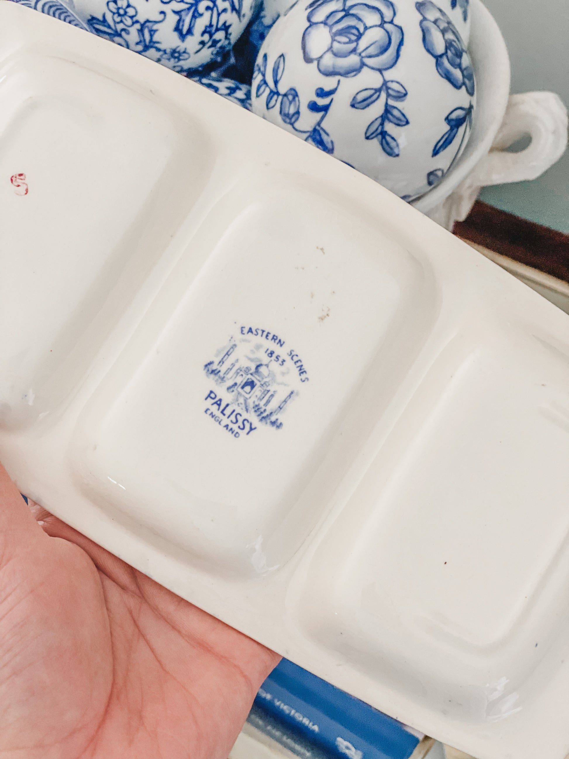 Charming blue and white transferware tray. Three little compartments make it perfect to keep next to your bed. You can't go wrong with blue and white! 10" x 5.25"