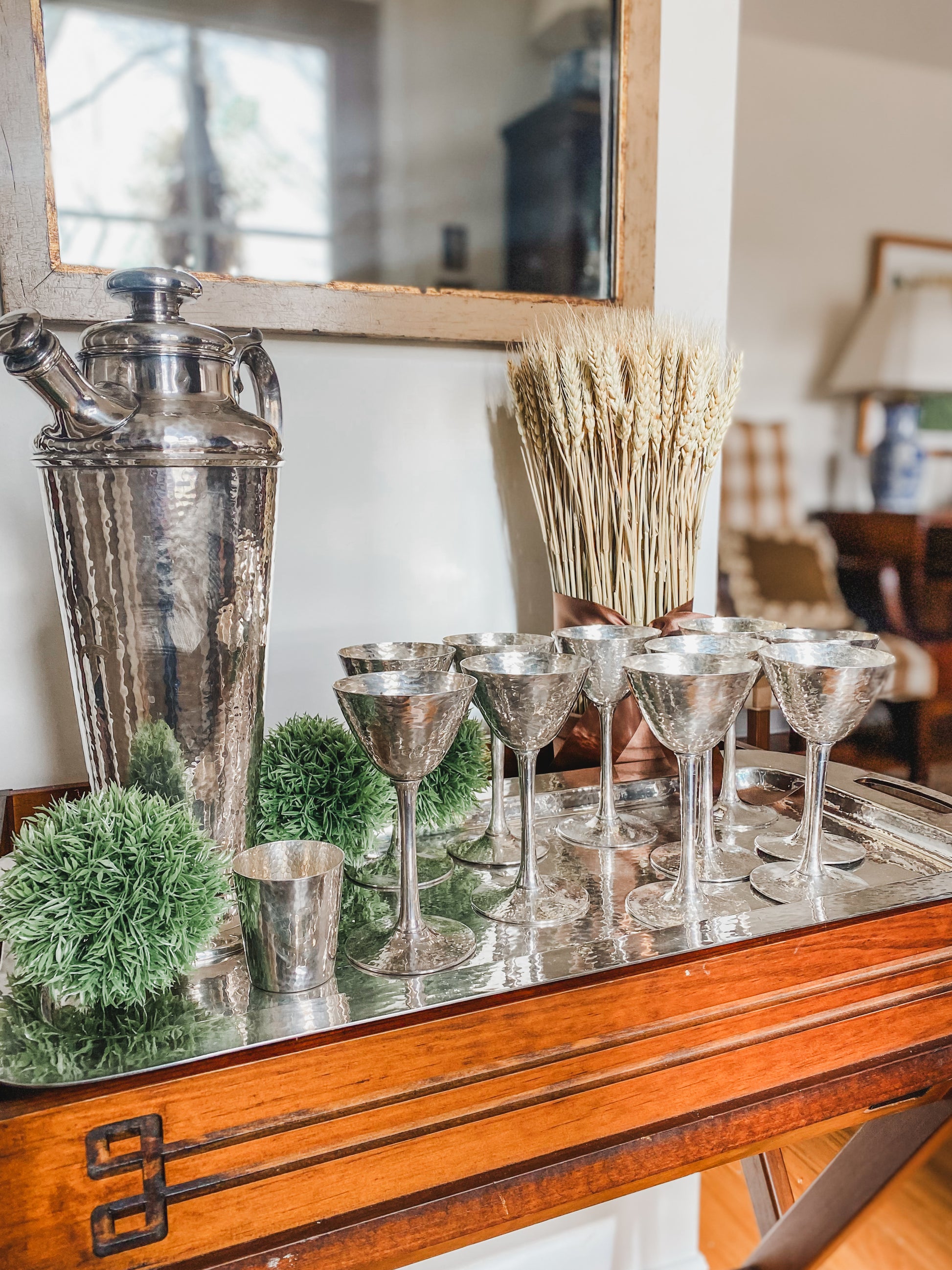 This set includes the huge cocktail shaker you can use to mix up some Christmas cocktails and pour into the 10 martini glasses. It includes the original shot glass for measuring and all sit on the matching tray. The shaker is 13" tall and the tray is 11" x 24." The shaker and the tray both bear a light "P" monogram.