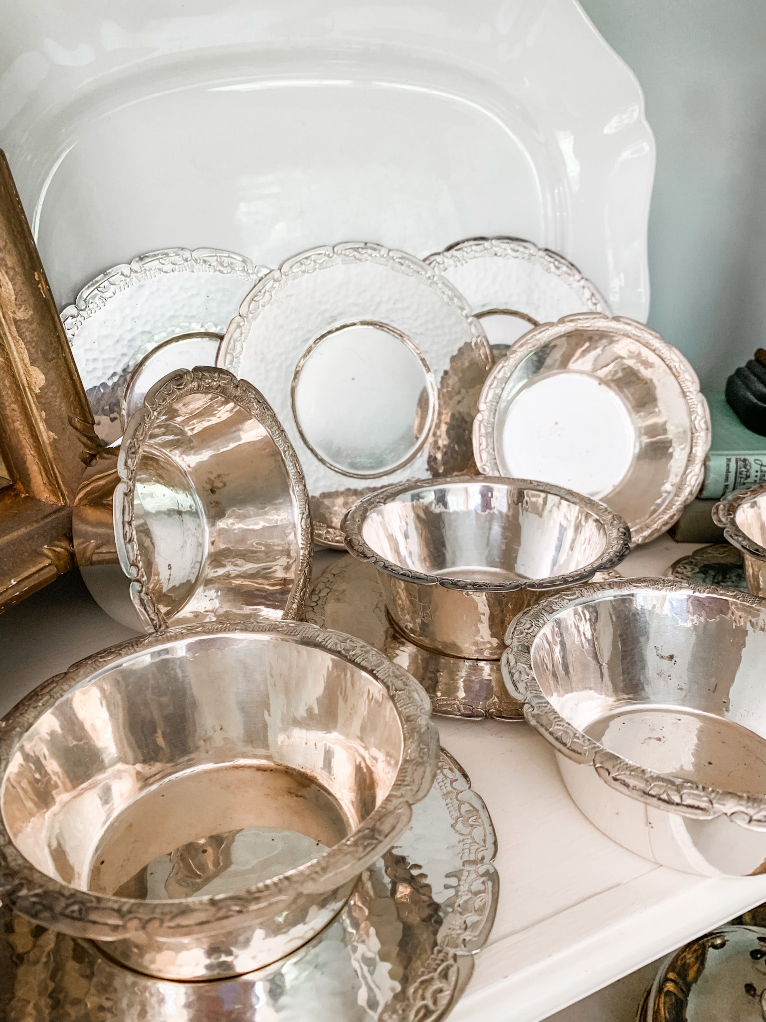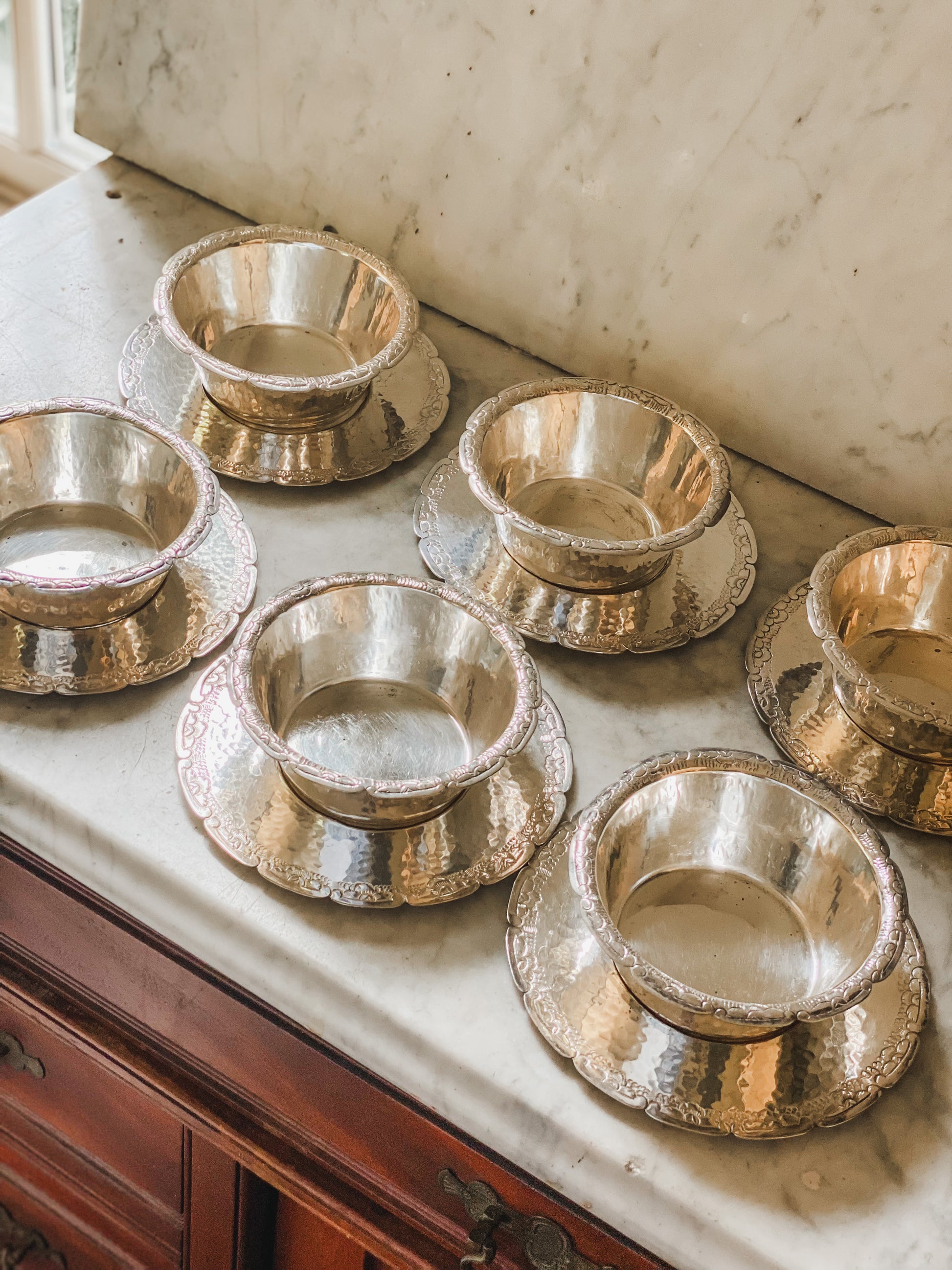 How different it is today! We are lucky if there is Purell in the car to clean your fingers after eating fast food! Remember the finer times with this set of 6 silver plated finger bowls and plates. Use them as fruit or dessert bowls instead if you wish! Each bowl is deep with a scalloped edge, hammered design and hand chased edges, the plates for each are matching. Bowls are 5" wide and plates are 6.5" wide