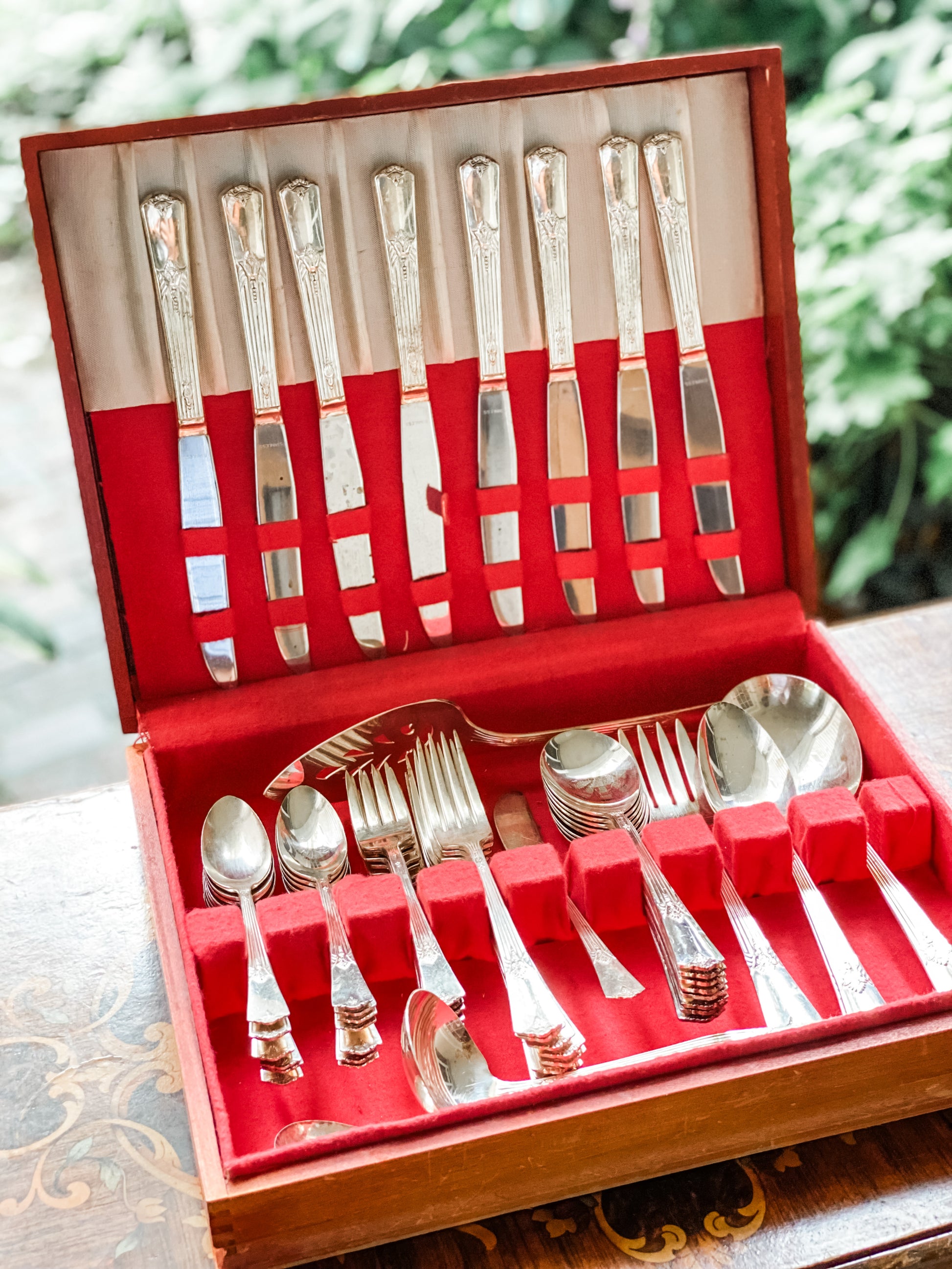 I love this pattern! Here is a silver plated flatware set made in the 1930's with service for 8 plus lots of extra serving pieces! This pattern is WM Rogers Sectional. This is in very good vintage condition - the box has a few scratches on the outside and one of the felt knife holders has come undone (you can see felt in photo).