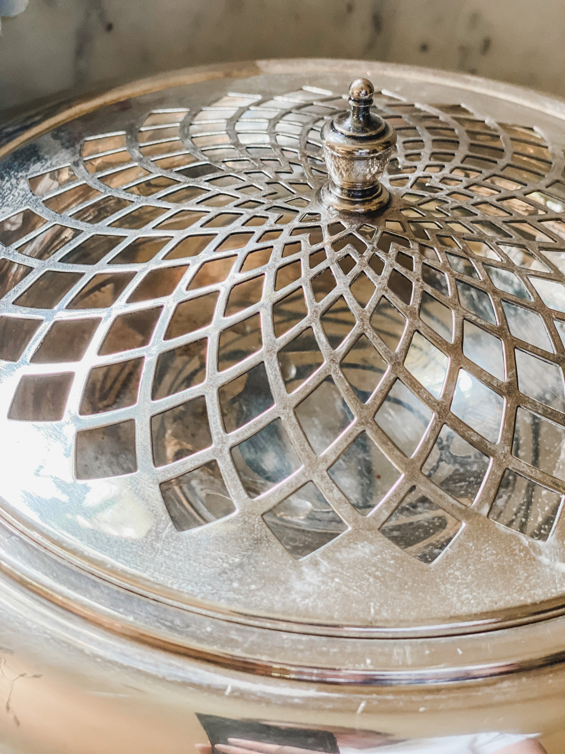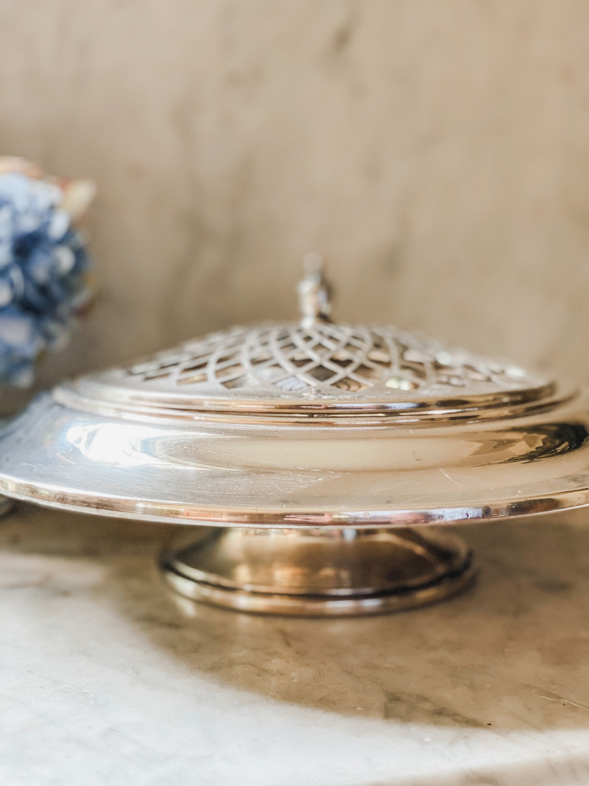 This is a flower frog! What is a flower frog? It is something made to hold or arrange flowers. This one, made by Academy Silver, is a silver plate bowl that sits elegantly on a pedestal. There is a reticulated pierced lid that fits on top with a spider web like pattern which is how the flowers are inserted and held. The bowl holds the water. What an unusual and unique presentation piece, either with or without the flowers! There are some tarnish marks to the silver I was unable to remove. It is 12" w x 5" tall.