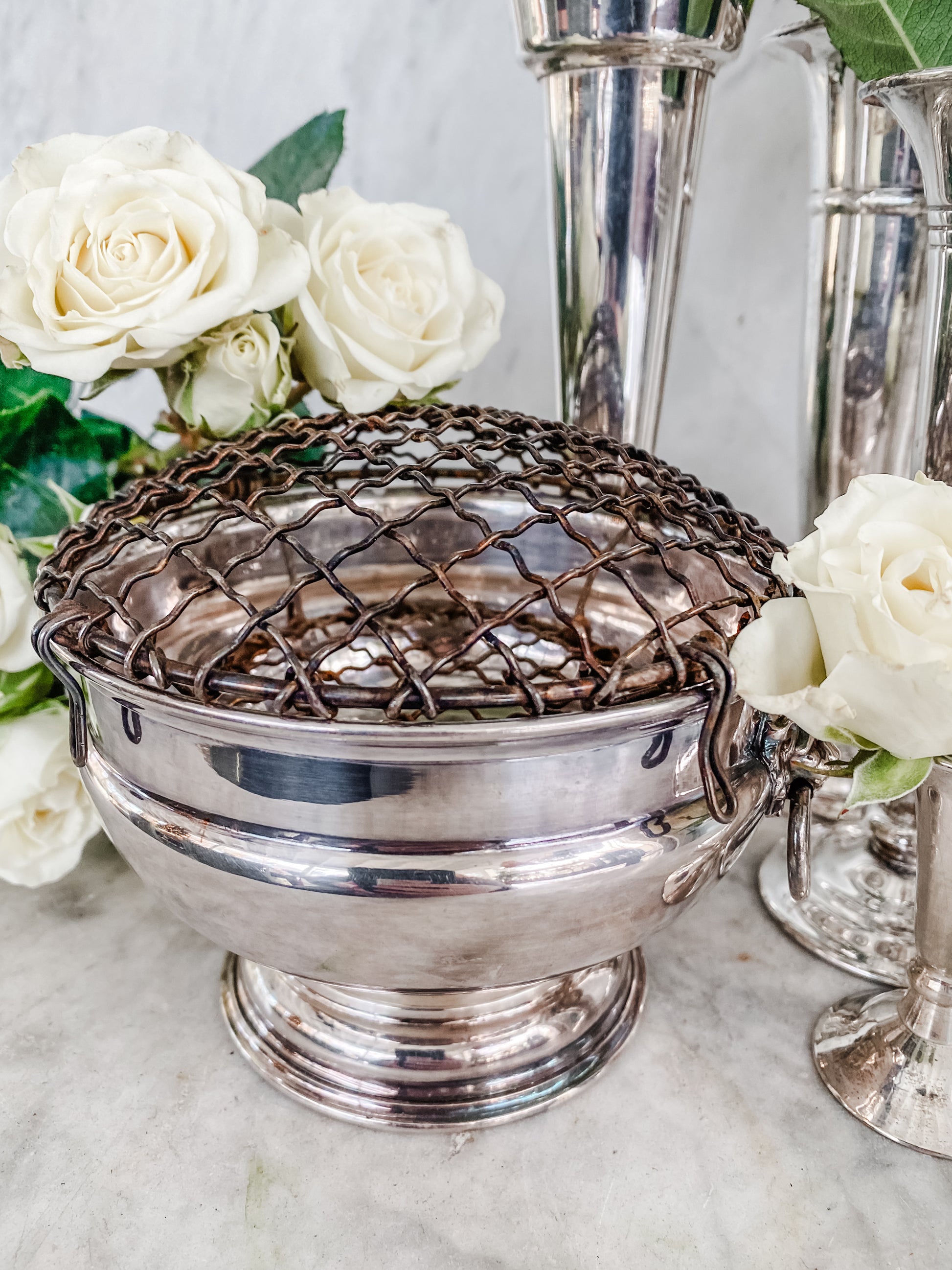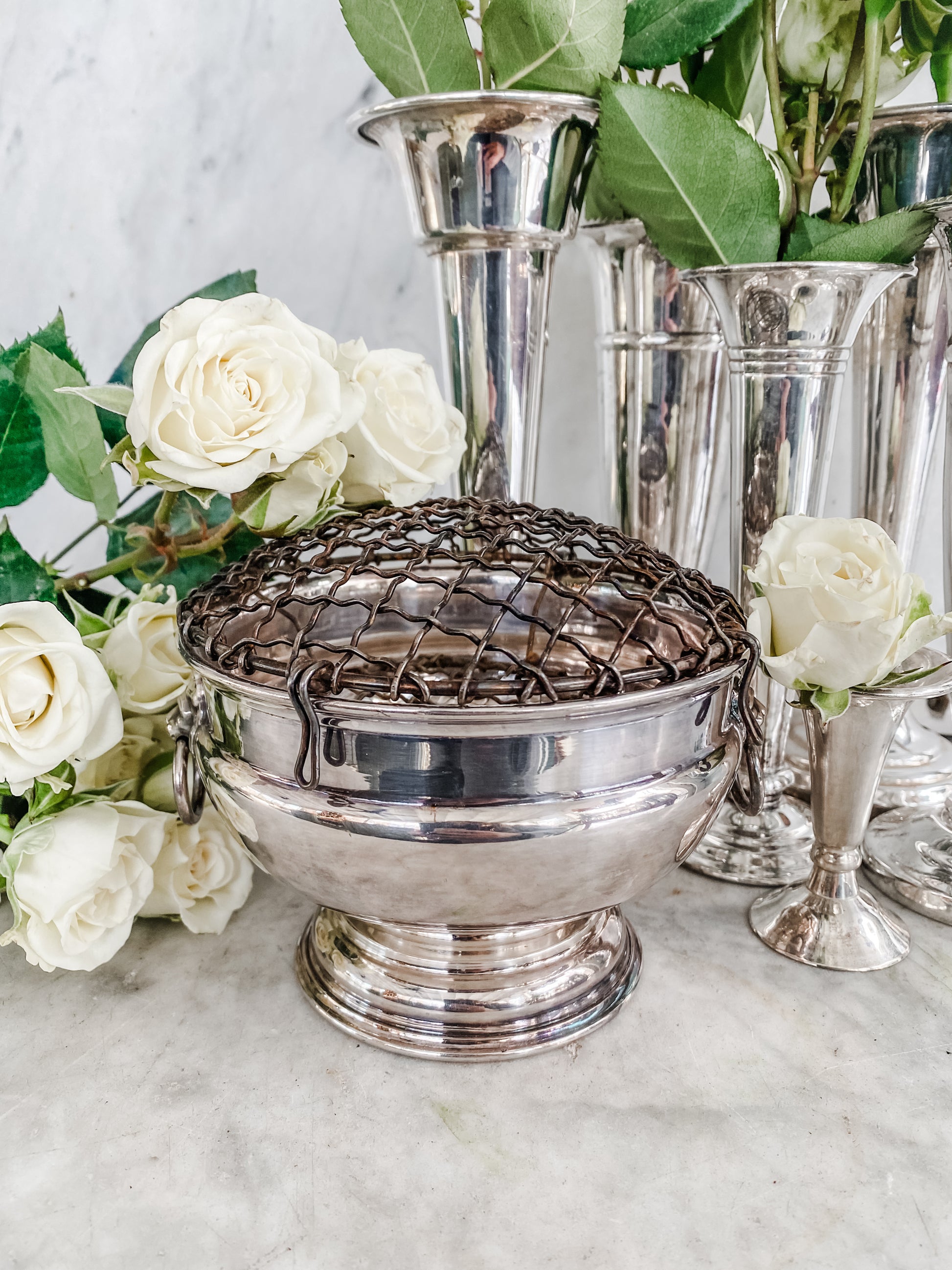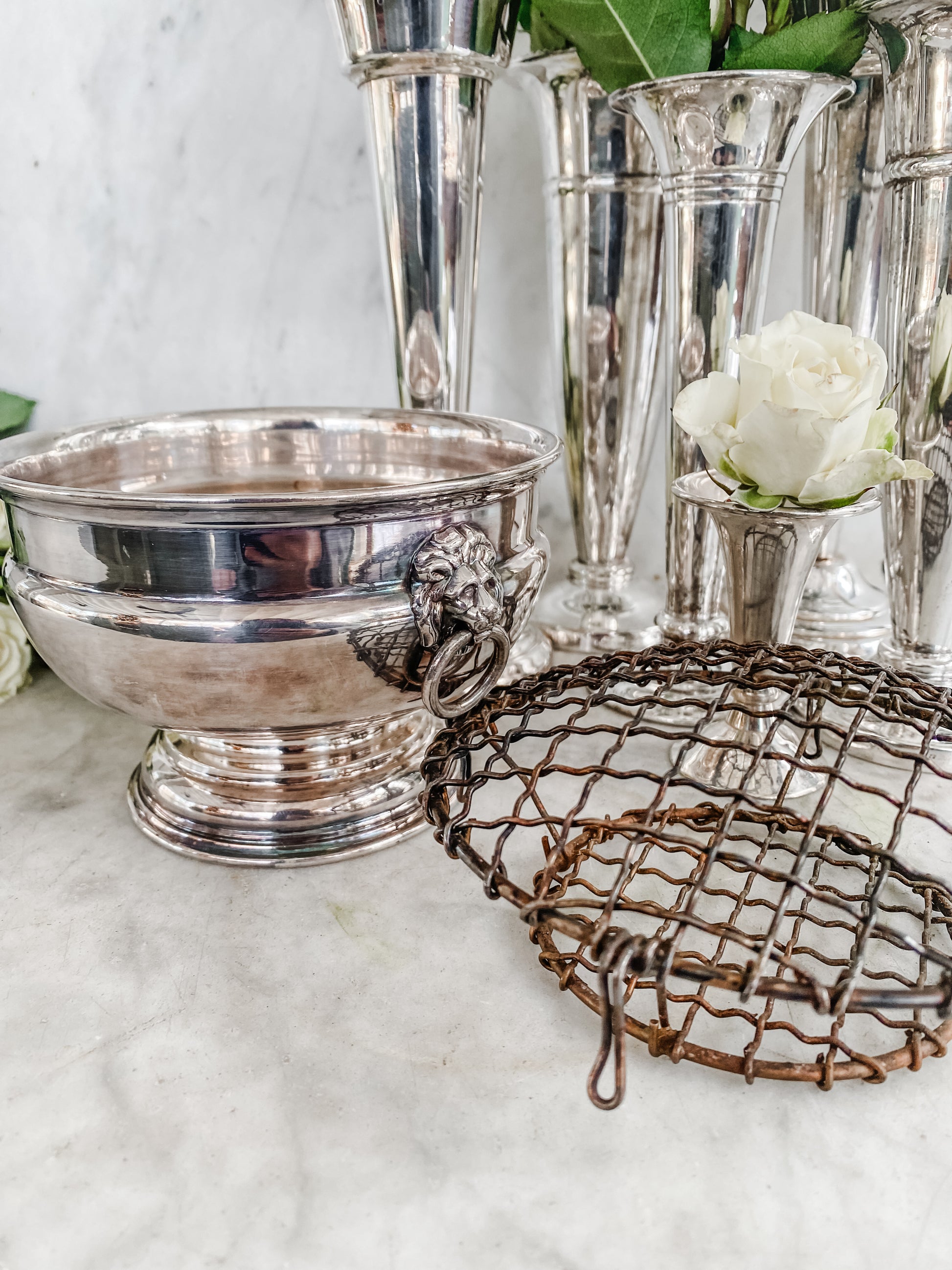 This charming flower frog is a reproduction of Old Sheffield Plate, crafted in Sheffield, England. A highly desirable piece, it features an elegant pedestal base adorned with lion ring handles, adding a touch of classic sophistication. The removable top insert fits securely, allowing you to create stunning floral arrangements with ease.