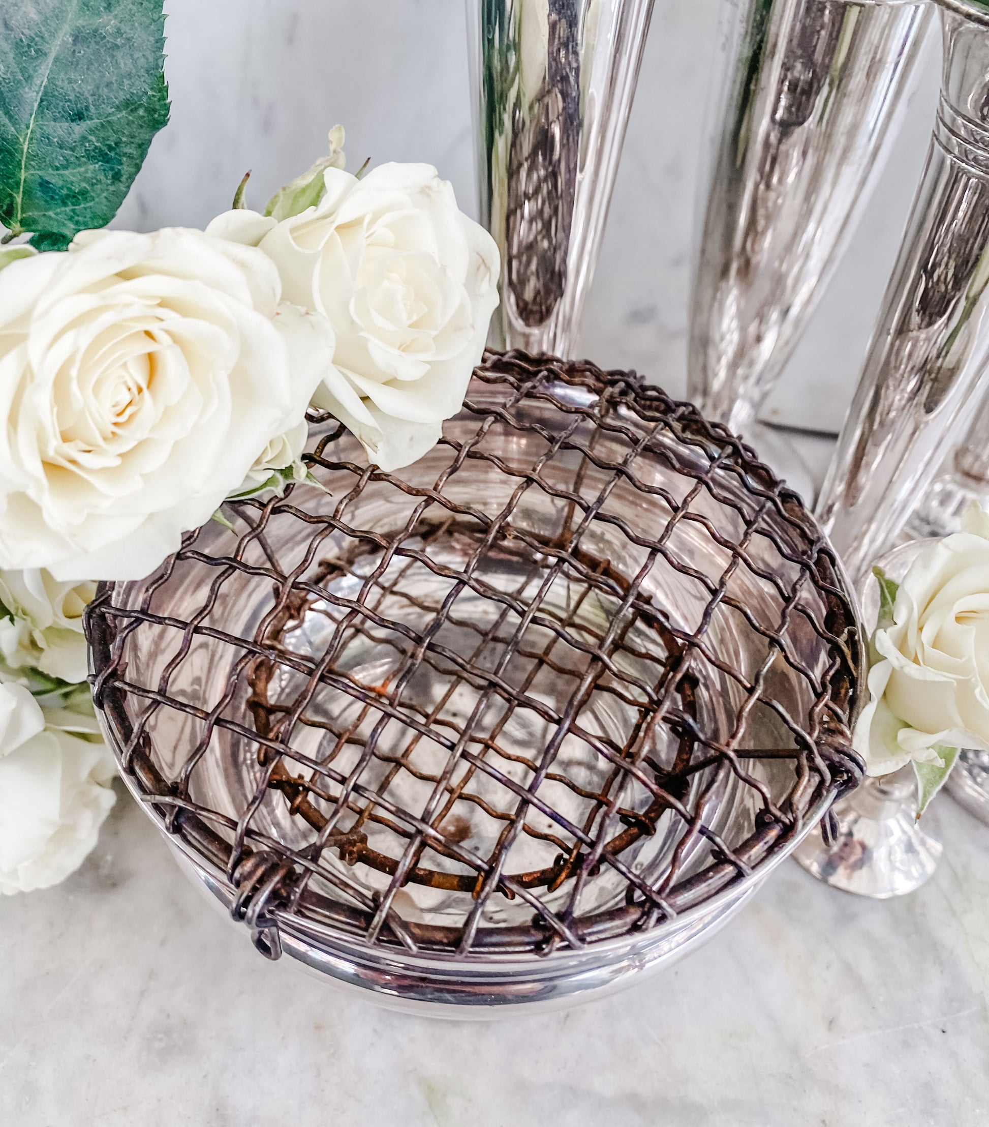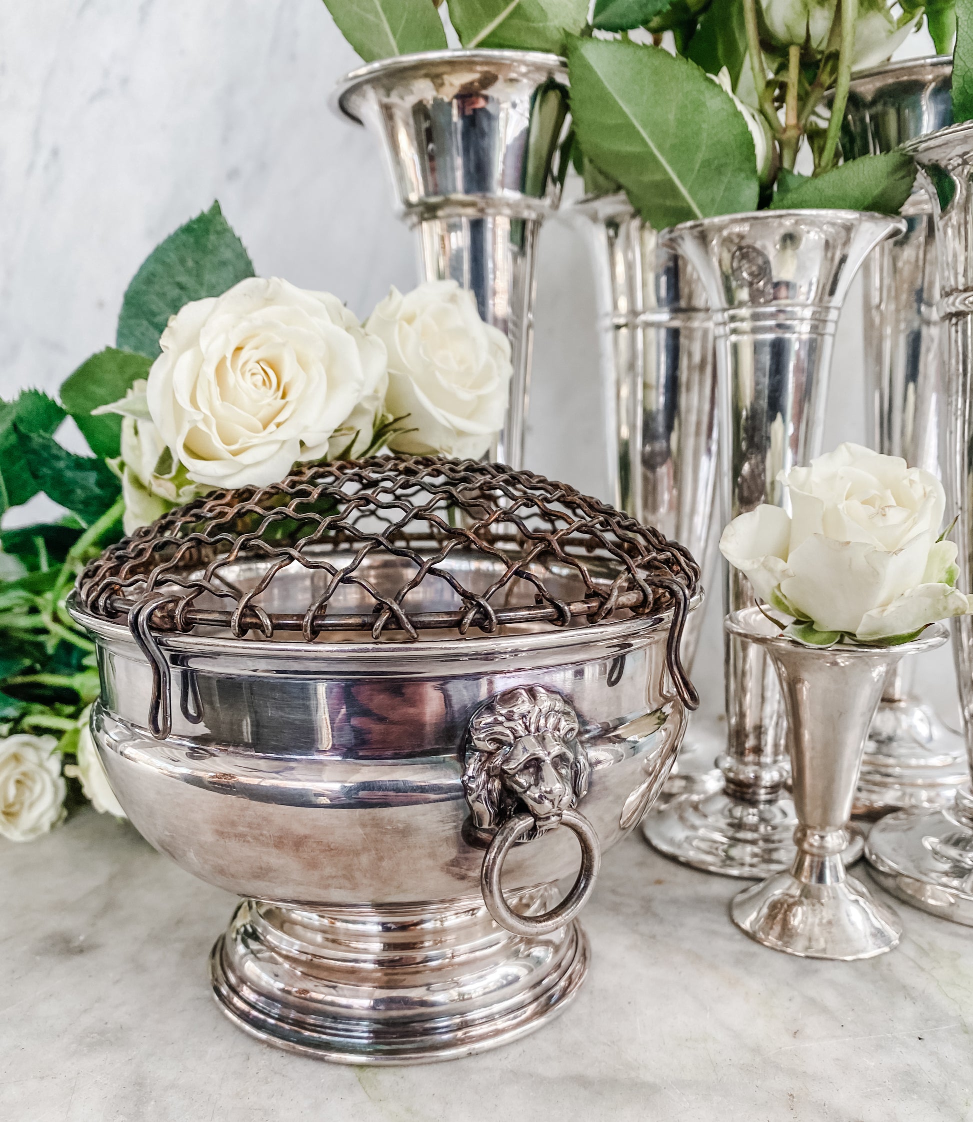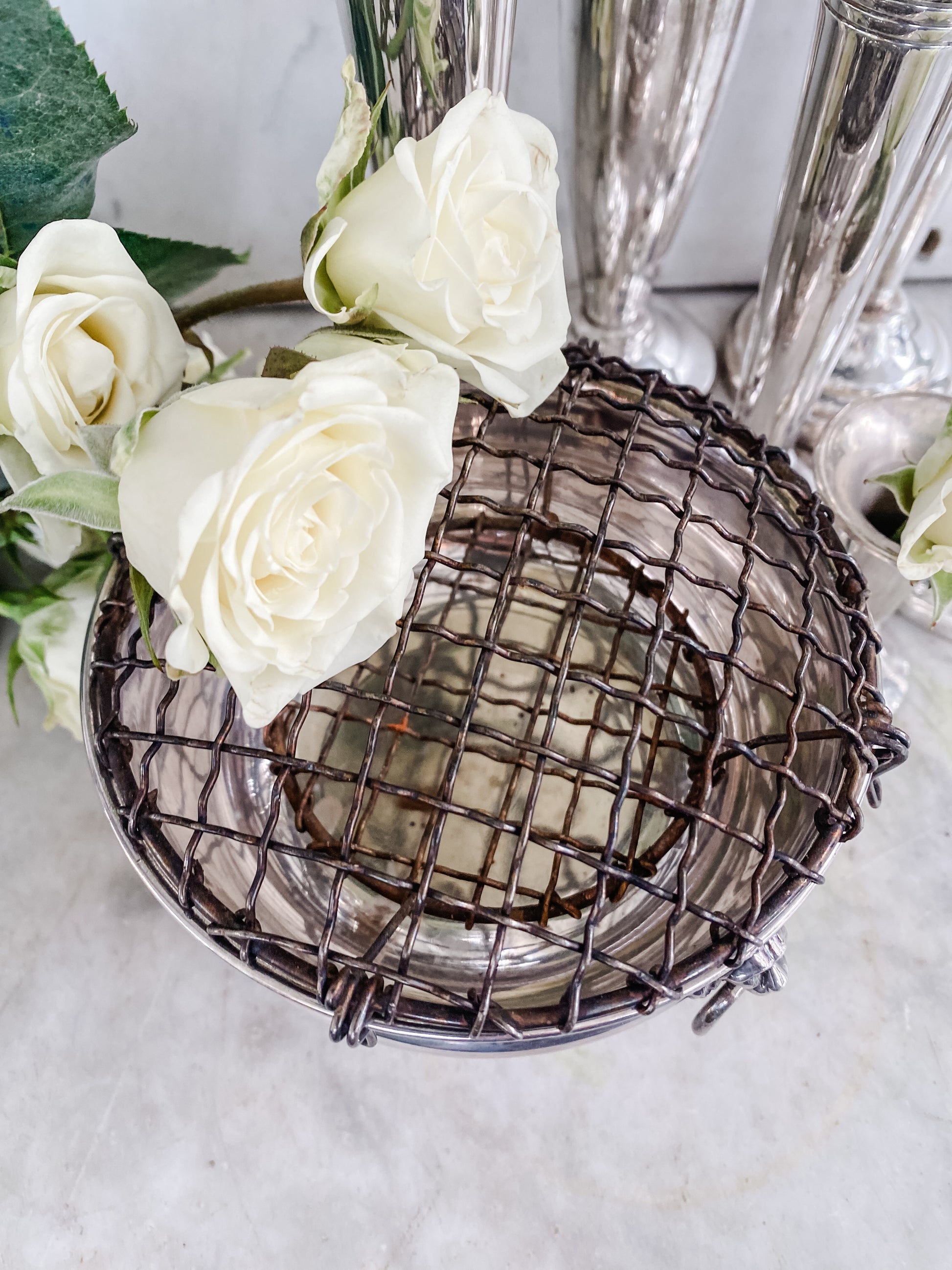 This charming flower frog is a reproduction of Old Sheffield Plate, crafted in Sheffield, England. A highly desirable piece, it features an elegant pedestal base adorned with lion ring handles, adding a touch of classic sophistication. The removable top insert fits securely, allowing you to create stunning floral arrangements with ease.