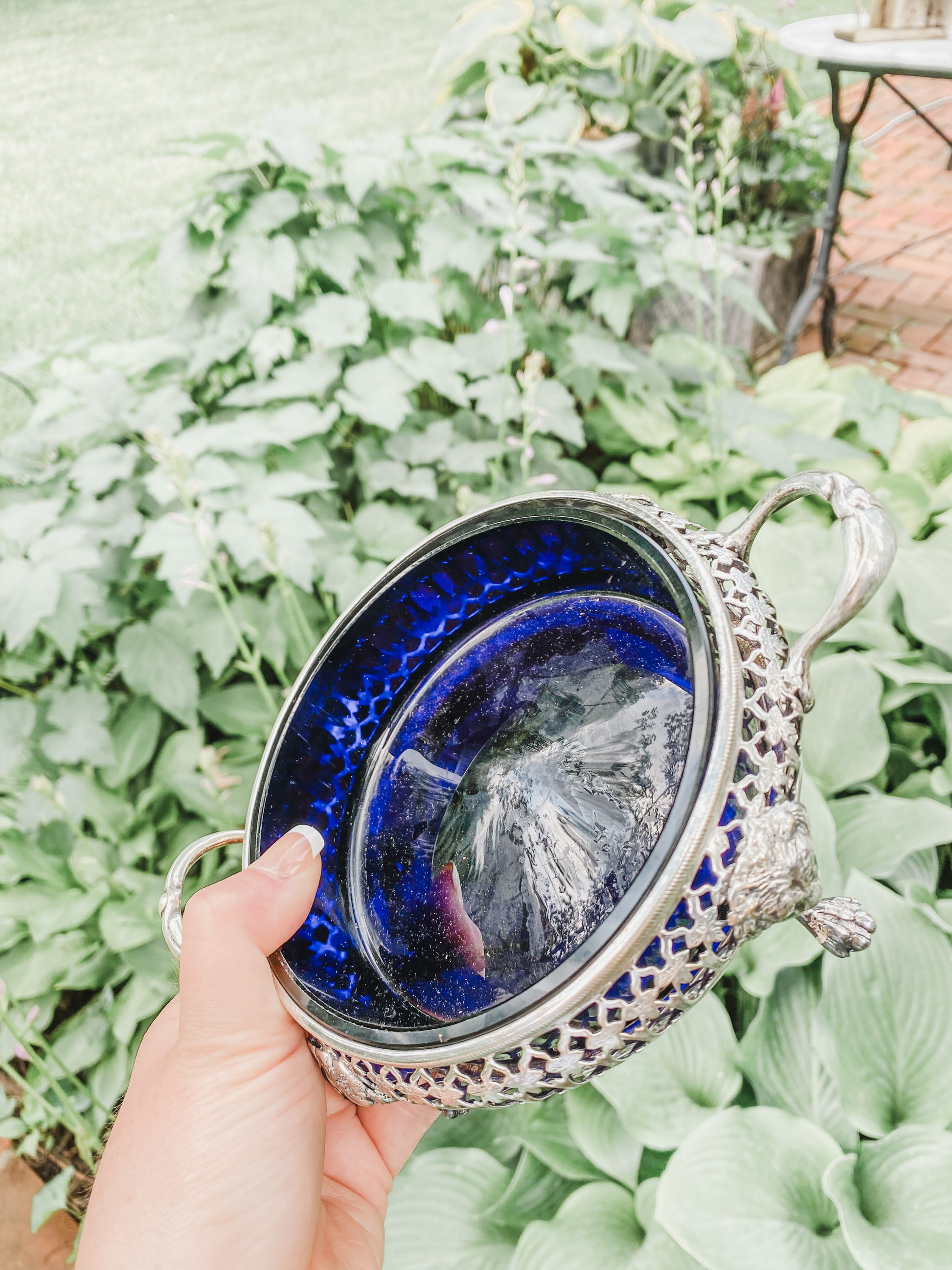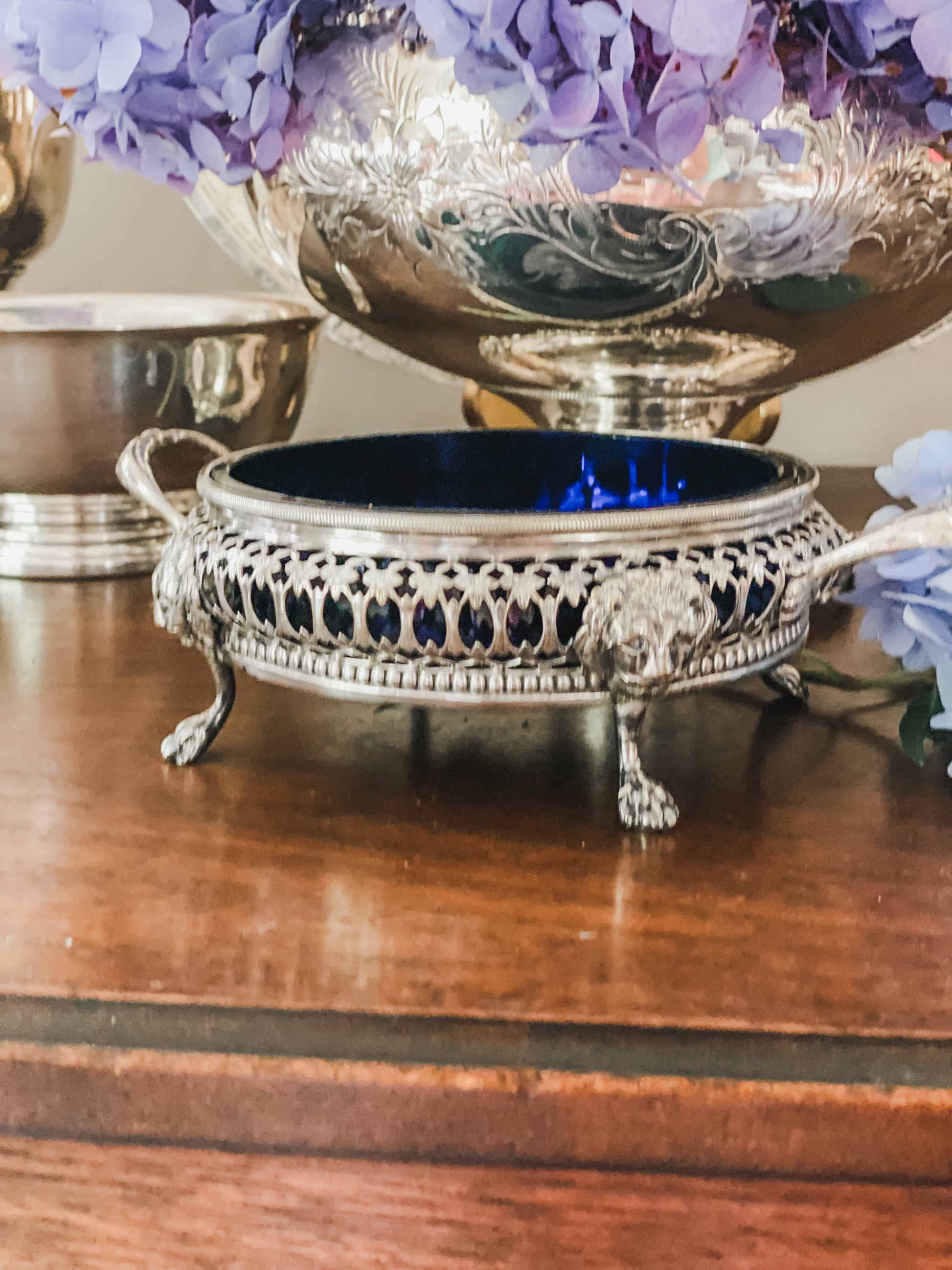 Fabulous antique silver plate stand with remarkable lion head accents with lion paw feet. All of this to hold an antique cobalt blue glass bowl. Notice the fabulously detailed pierced and reticulated designs on the sides of the tray, including the egg and dart bottom trim and the rope edging on top as well as ornate handles. What a show piece for your buffet or as a decorative accent for your shelf or end table. 8" x 5.75"