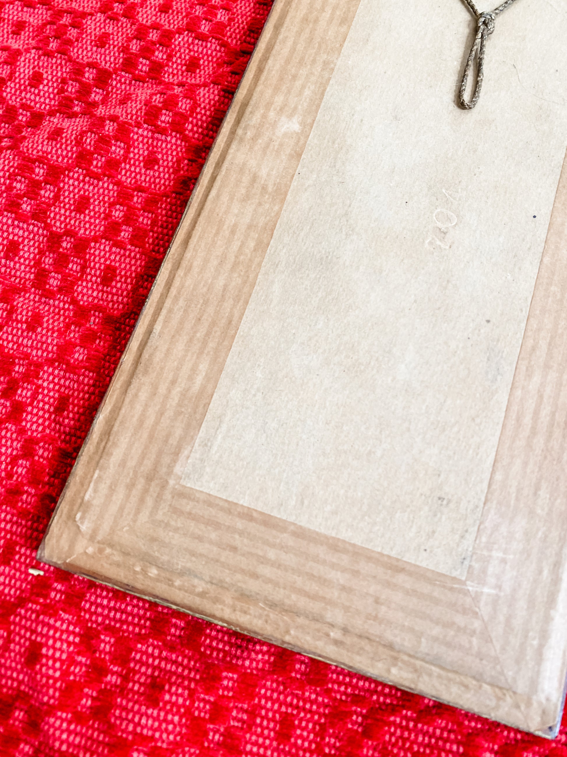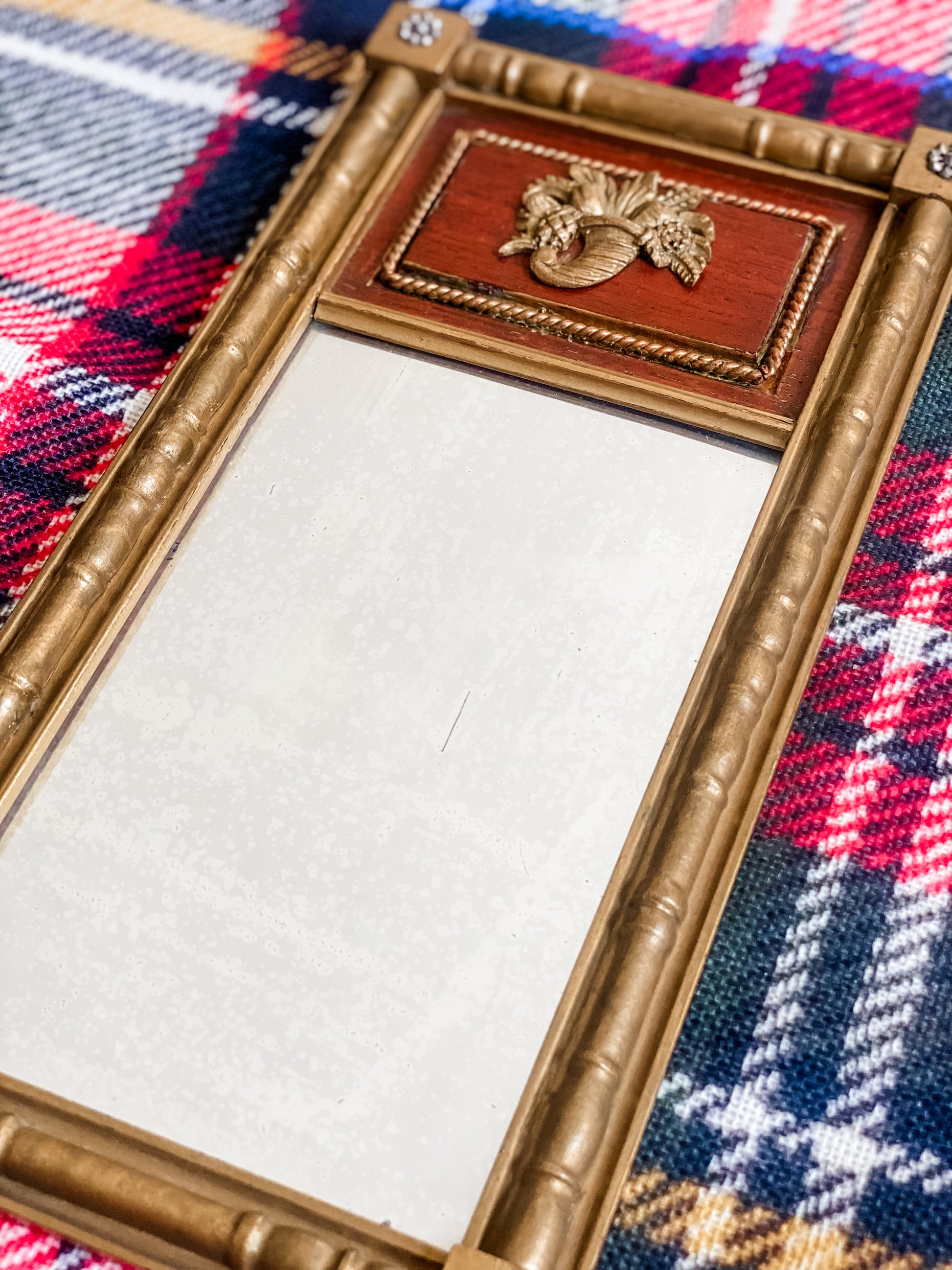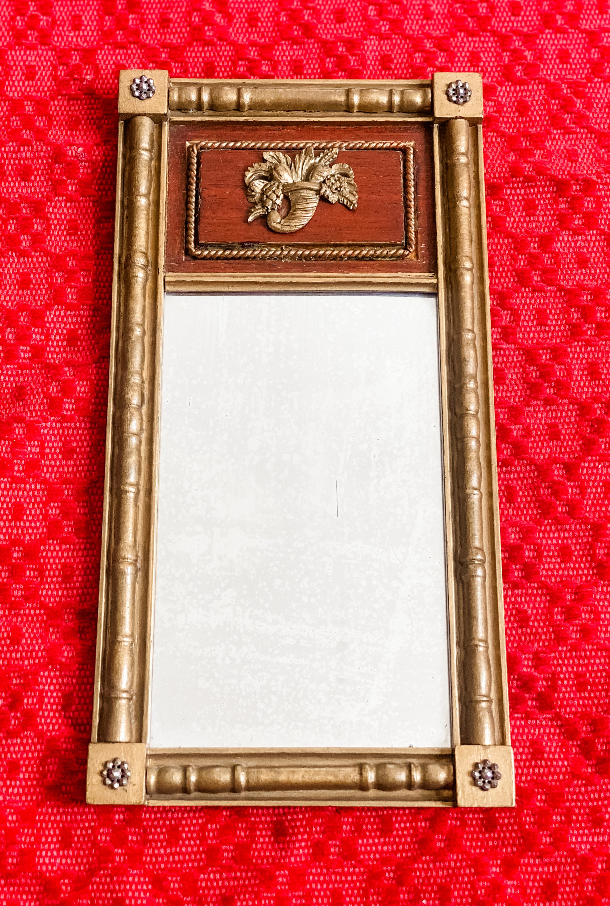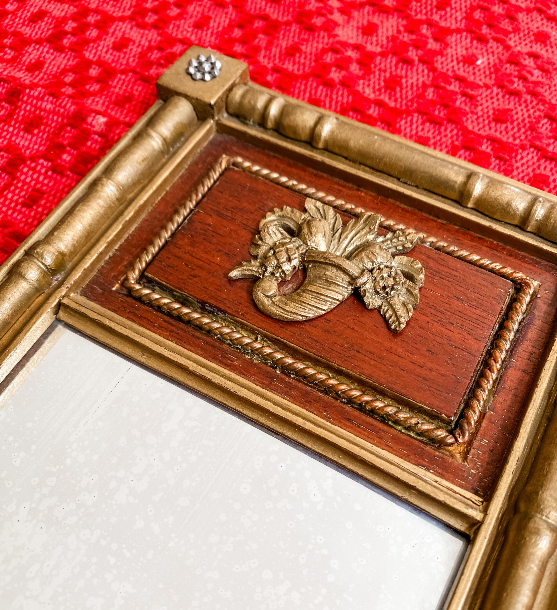 Here is a delightful little mirror! A little carved wooden cornucopia adorns the top center of the mirror, and it is surrounded by a twisted barley style roping. I love to use mirrors like this in unexpected way in my home. 10.25" x 5.25"
