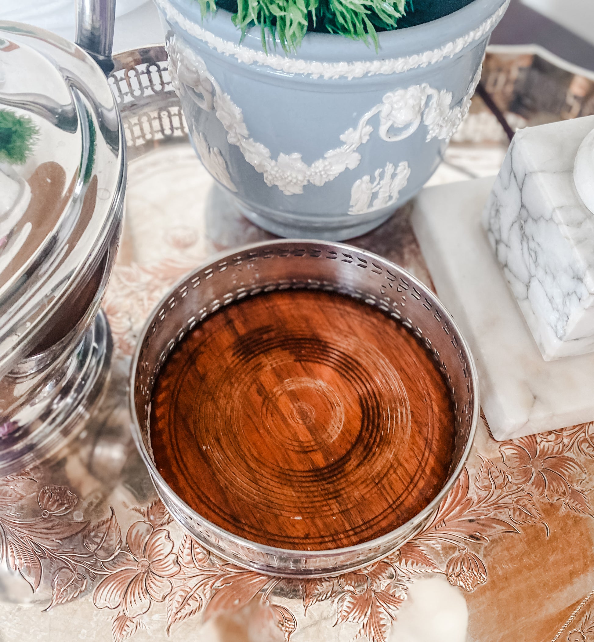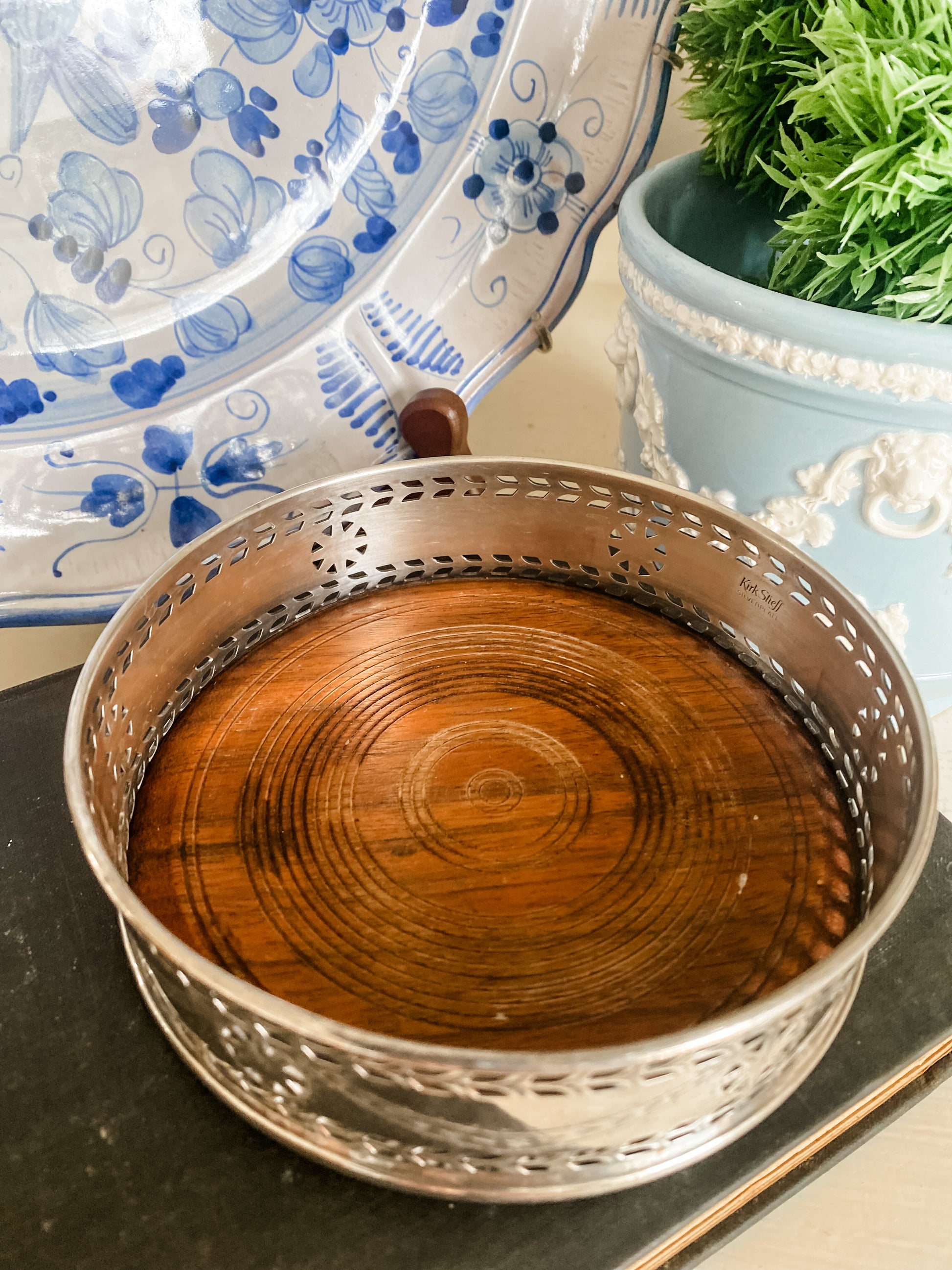 A beautiful piece from one of America’s most respected silver names—this silverplate wine bottle coaster by Kirk Stieff is 5” wide and features a classic wooden insert for your bottle to rest on. The edge is dressed with a sweet bunting detail.