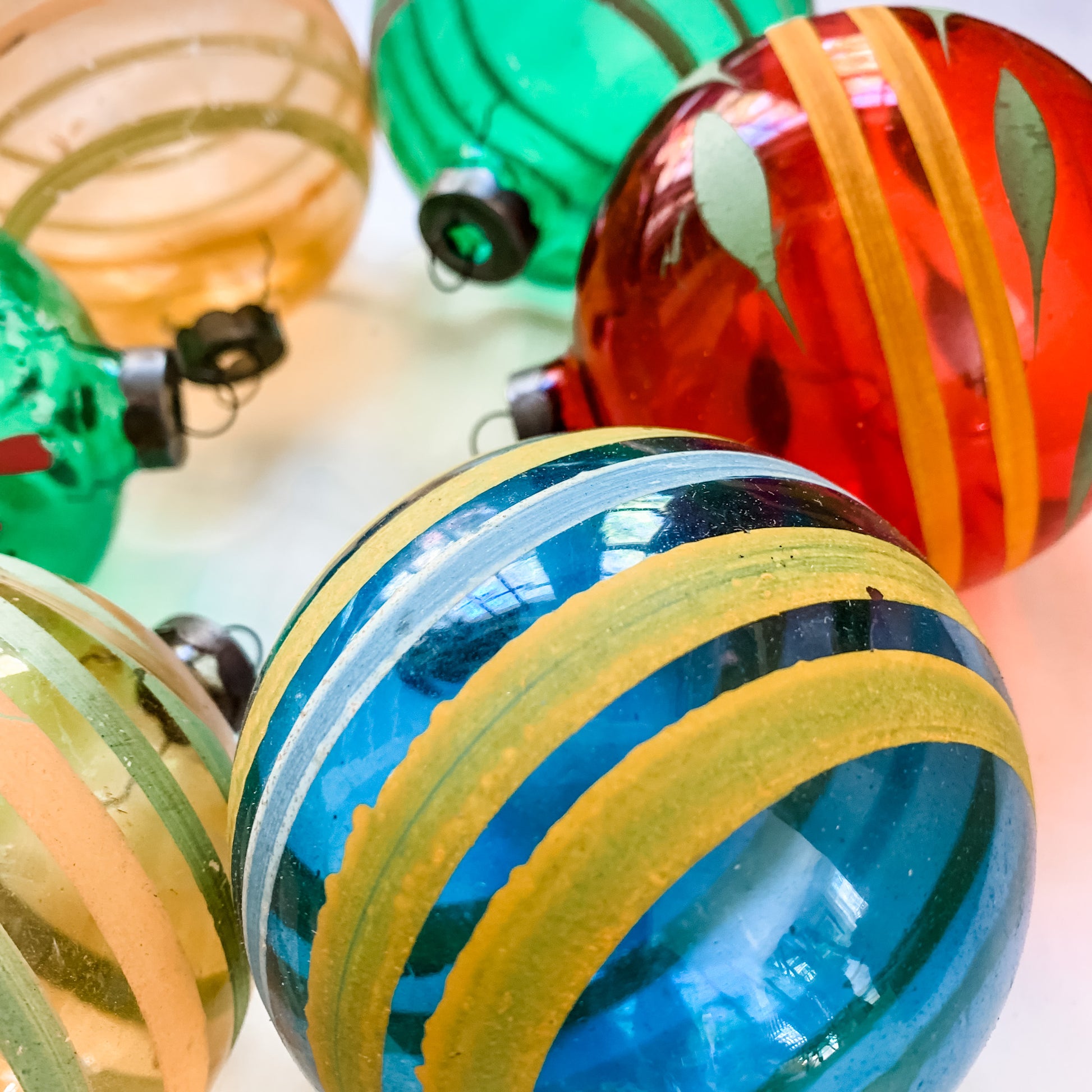 Large (5"!!) antique hand blown translucent glass Christmas ornaments are hand painted in traditional colors. Very impressive works of art! You can easily imagine the glow created on your tree when these beauties are lit from behind with your light strands.