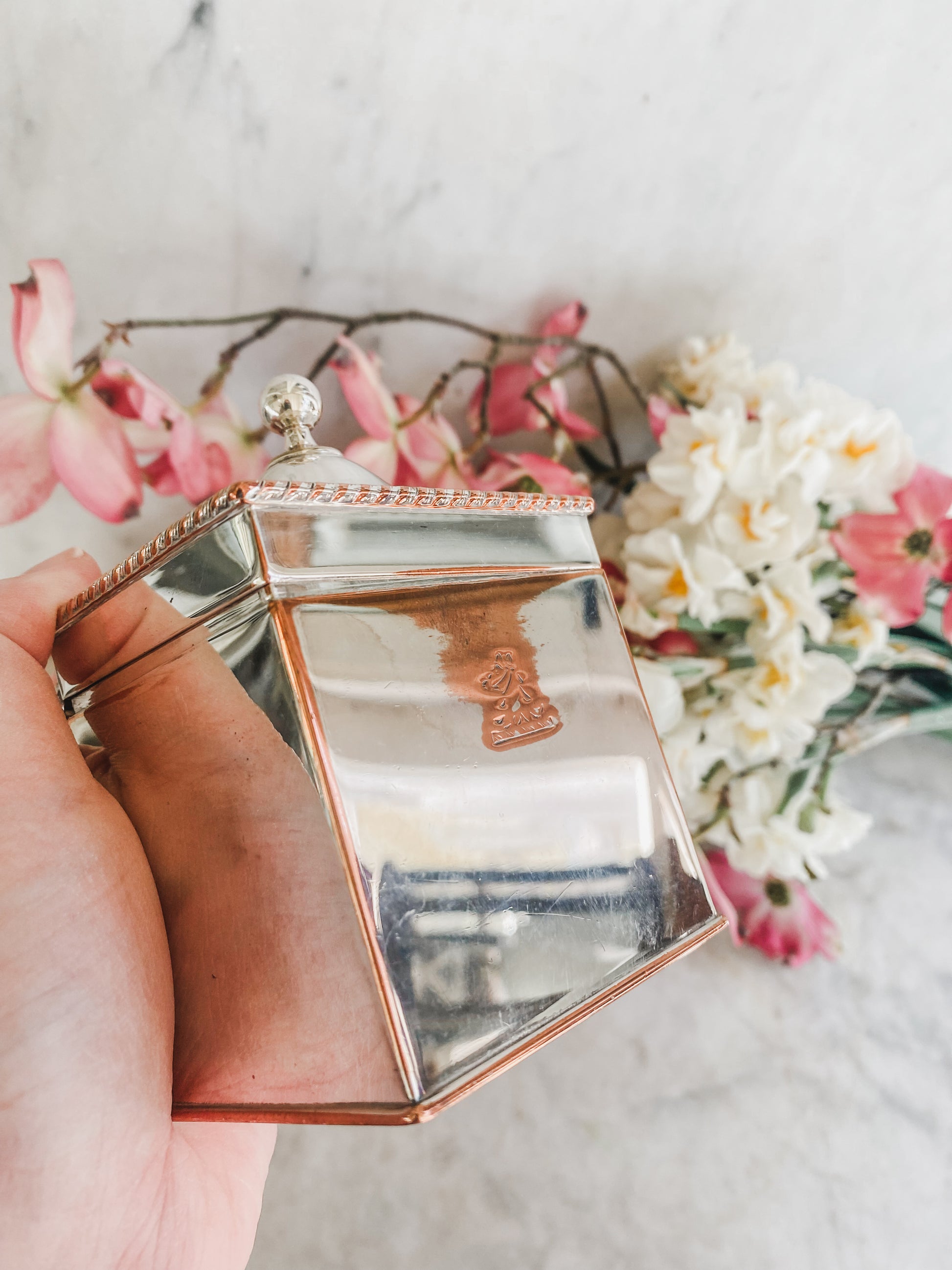This little box is so beautiful in person. The silver is almost like a mirror—gorgeously glossy—and when you catch it in the right light, that soft copper glow peeks through in just the prettiest way. I’m estimating it’s between 175–200 years old, possibly Old Sheffield Plate based on the construction and wear.