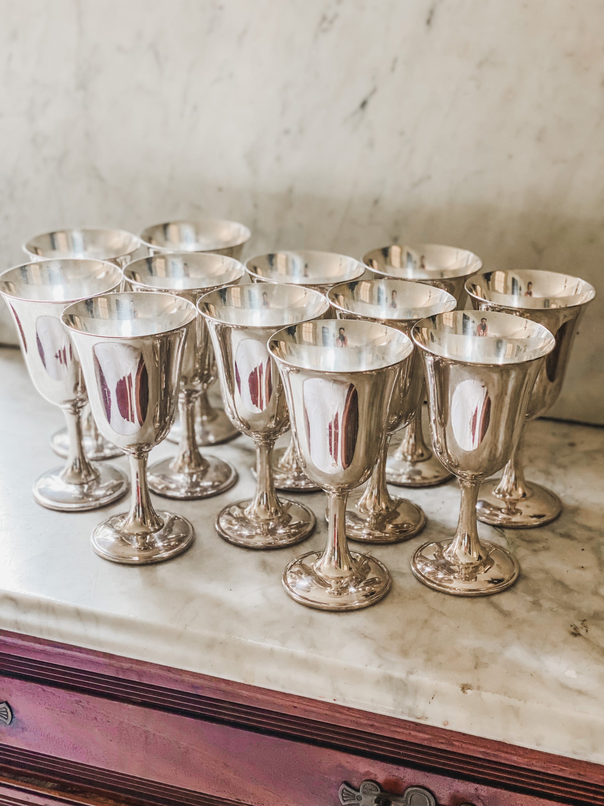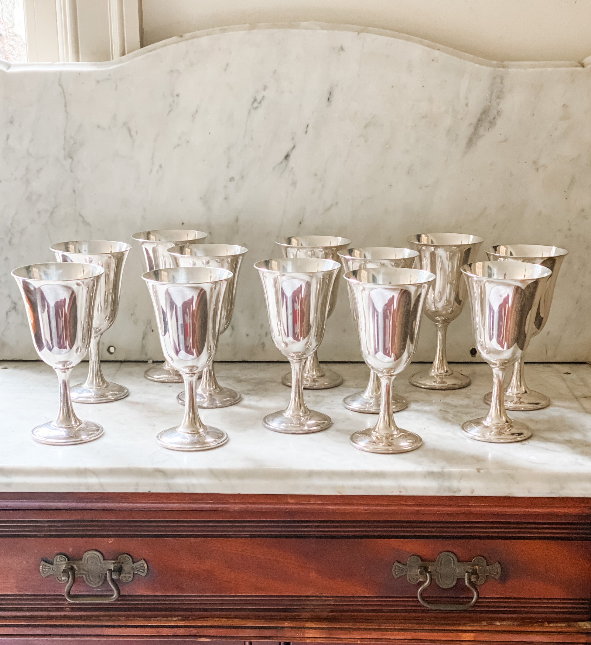 Imagine an entire table set for 12 guests, each place setting with a silver goblet! This is a rare opportunity to attain a complete set of 12 silver plate goblets together. These vintage mid century goblets are very attractive with their slim stems and hour glass shapes. Very good vintage condition inside and out with a monogram on the side. Made by Wallace Silver which started in 1835. Each is 8 " tall.