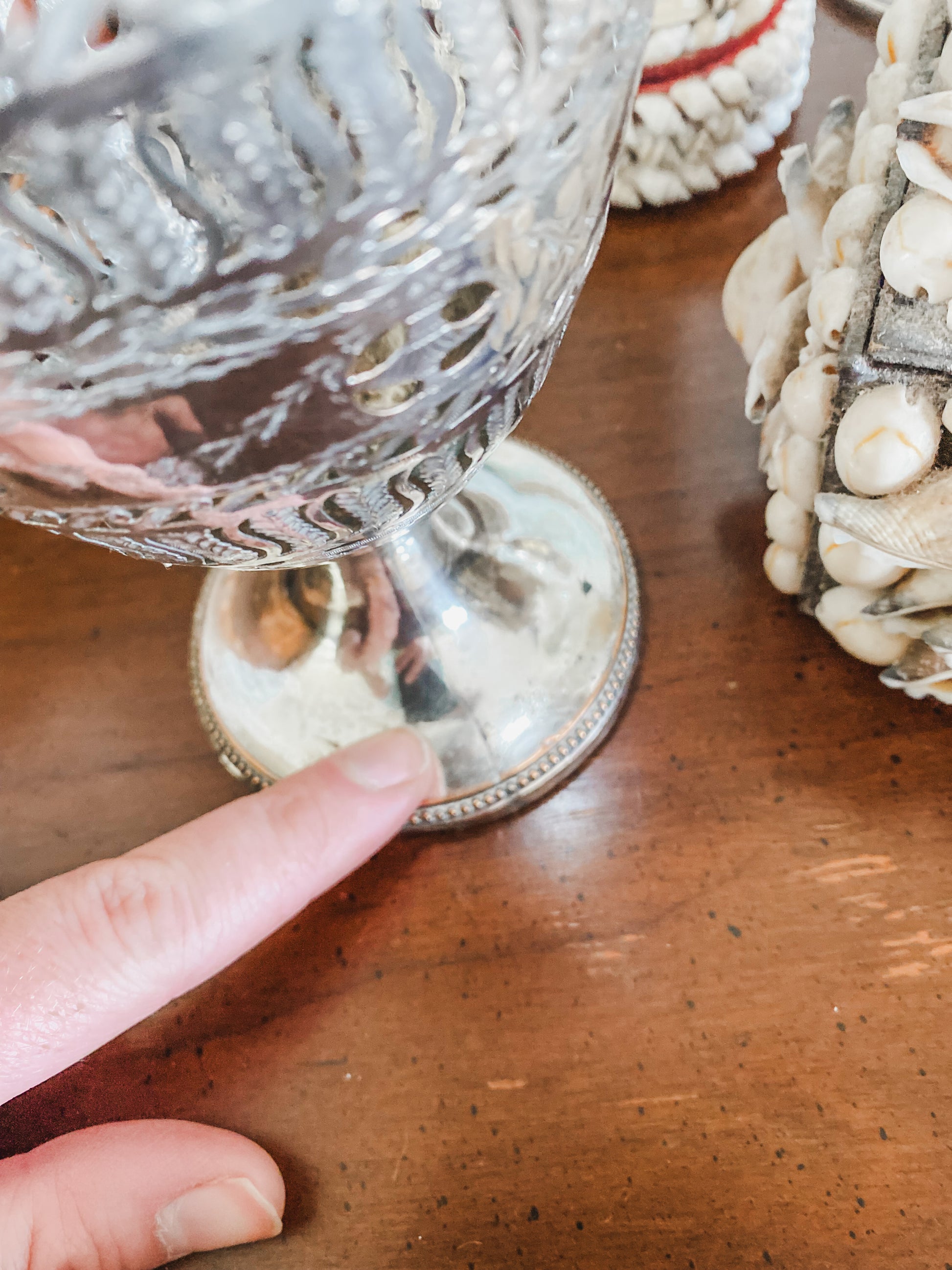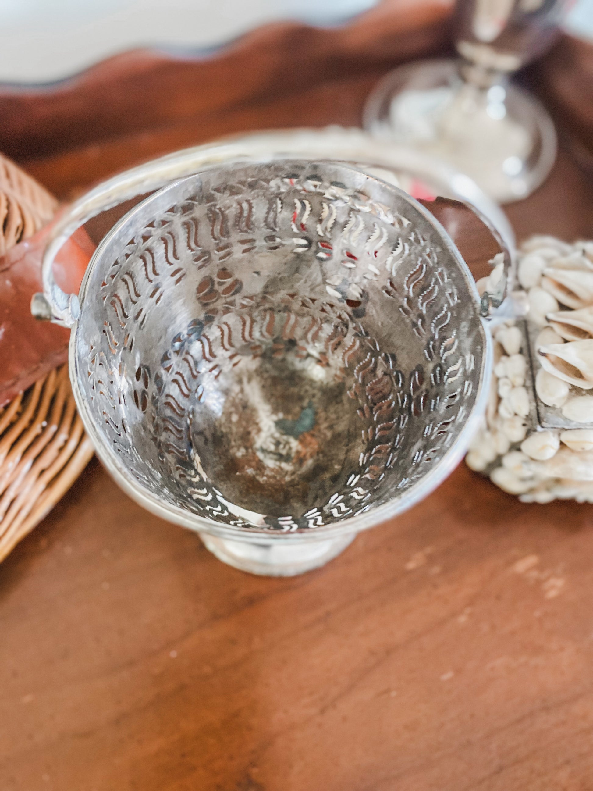 Because of the age, there are some spots where the copper shows through and wear, particularly in the inside (see the photos of the interior basin of the basket, there is wear.) MOST NOTABLY it appears that base has been reattached to the basket portion of this piece using an adhesive and there is a little tear in the pierced edging in one small area, therefore; it is priced accordingly. 7" t x 4" wide.