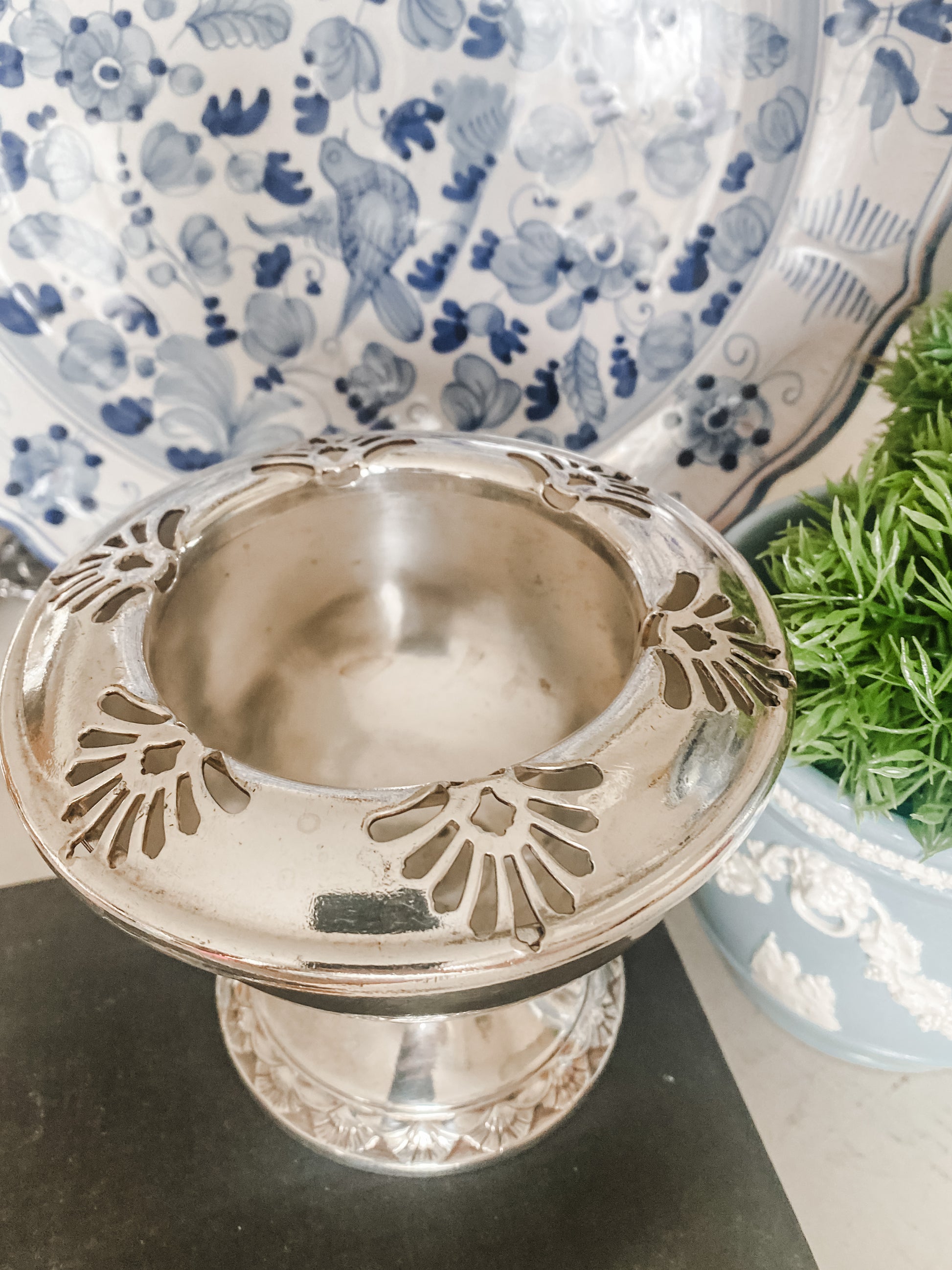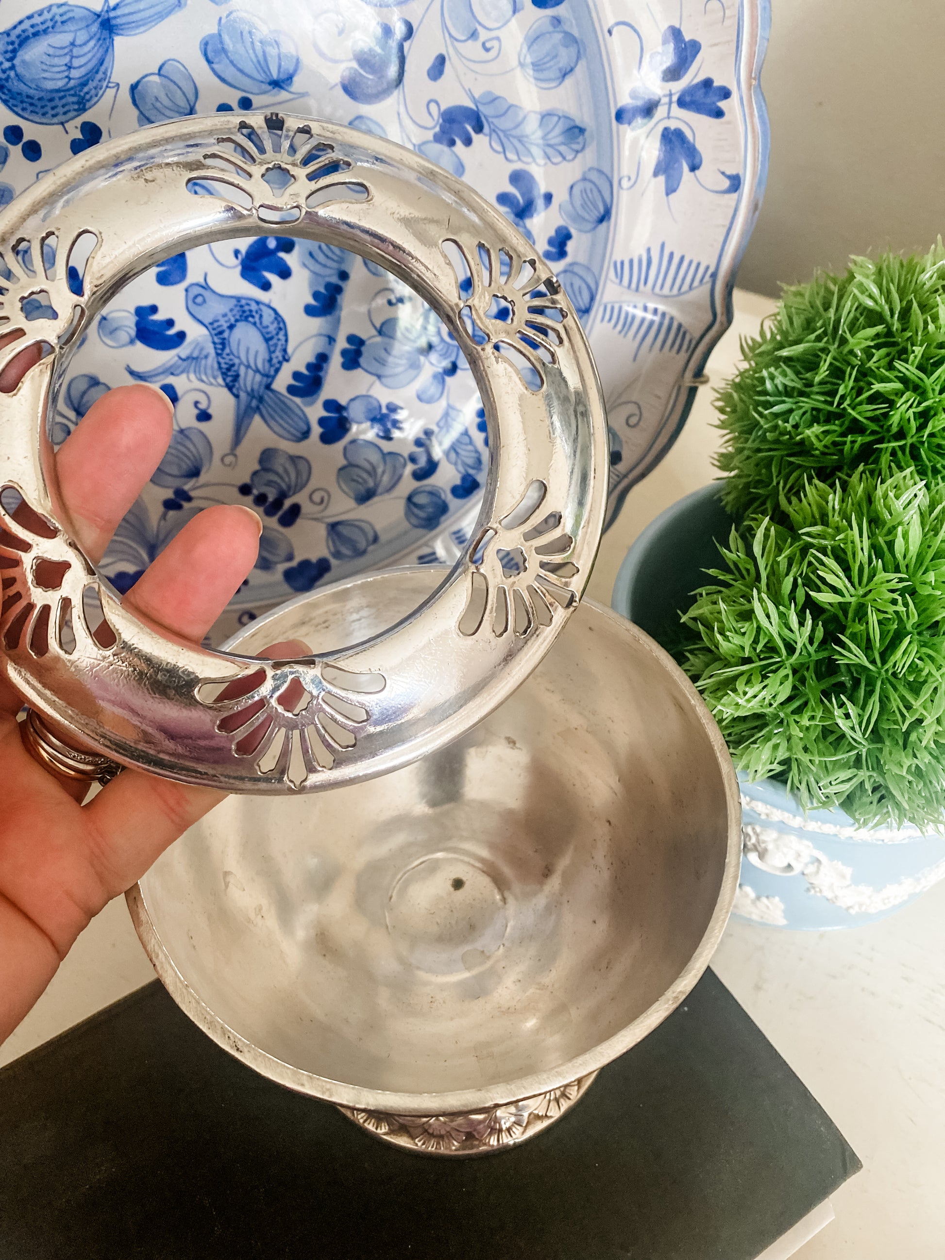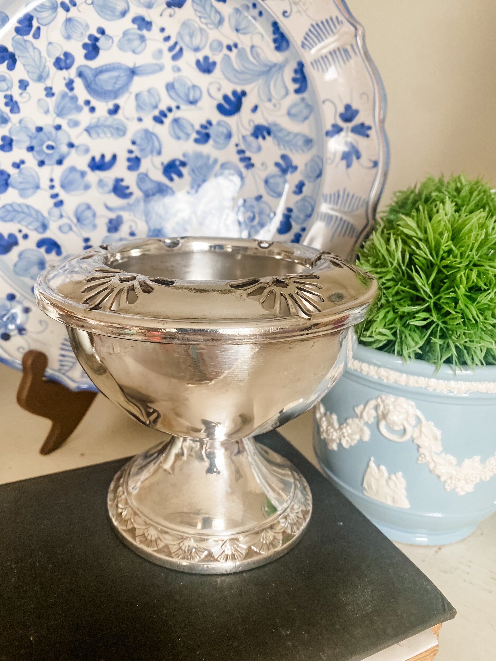 This vintage silverplate flower frog by International Silver is such a fun and functional piece. It has a lovely weight to it and sits on a raised pedestal base. The removable rim allows for easy arranging, and flower stems can be placed right through the center opening.