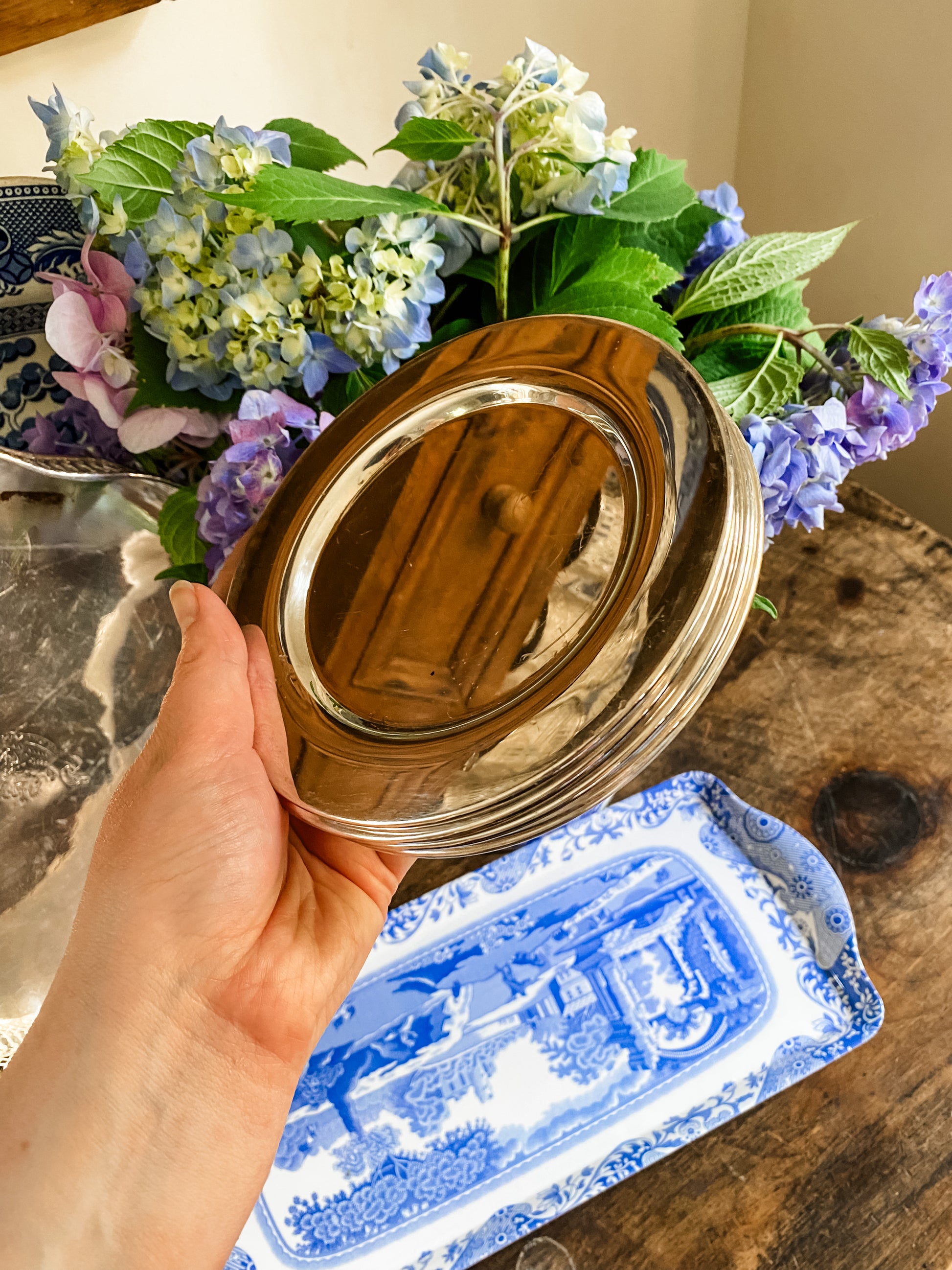 This set contains 6 classic vintage silver plate dishes, perfect for appetizer or dessert plates. Light surface scratches and some wear from use. 6"