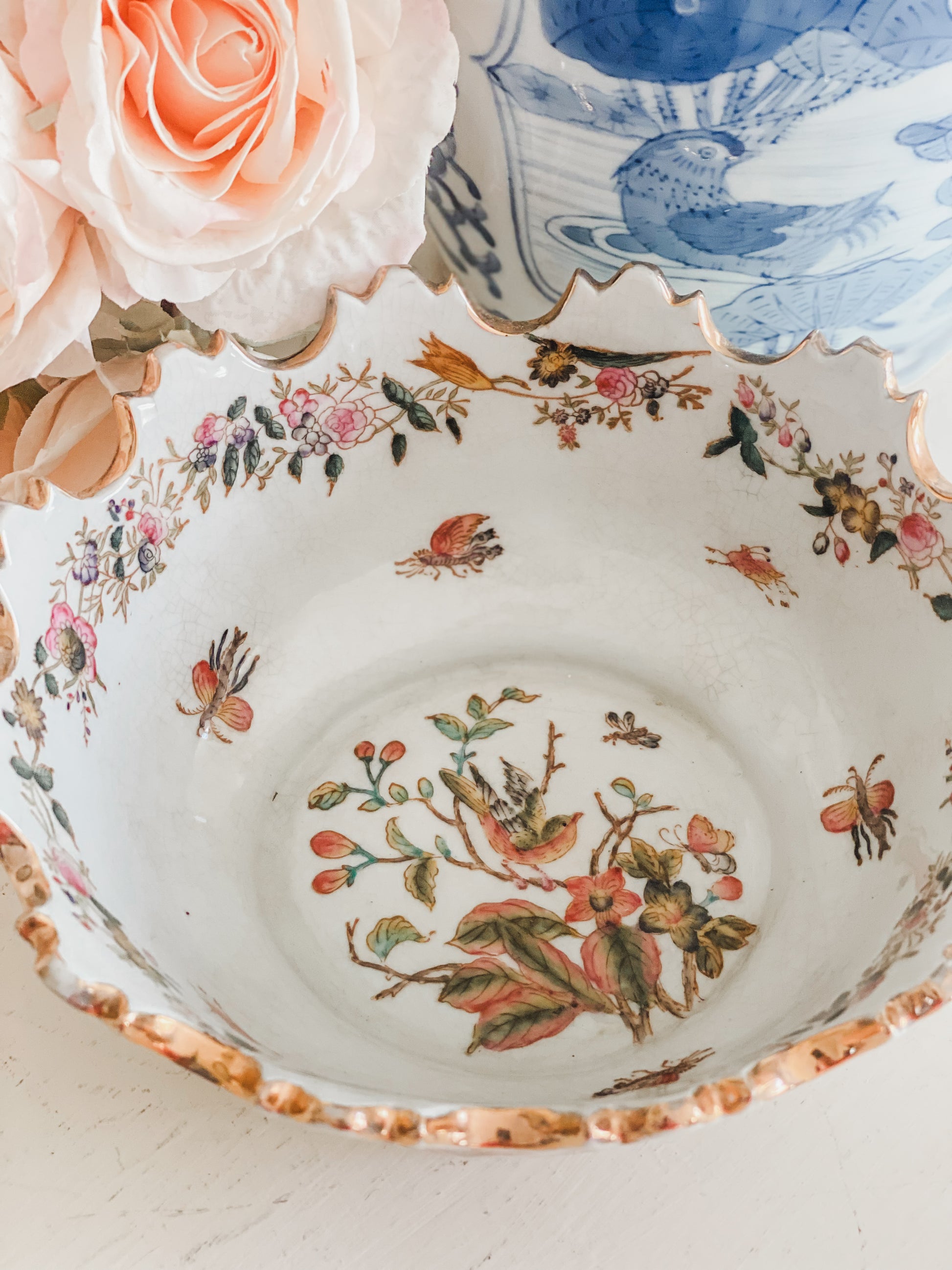 A really beautifully painted bowl. The combination of the birds and flowers creates a harmonious blend of nature and art. Note the detailed edge painted in gold 7.5” x 7.5” x 3.5”