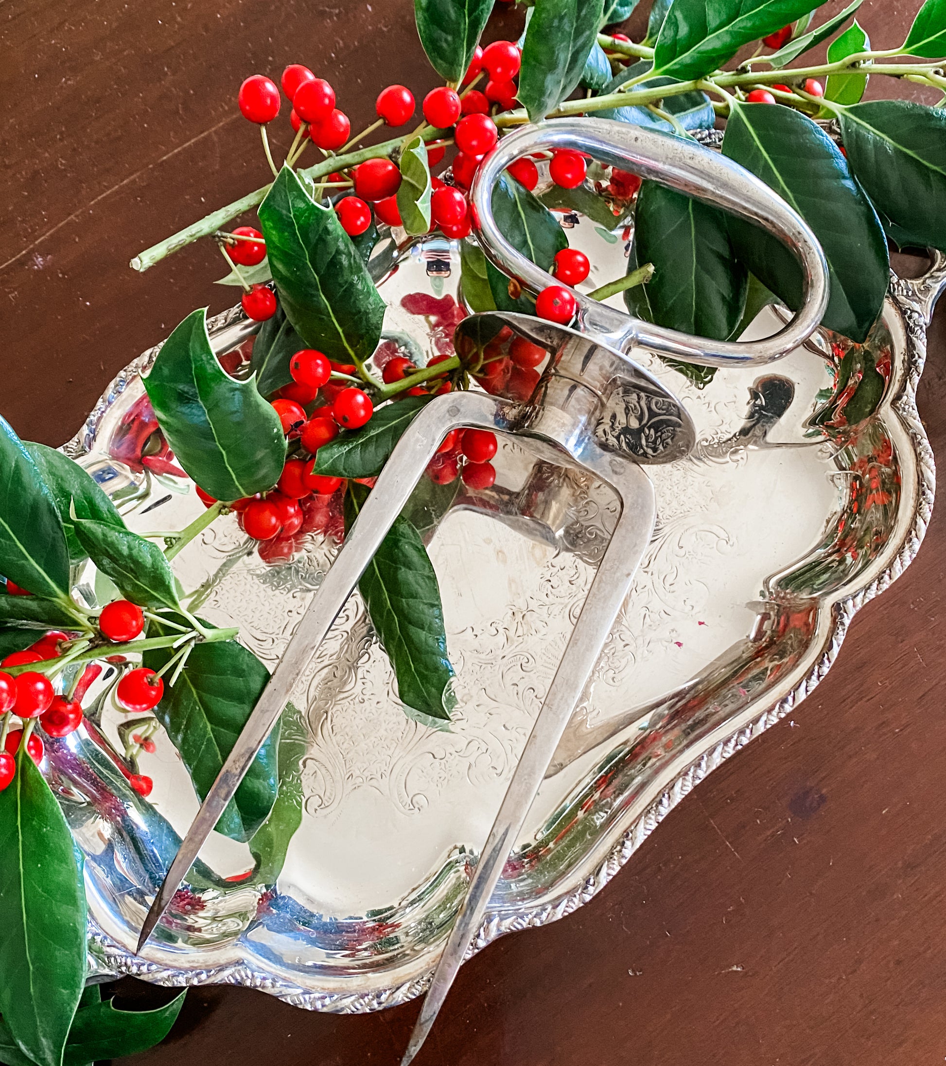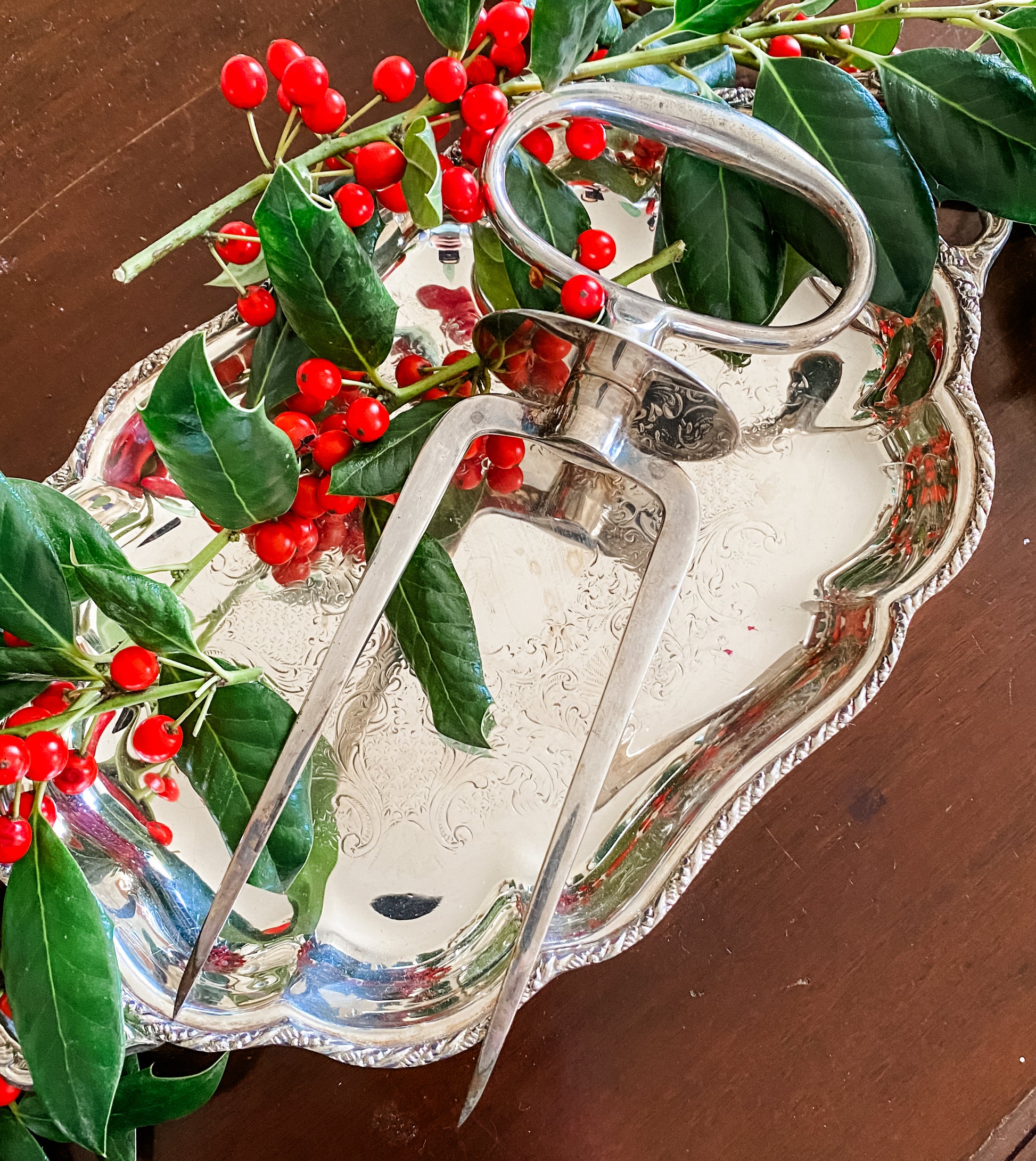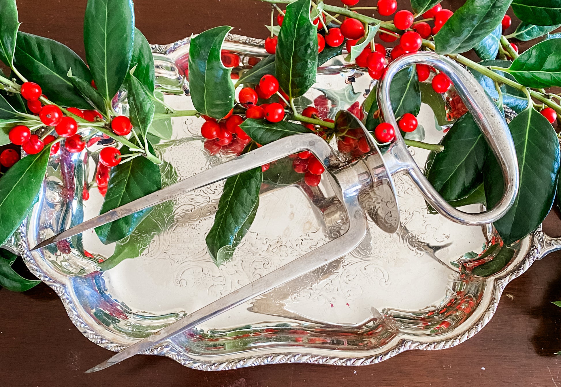 An elegant handled meat carving holder is a most for carving meat at your holiday table! Here is a silverplated beauty! 8.75" long. Very good condition. Silverplate