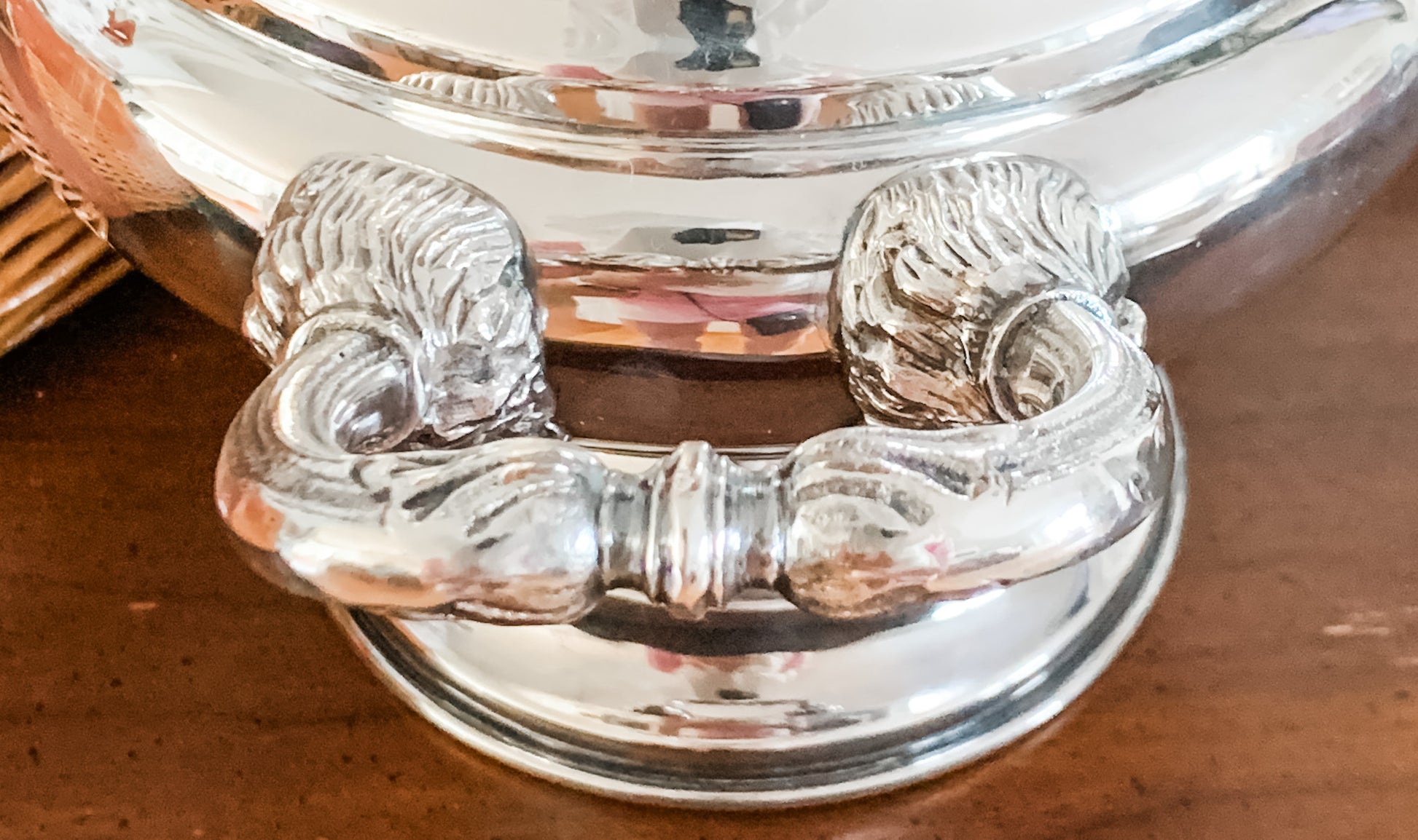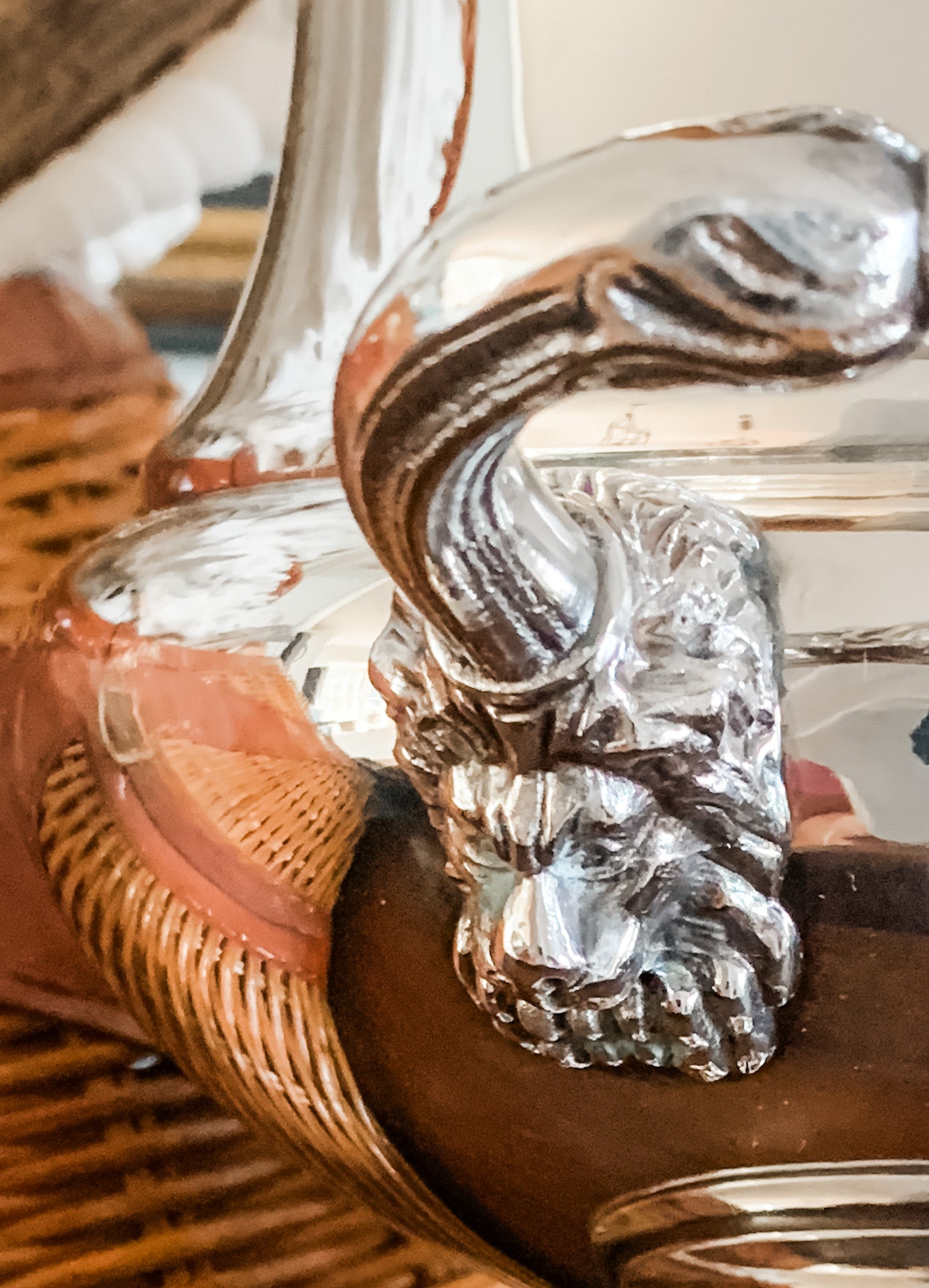 This vintage champagne bucket is simply gorgeous and of exceptional quality. Its elegant classic shape, adorned with a rope edge, reflects timeless charm. The interior has a removable cylinder which can make the bucket smaller and or hold ice below it. This collectible piece is engraved with intricate details of the USS Duncan's commander from the 1960s, adding historical significance. The gleaming silver plated bucket is impressively heavy, highlighting its robust craftsmanship, and is in excellent condition! Double lion head mounts gracefully hold the detailed handles, completing this exquisite champagne bucket, perfect for adding a touch of sophistication to any occasion! Made by the Hecworth Silver Co. as a Reproduction to Old Sheffield Plate. 10" tall x 10 x 9