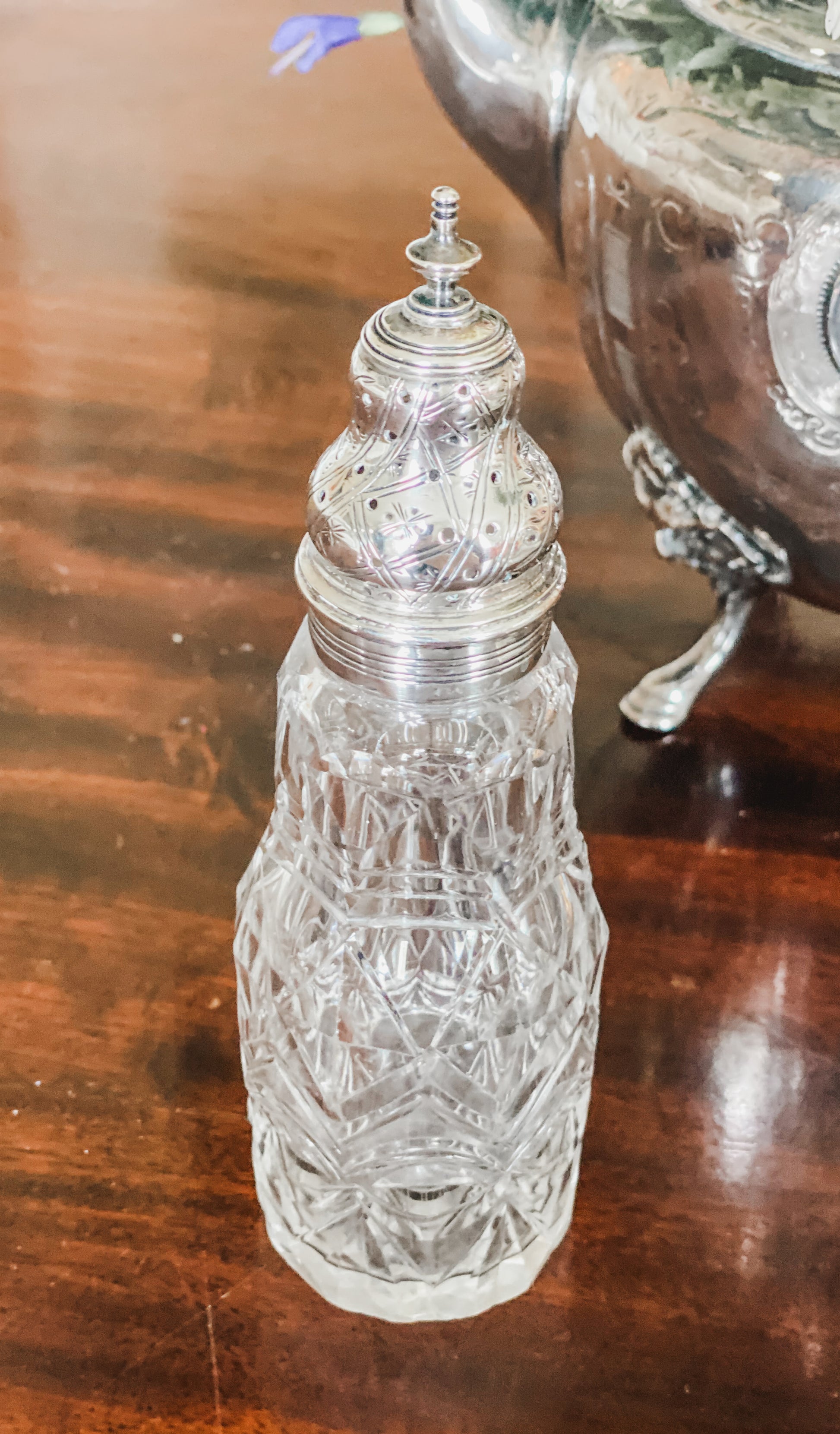 This intricate antique caster is just so pretty! The intricate design in the glass is so enchanting. Made by Wallace and sons, this Victorian piece even has an incredibly intricate design on the silverplated lid. I always have a muffineer or caster like this on hand for powdered sugar when I have a hot chocolate bar set up around Christmas time. Lovely piece! 7" tall.